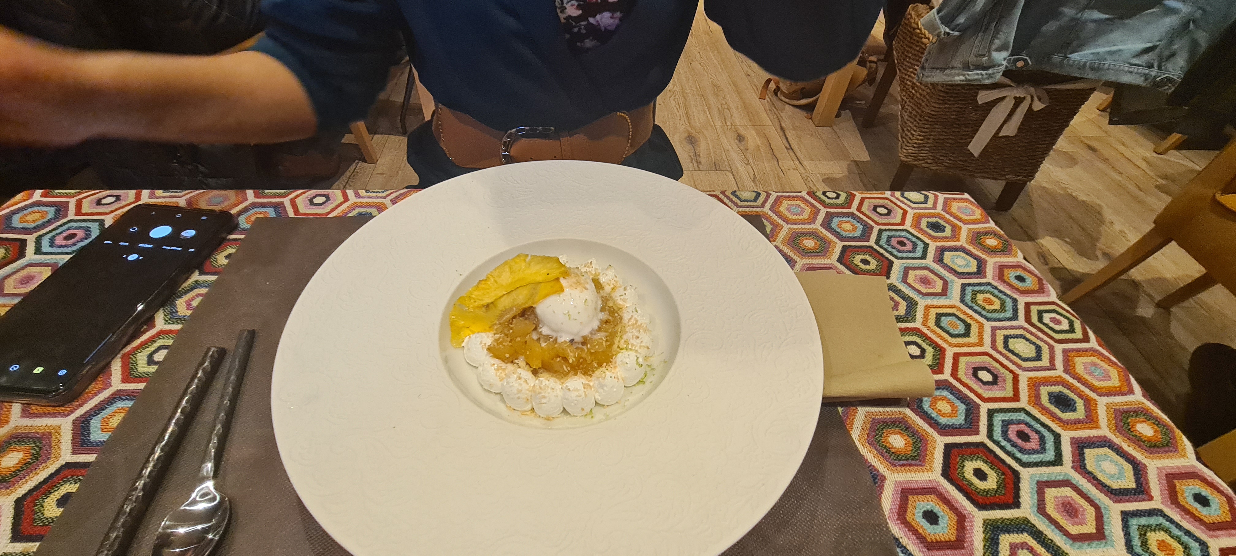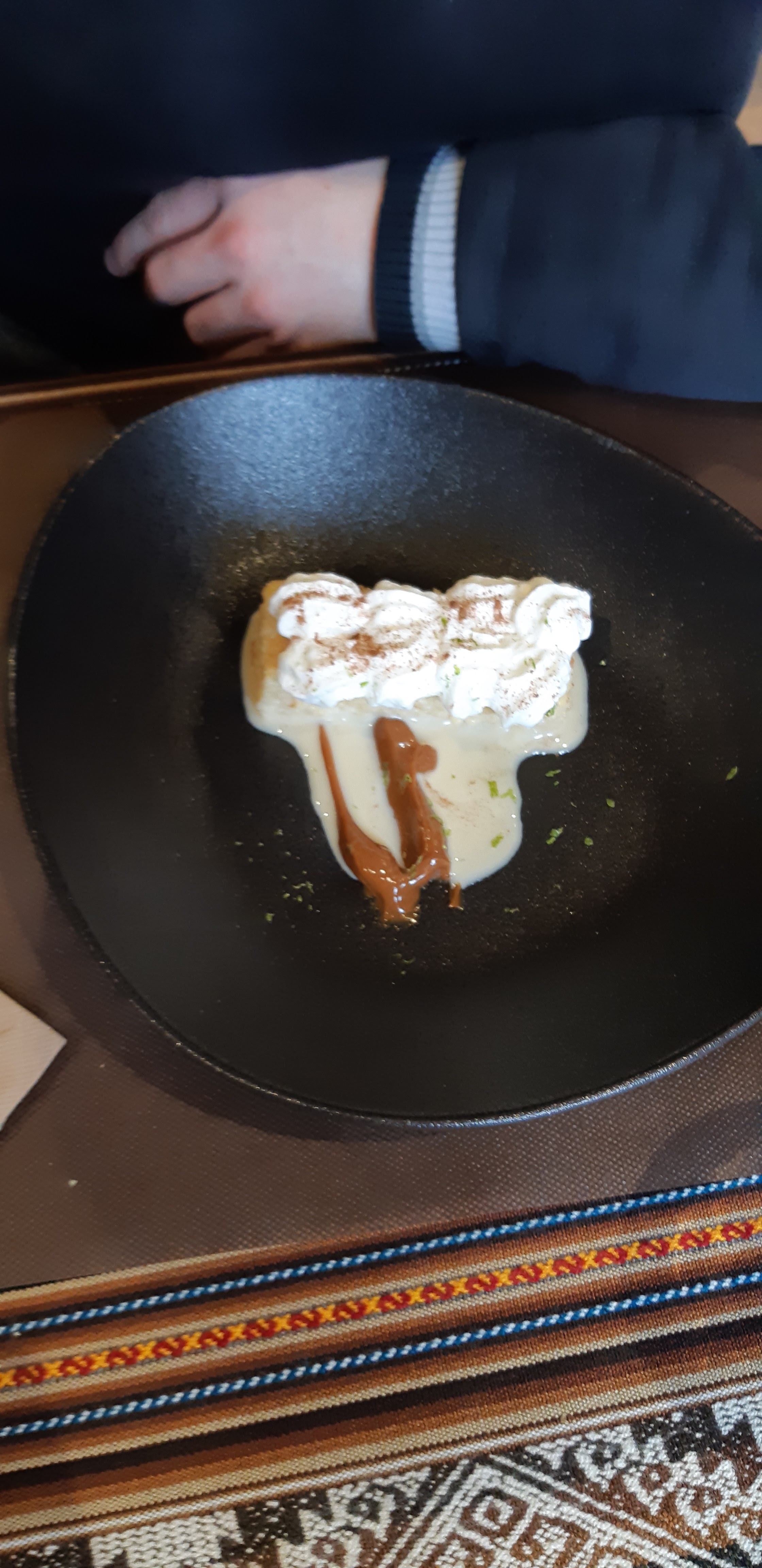 Dès l'entrée on a l'impression de voyager, la déco est superbe et la chef de salle est très souriante, blagueuse et très sympathique. Nous y sommes allé pour déjeuner un jeudi midi et nous avons pris le menu du jour entrée/plat/dessert pour 16 euros. Que des plats bien spécifiques du Pérou, des saveurs particulières qui nous font voyager, de l'entrée au dessert. A la carte, compter environ entre 7 et 11 euros pour l'entrée, entre 13 et 20 euros pour le plat. Pas excessivement cher pour une cuisine traditionnelle du Pérou dans notre campagne iseroise ! Je recommande vivement et j'y retournerai sans faute ! En photo notre dessert du jour feuilleté poire cannelle, glace noisette et coulis passion
