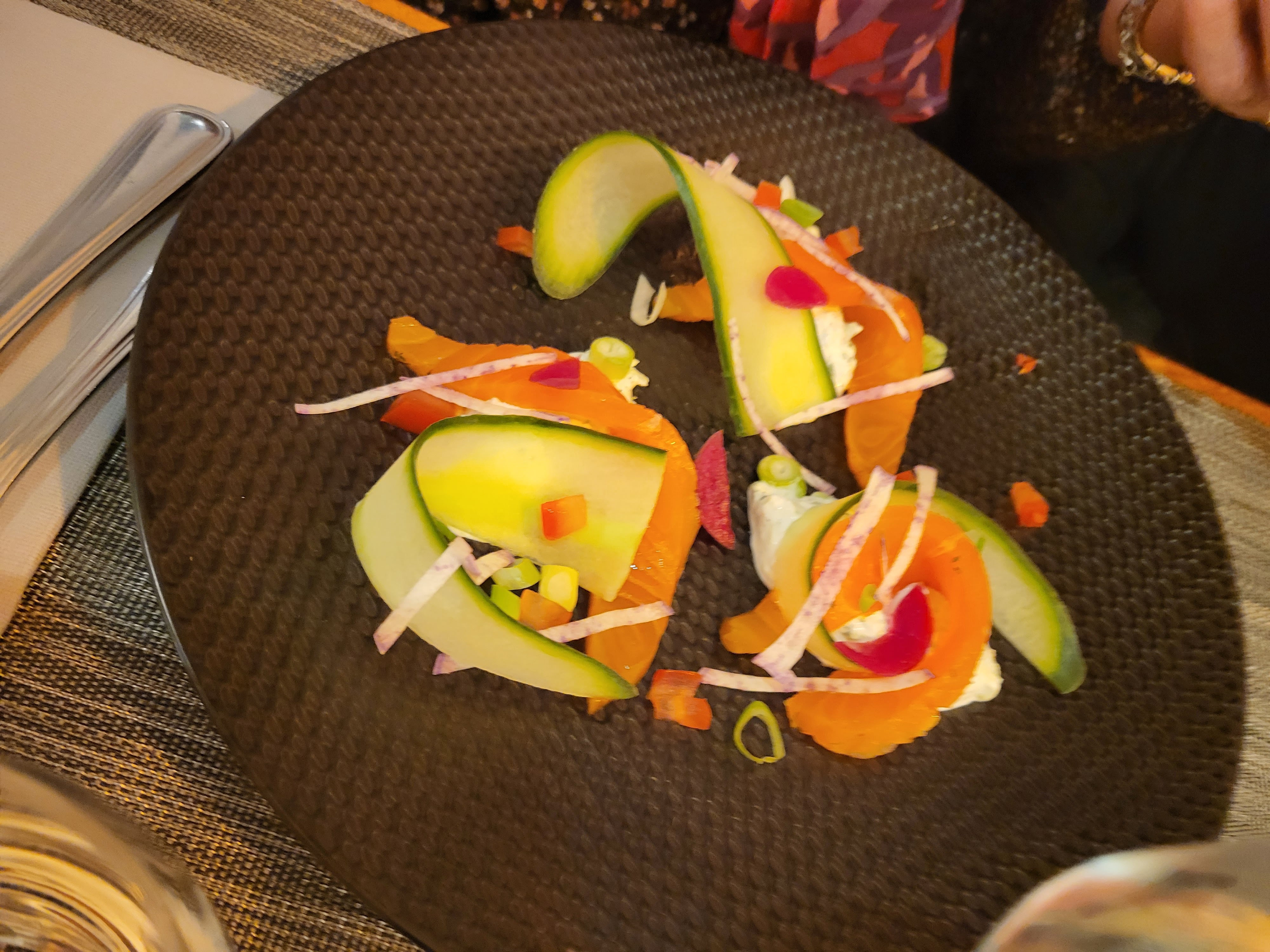 Malgré un appel passé en amont pour s’assurer de la possibilité d’option végétariennes, aucun plat disponible au service du soir, seulement des « adaptations » : le choux fleur rôti aux pommes et au saumon fumé est devenu juste du choux fleur (une fois l’assiette posée, il nous est annoncé qu’en fait, il n’y a pas de pommes) et l’assiette d’asperges au saumon est devenu une assiette de légumes (à 31€, donc). Déçus.