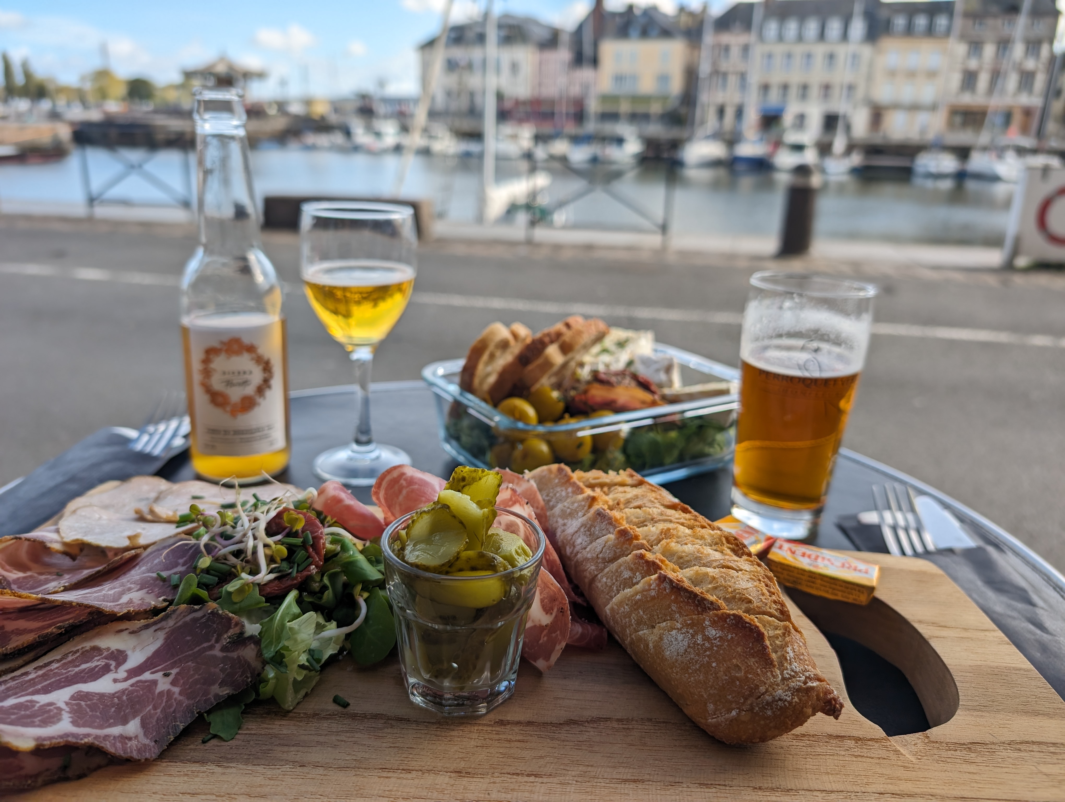 Délicieux plateau de charcut et fromage à savourer avec cette vue sur le port de honfleur La bière honfleuraise y est excellente Je recommande