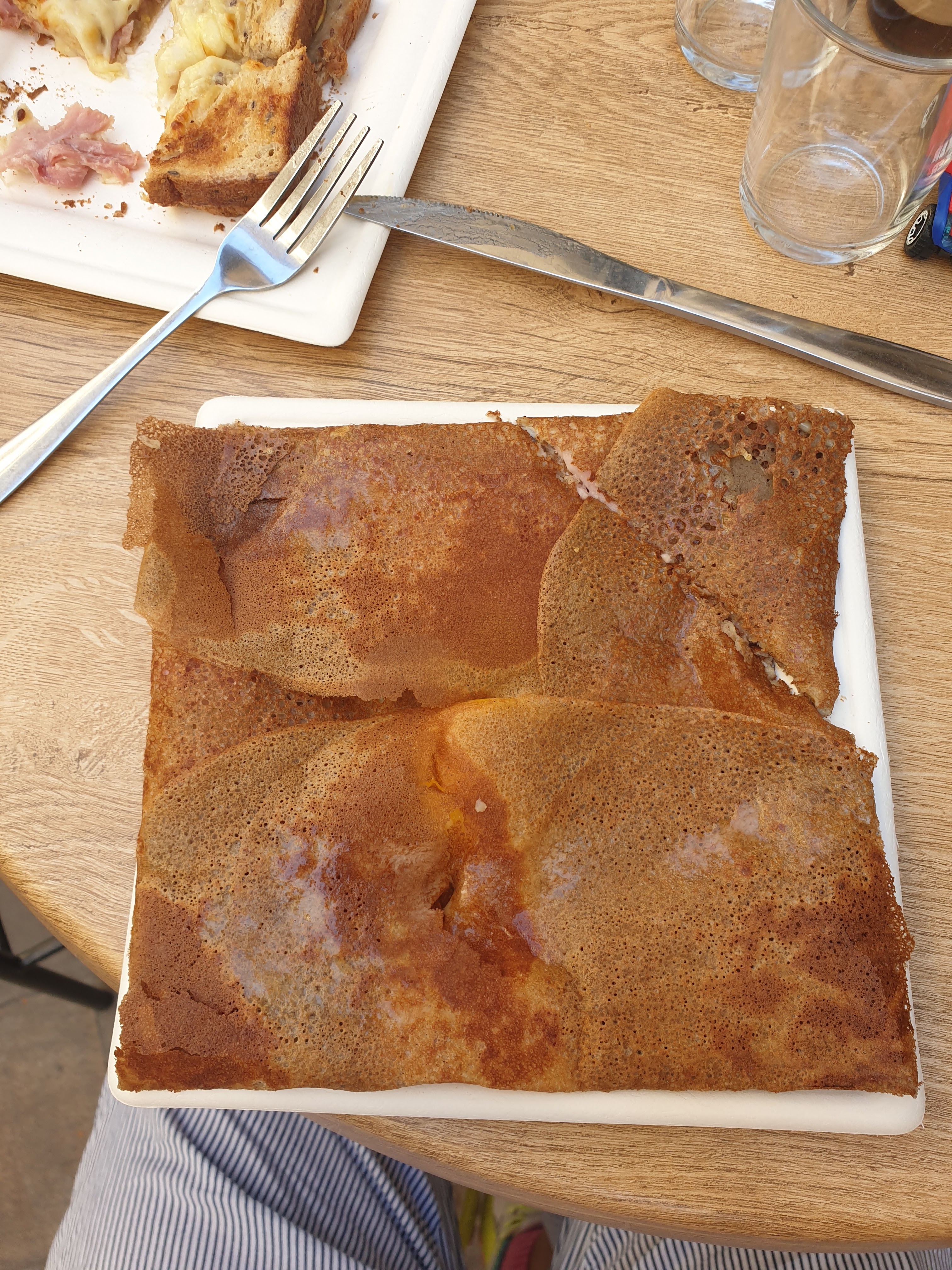 Bonne crêpe sucrée. Crêpe jambon-fromage extrêmement salée, impossible de finir. Les couverts et assiettes jetables sont mauvais pour l’environnement.