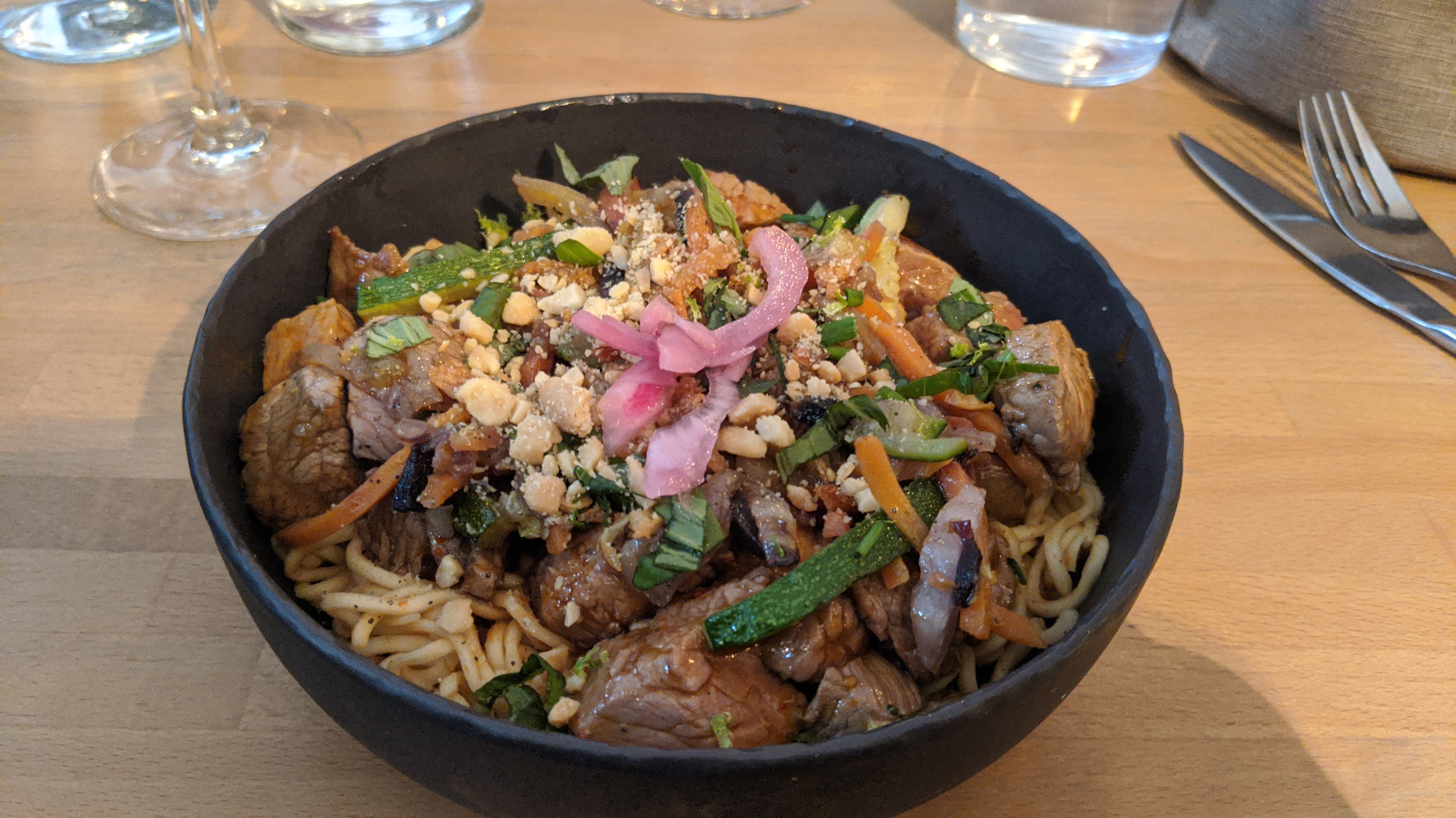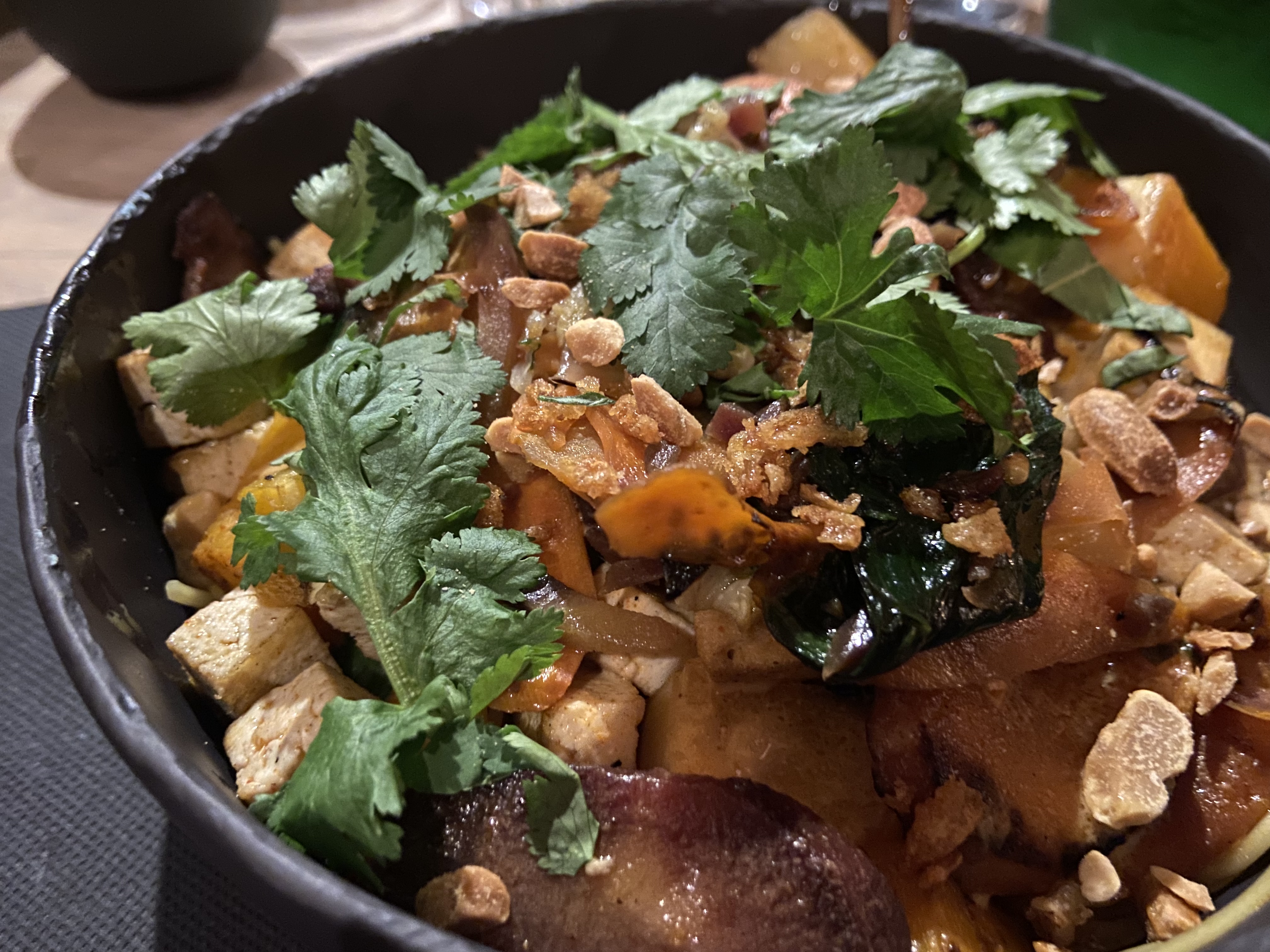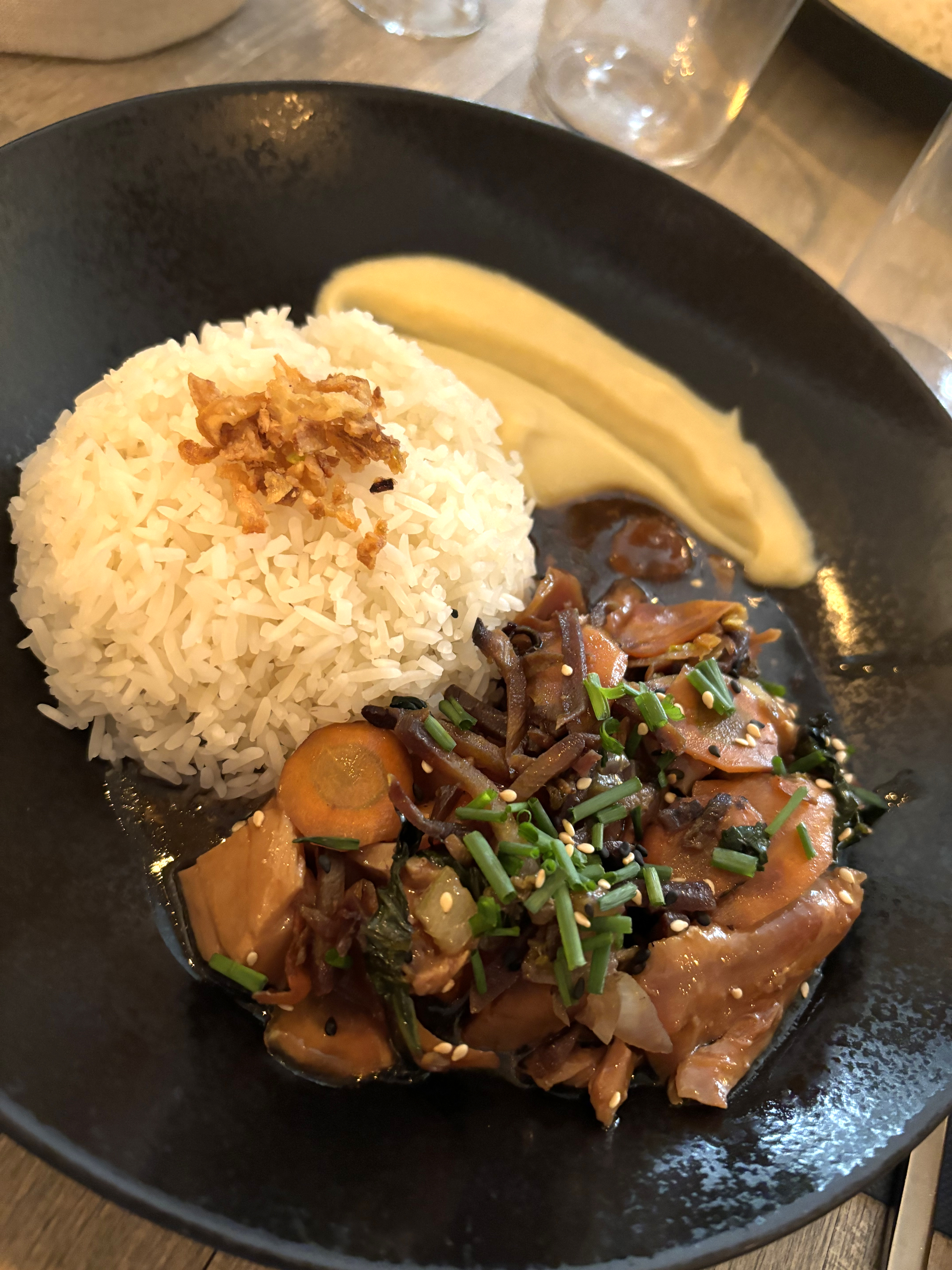 Pas mauvais mais pas si excellent non plus comme les notes le laissent penser. Voici notre expérience : déjà attention, pas d’entrée proposée, uniquement plat et dessert. Type brasserie, en 1h c’est plié. Nous avons pris un apéritif, moins de 10min après le plat arrive. Pas le temps de finir l’apéro donc. Wok de bœuf à la citronnelle, avec cacahuète et purée de patates douces. Rien de dingue finalement, bœuf sans réelle saveur, la citronnelle était posée dessus, mais la viande aurait pu être marinée pour plus de saveur. La purée bonne mais comme à la maison, et le riz blanc à côté idem. Autre plat, effiloché de veau sauce aigre douce. Le tout servi dans une assiette à soupe remplie de riz. Là aussi, pas de grande saveur. Quasiment à la fin de notre plat on nous demande si on veut boire quelque chose. Cela aurait été avec plaisir, mais dès le début du plat, pas à deux trois bouchées de la fin du plat. (Dommage pour le loupé car le personnel était aimable). Dessert : assiette de fromage, rien d’innovant, du comté, du brie, du morbier et du chèvre cendré. Crème brûlée au sésame. Idem, bonne mais pas wahouuu. Bref, un resto à recommander pour manger pas mauvais et rapidement. Mais à décommander si vous souhaitez profiter d’un restaurant au sens propre, pour le plaisir des papilles et pour y passer quelques heures.