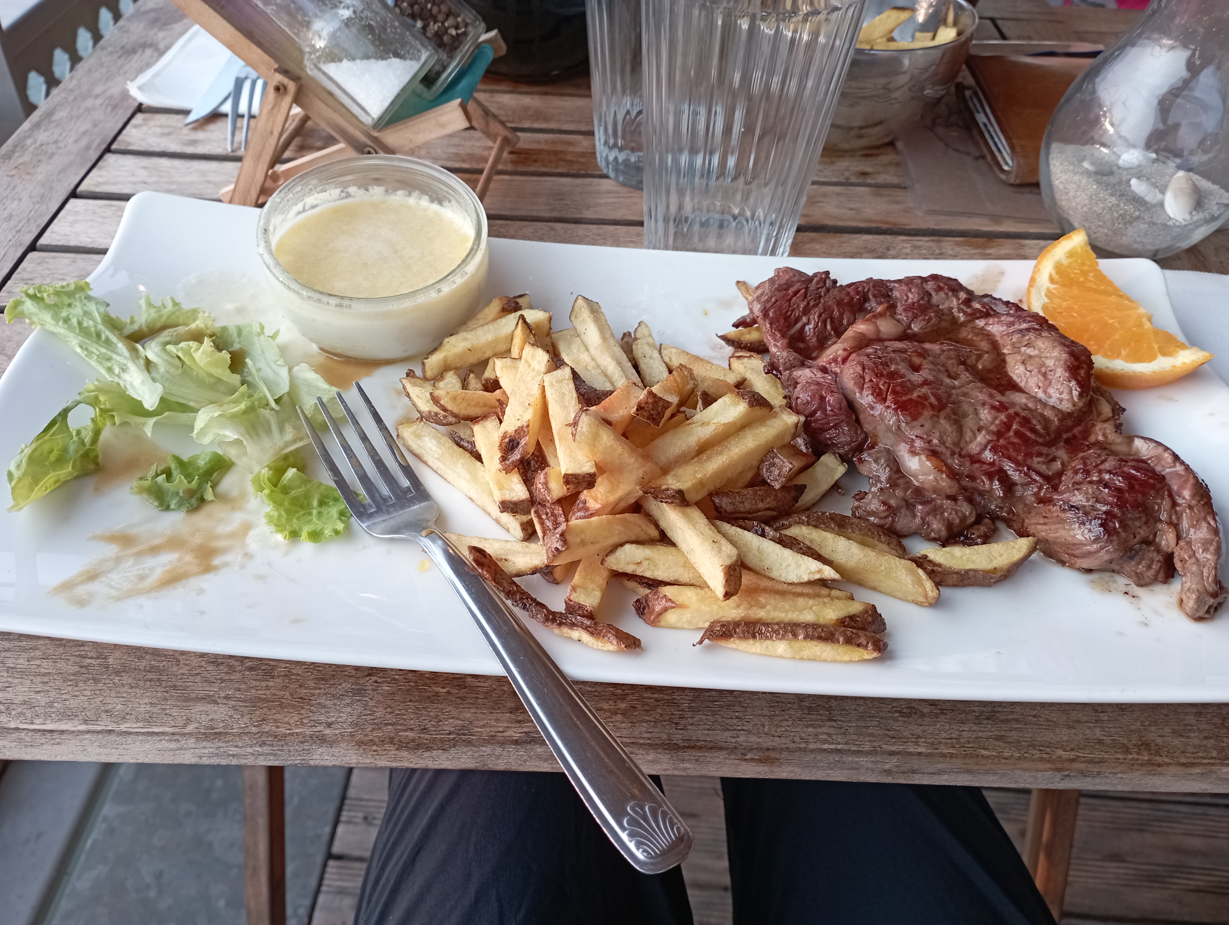 Accueil et service simple et chaleureux. Emplacement idéal pour passer un bon moment au bord de l'eau. Les salades étaient copieuses. La sauce mériterait d'être faite maison. Les menus enfants étaient légers mais suffisants pour le prix. Bonne mousse au chocolat.