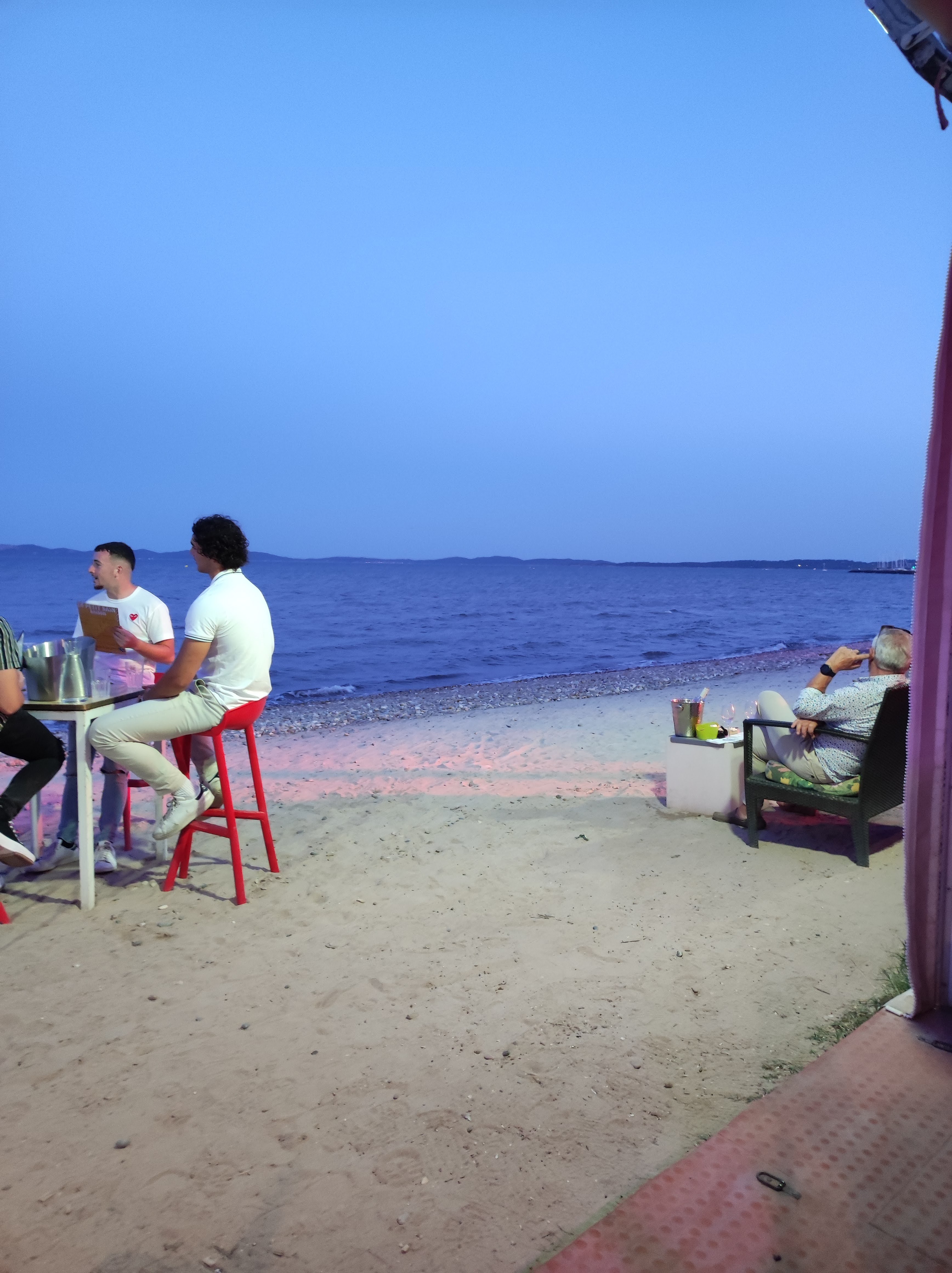 Ambiance fêtarde, serveur sympas, belle vue sur la plage, siège confortable. Musique vraiment trop forte: impossible de s'entendre parler, prix boisson basique trop élevé