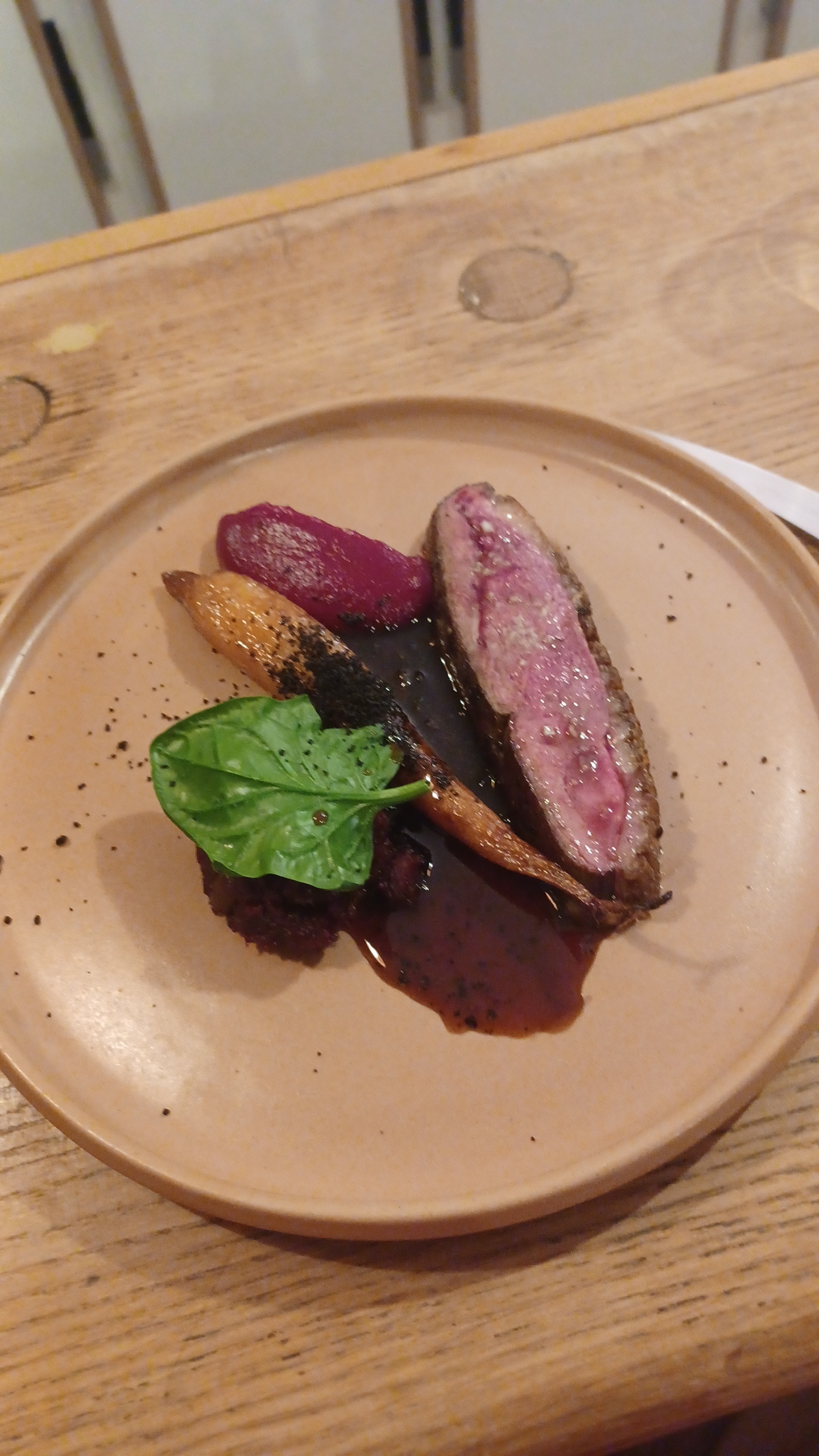 Nous sommes arrivés tard et avons quand même reçu un super accueil. Nourriture très savoureuse. Un tour de force culinaire ! Seulement un choix de 2 plats, mais nous avons goûté les deux (échangés avec notre partenaire) et les deux étaient délicieux. Choix de viande/poisson. En entrée, plat et dessert. J'ai pris un dessert parce que tout était si bon et me laissait en vouloir plus !
