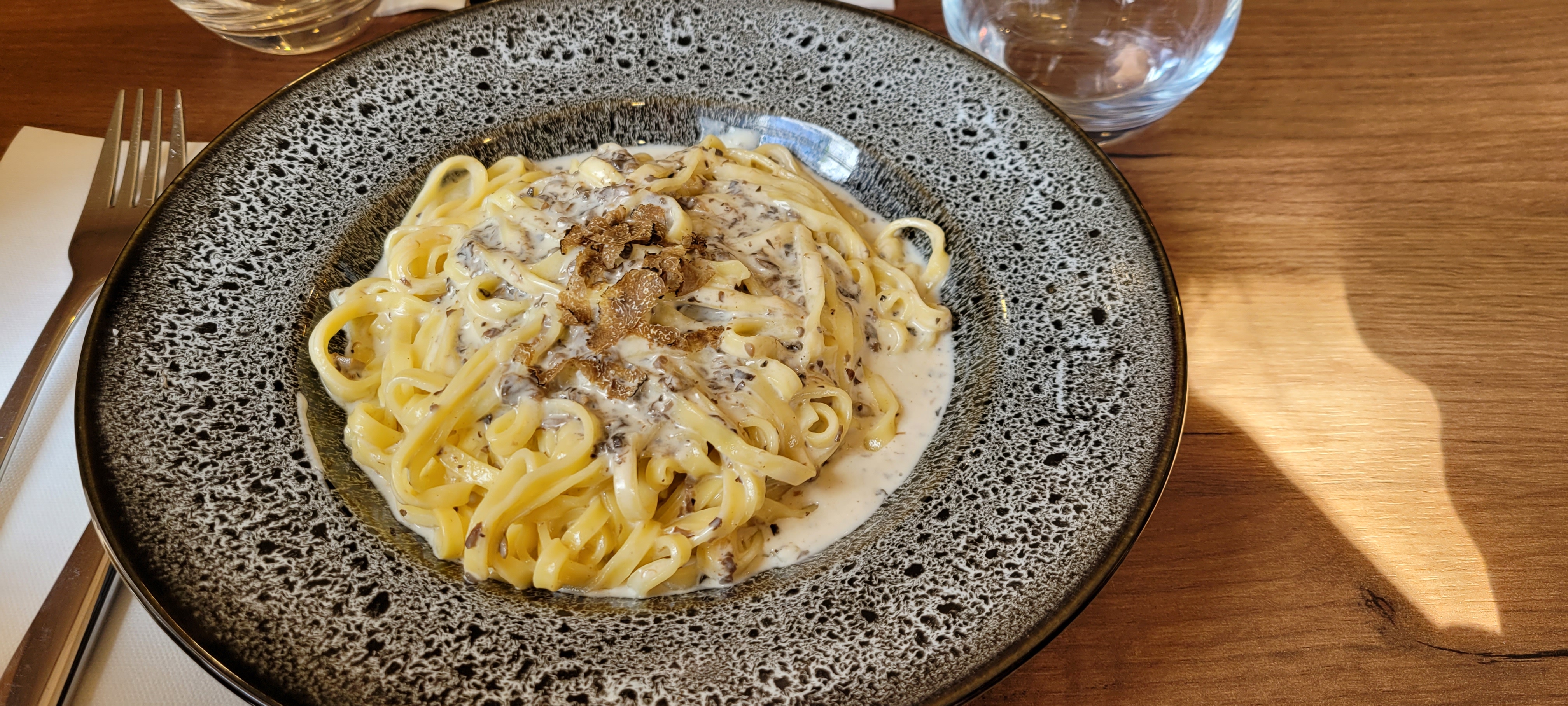 Diner plaisant et de savoureuses pâtes à la crème de truffe.