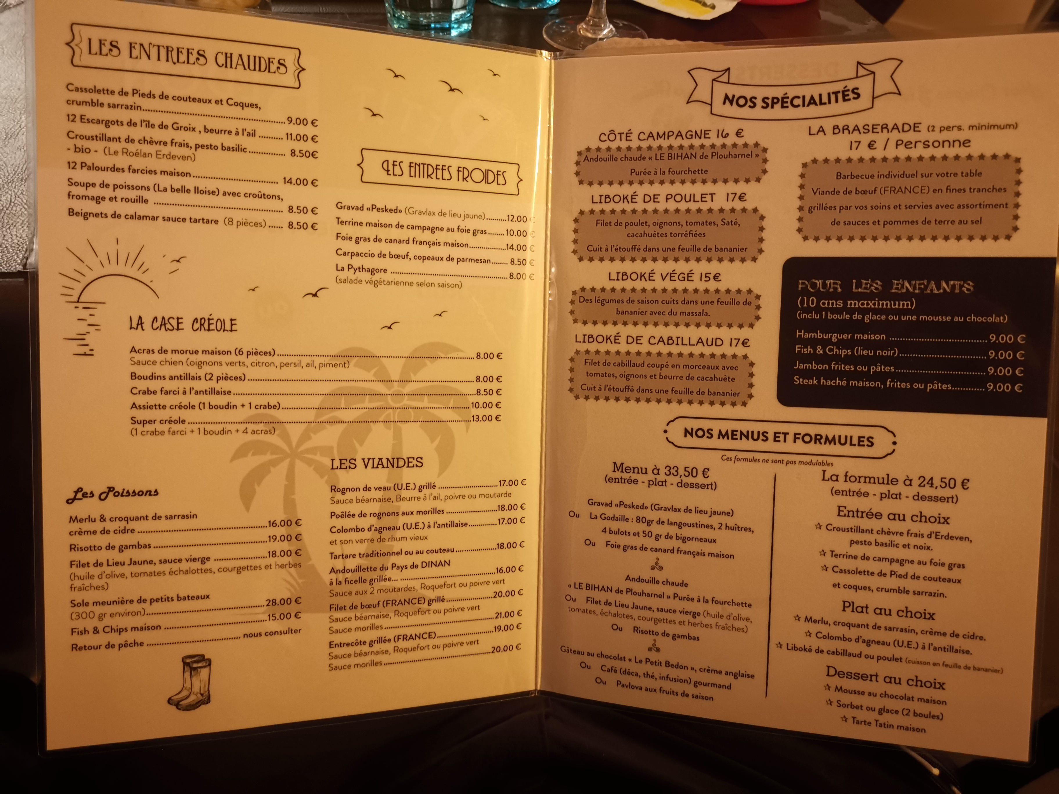 Une très bonne adresse ! Un sans faute ! Très bon accueil, dès la réservation. Service sympa et rapide, très agréable. Choix dans le placement. Une carte originale, fruits de mer, poisson, poisson du jour), viande, la case créole (originale !), grand choix de desserts, belle carte des vins ! Un restaurant à faire absolument à Carnac Un très, très bon moment !