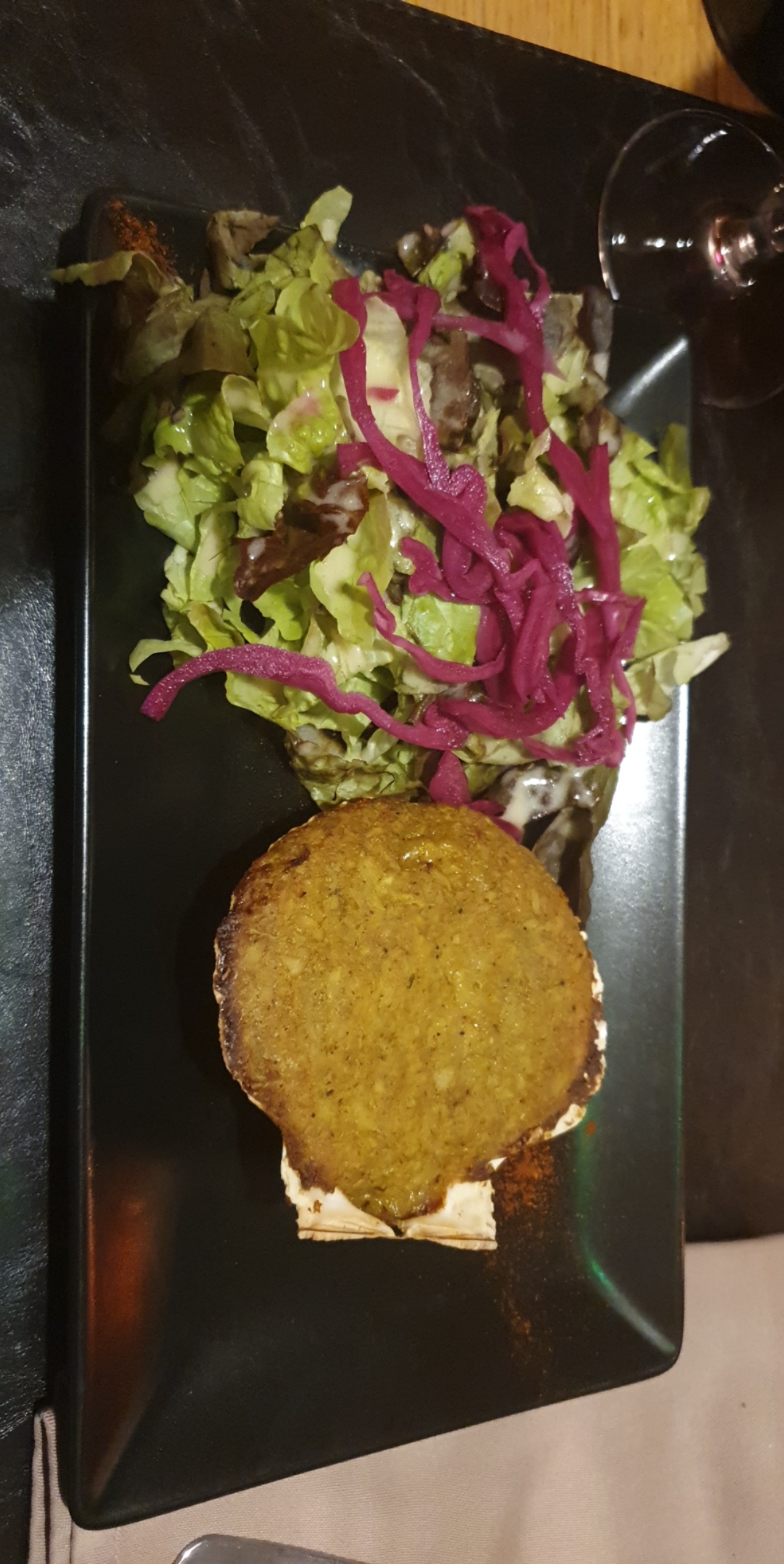 Pas de chance peut être mais Une soupe de poisson extrêmement poivrée… limite immangeable. On pense que la soupe était maison et bonne mais complètement masque par le poivre. Cote portion, on reste sur sa faim pour 16€. Ensuite un camembert chaud flambe au calvas. Correcte mais ca trempe dans le calvas. Bref nous n’avons pas été impressionné.