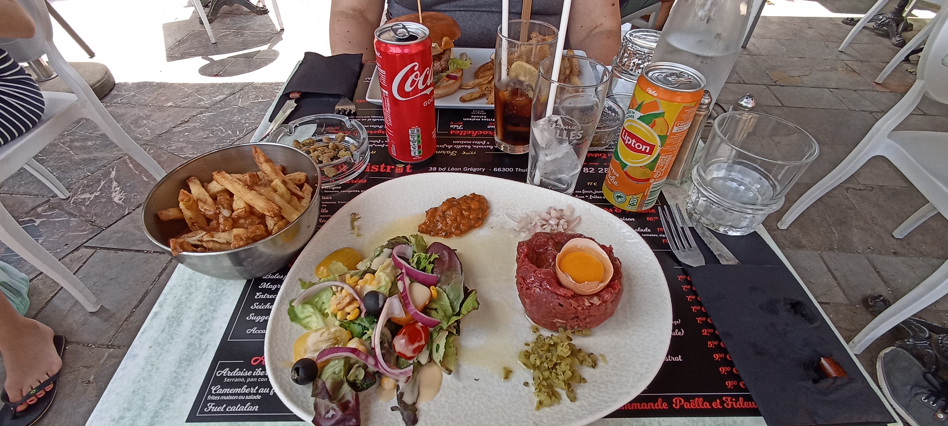 Personnel aimable comme une porte de prison, tables de terrasses pas calées du tout, oui, c'est très pénible quand on s'y trouve même si sur son canapé, cela peut prêter à sourire, chaises inconfortables et menu vraiment pas terrible, la carte mériterait d'être plus variée. J'aurais pas mis d'étoiles mais je me suis rappelé que c'était propre, locaux comme terrasse et que le kawa était bon.