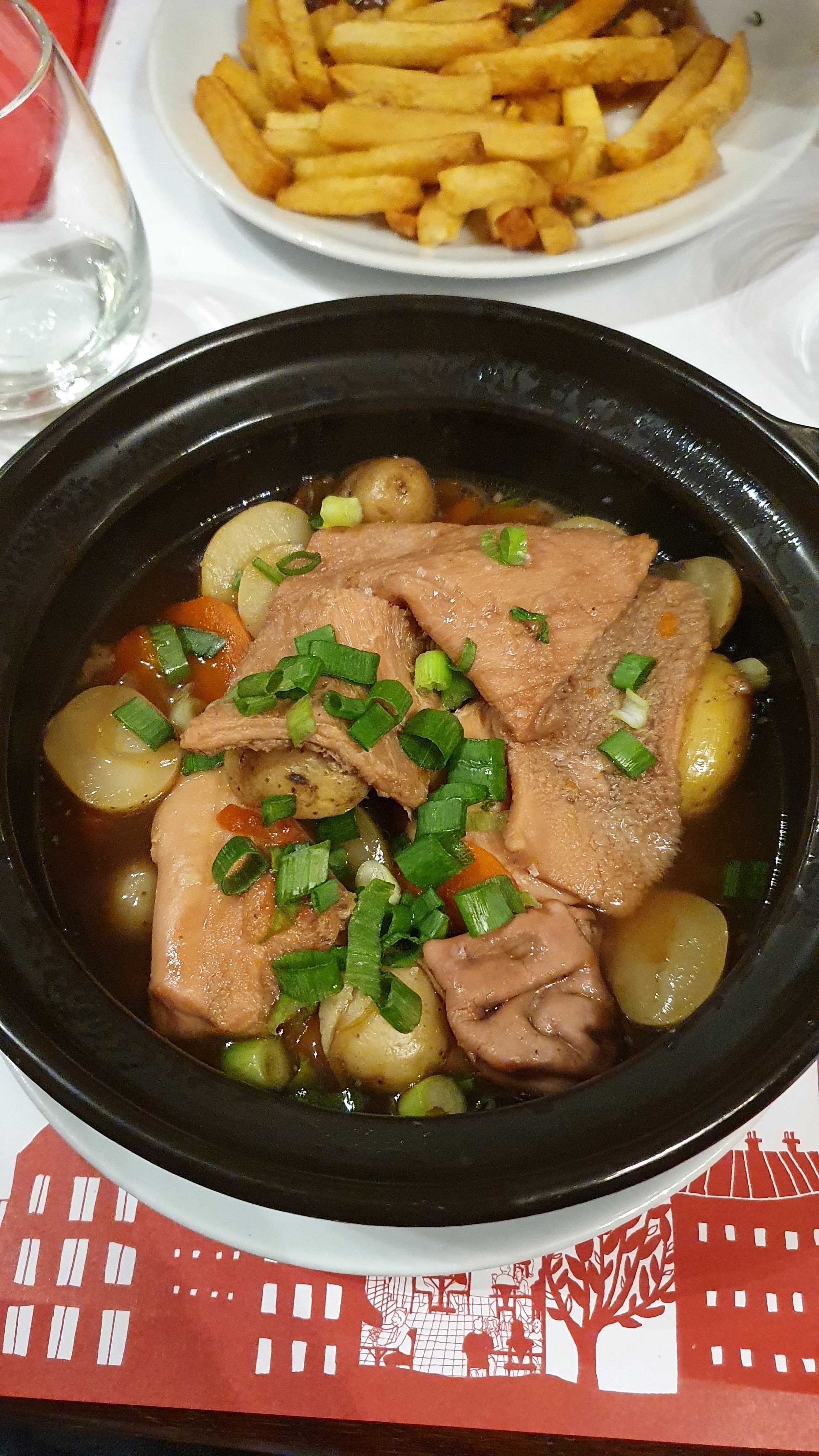 Superbe bouillon. Excellent service, serveurs attentifs et à l'écoute. Un dimanche vers 15h, pas plus de 15mn d'attente. Notre choix : foie gras maison au calva, camembert rôti au miel, bœuf bourguignon, confit de canard, brioche perdu au caramel, tartelette ananas. J'avoue avoir été étonné, bien meilleur qu'un bouillon ordinaire : produit frais et explosion des papilles pour tous les plats. sans aucun doute, nous reviendrons pour tester le reste de la carte.