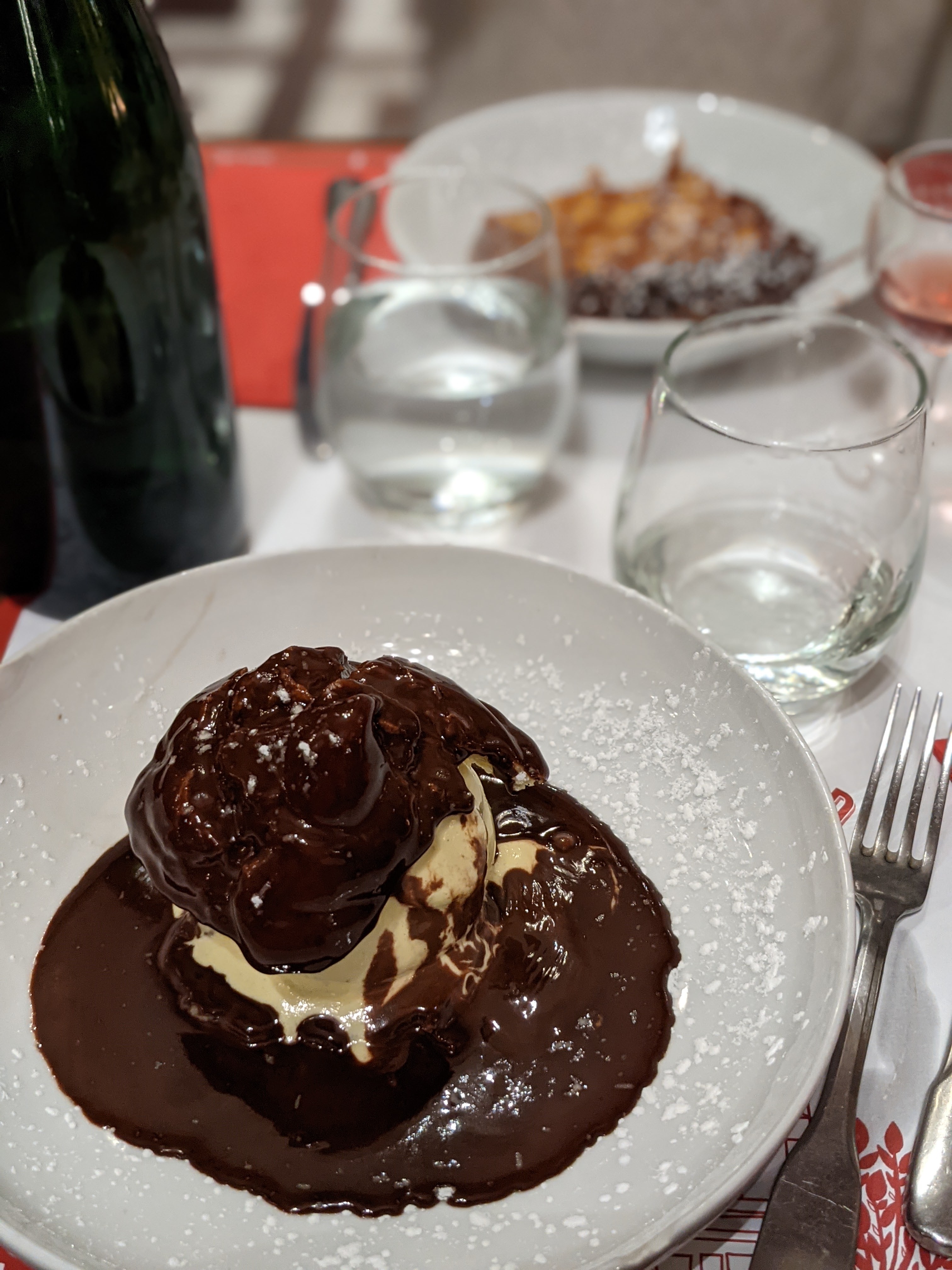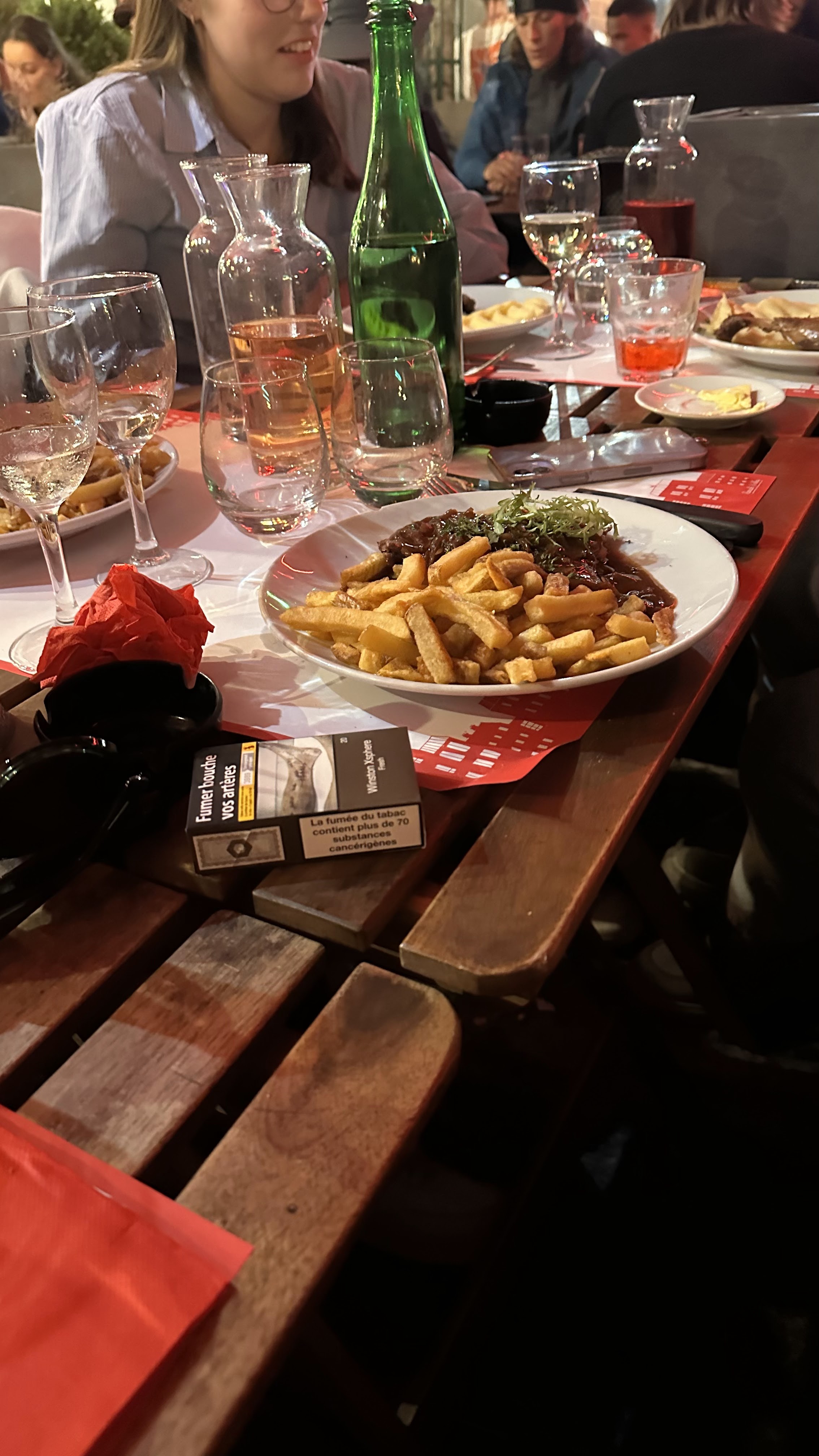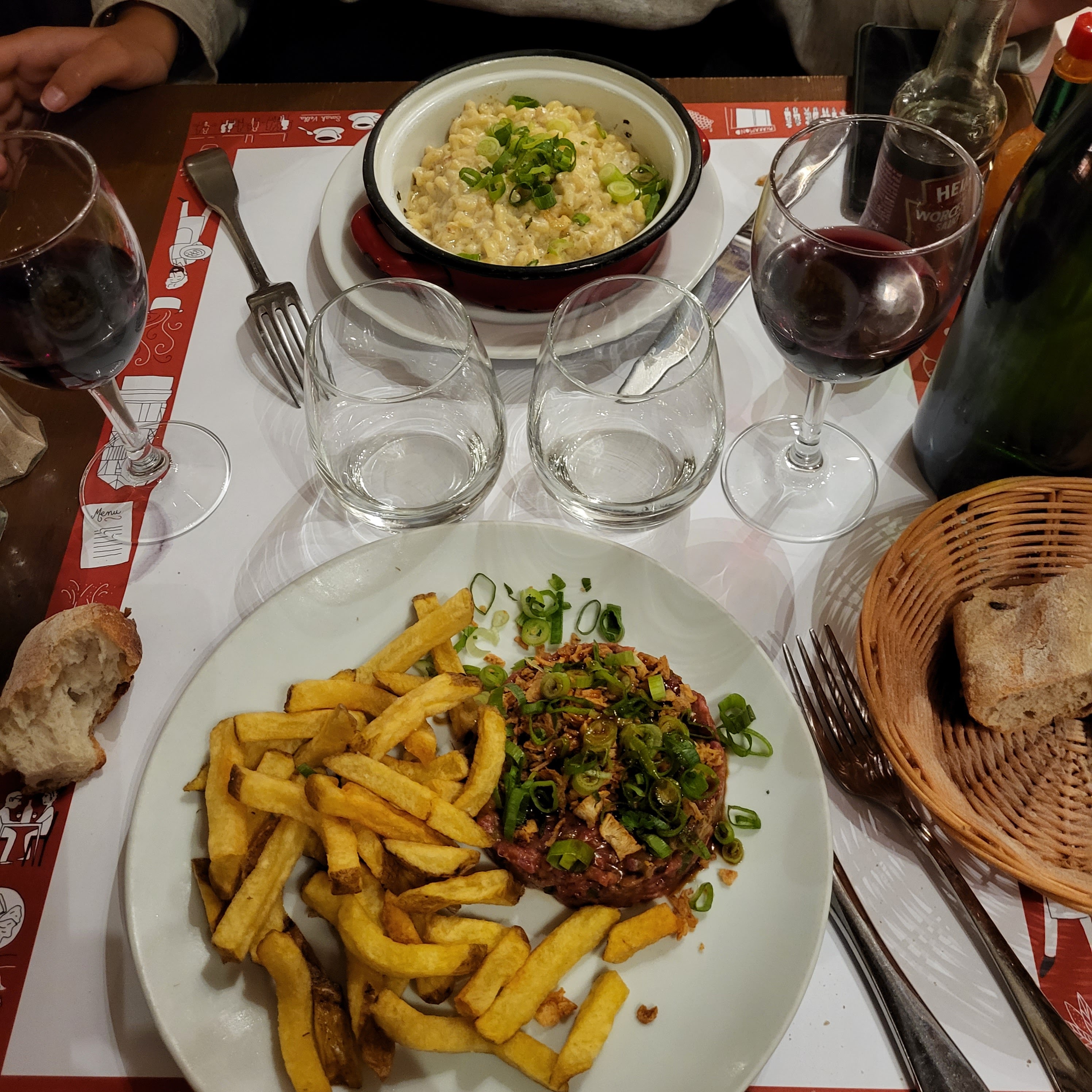 Lieu tres vivant! Nous sommes arrives vers 21h, 45min de queue pour deux pour un dimanche soir. Servis rapidement. J’ai pas été tres fan de la sauce échalote. On a pris une mousse au chocolat pour deux, on etait deja pleine, on a pas pu la finir !