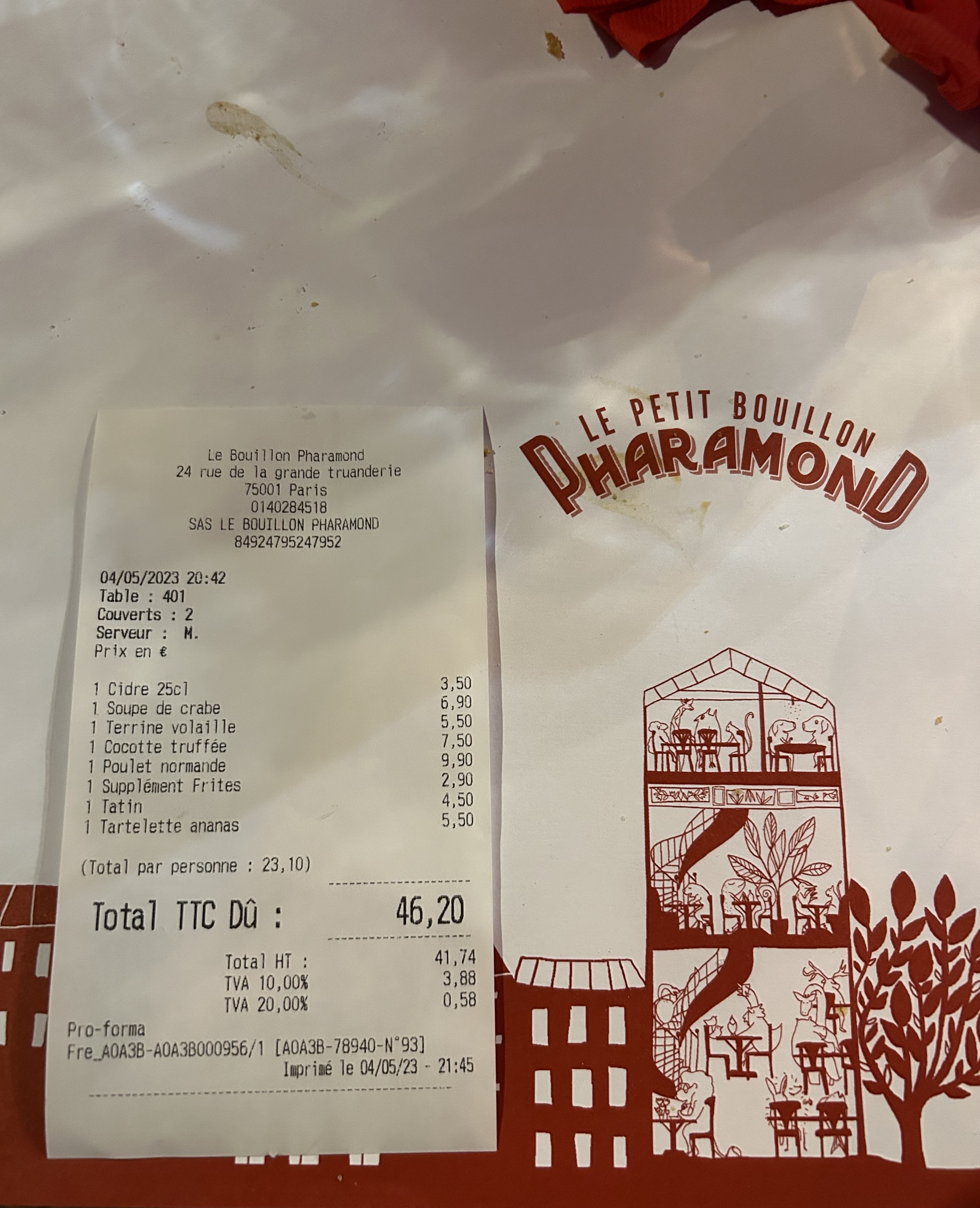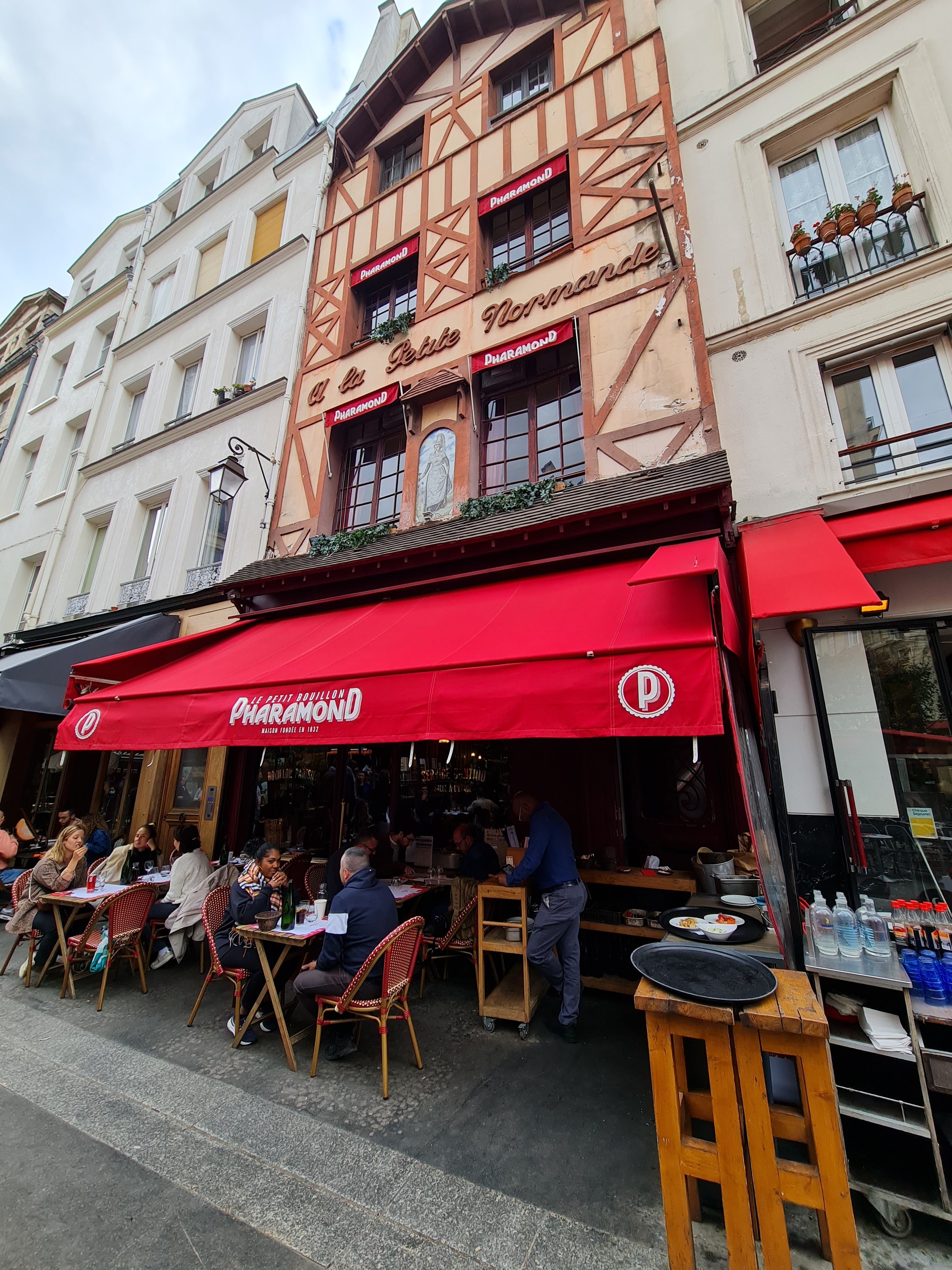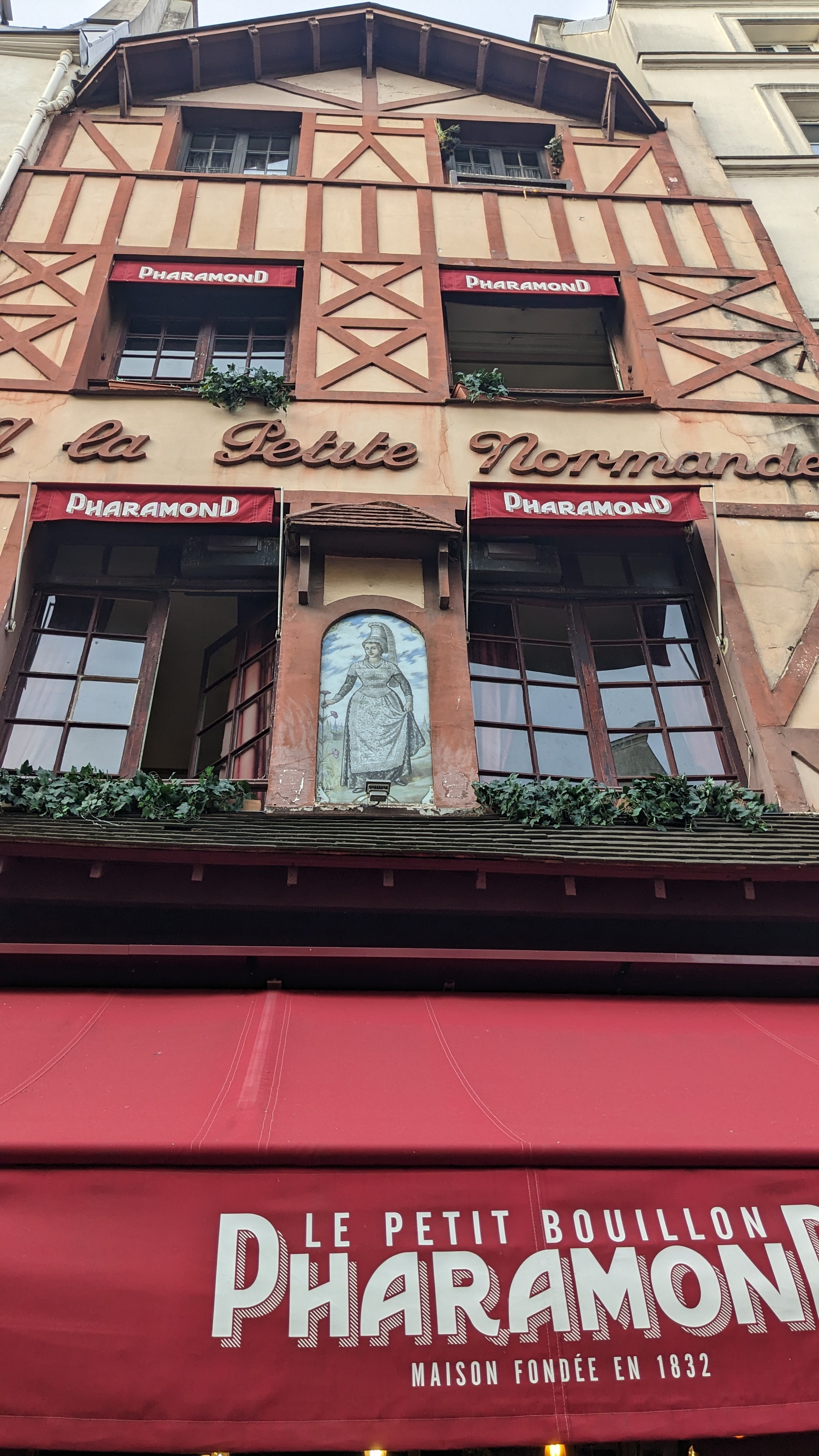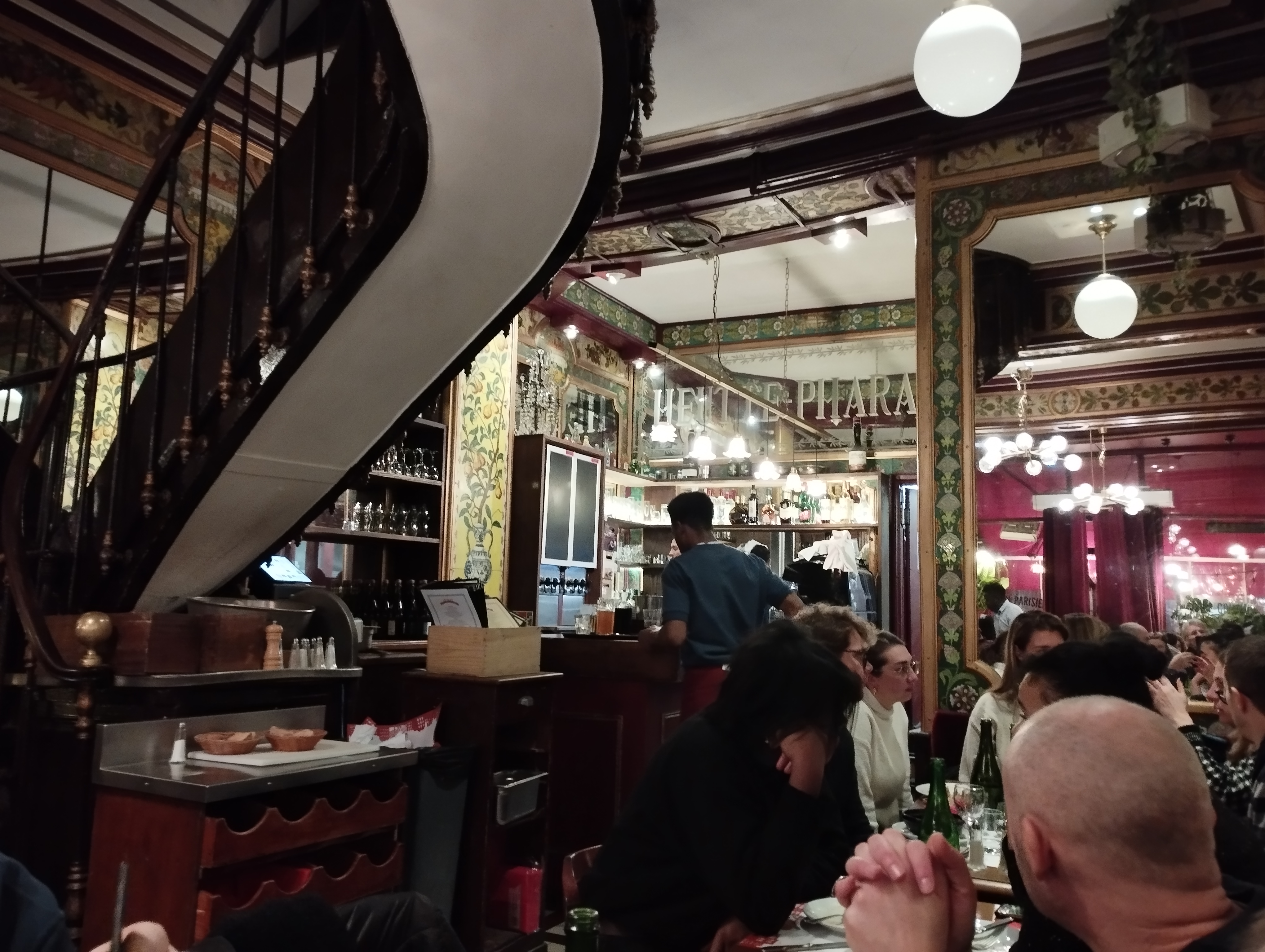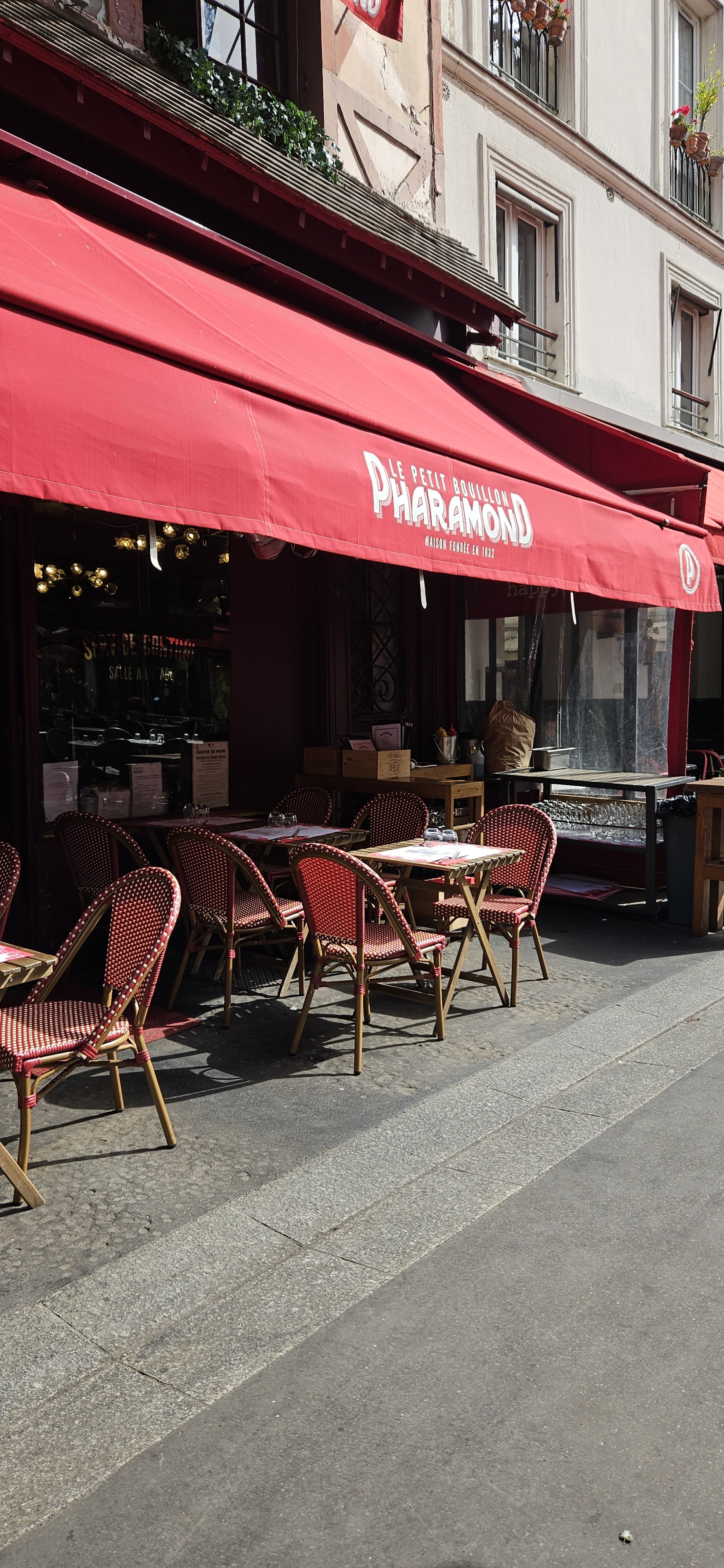 Nous avons (enfin) testé le pharamond. Brasserie parisienne à gros débit, la nourriture est bonne, et le cadre est beau. Gros avantage, au lieu d'attendre dans la queue on prend votre numéro et vous pouvez revenir plus tard sans rester debout dans la queue. Pour trois entrées, deux plats, deux desserts, un trou normand et un digestif, un 1/2 litre de vin rouge, on s'en sort pour 64€. Pour nous c'est un restaurant validé, on reviendra 👍 Merci au staff, super équipe