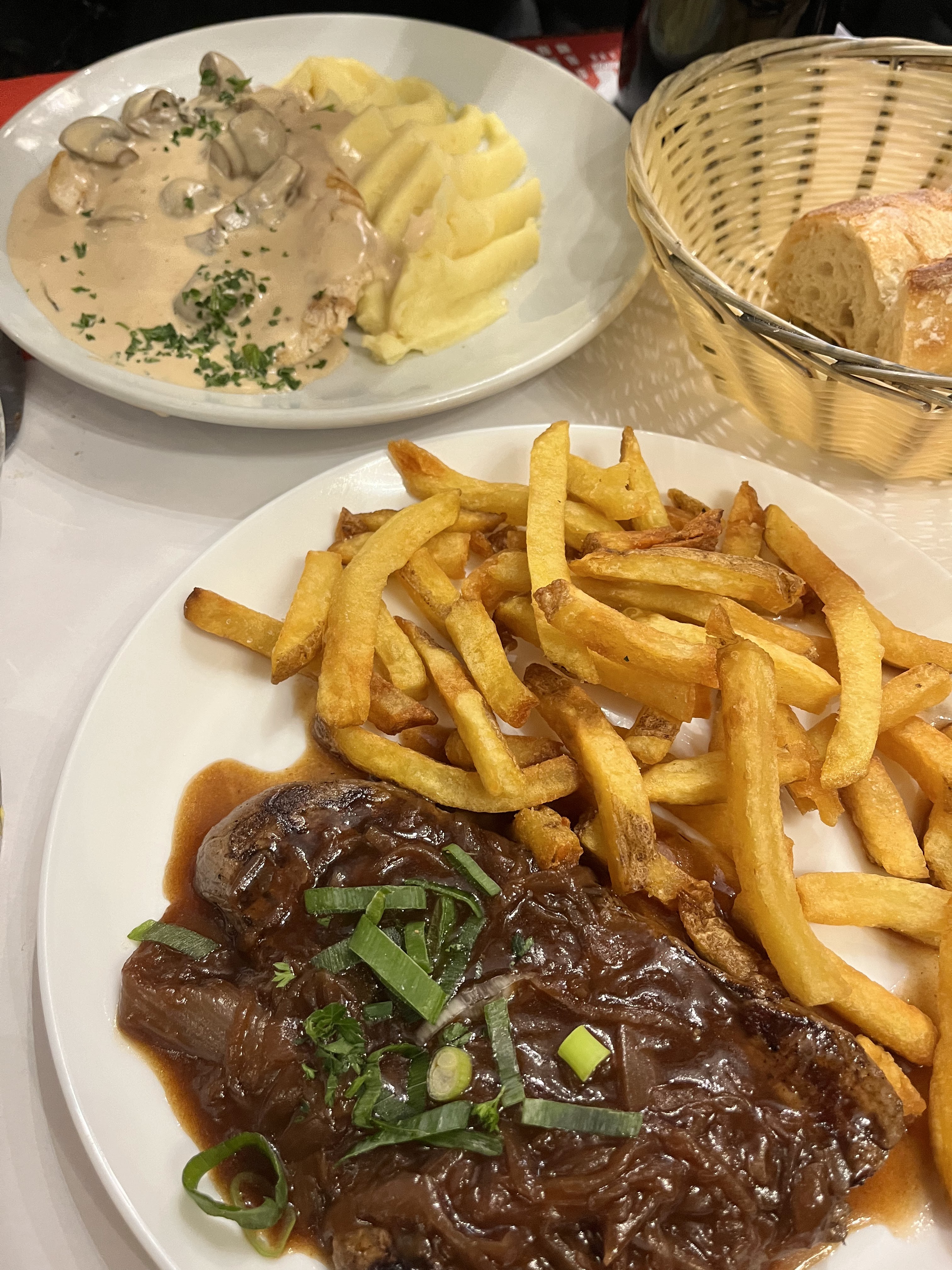 Le service est rapide et efficace , nous avons pris un camembert rôti au miel et des œufs mimosa et pour suivre deux steaks sauce échalotes avec des frites et pour finir une mousse au chocolat.La viande etait excellente !!!