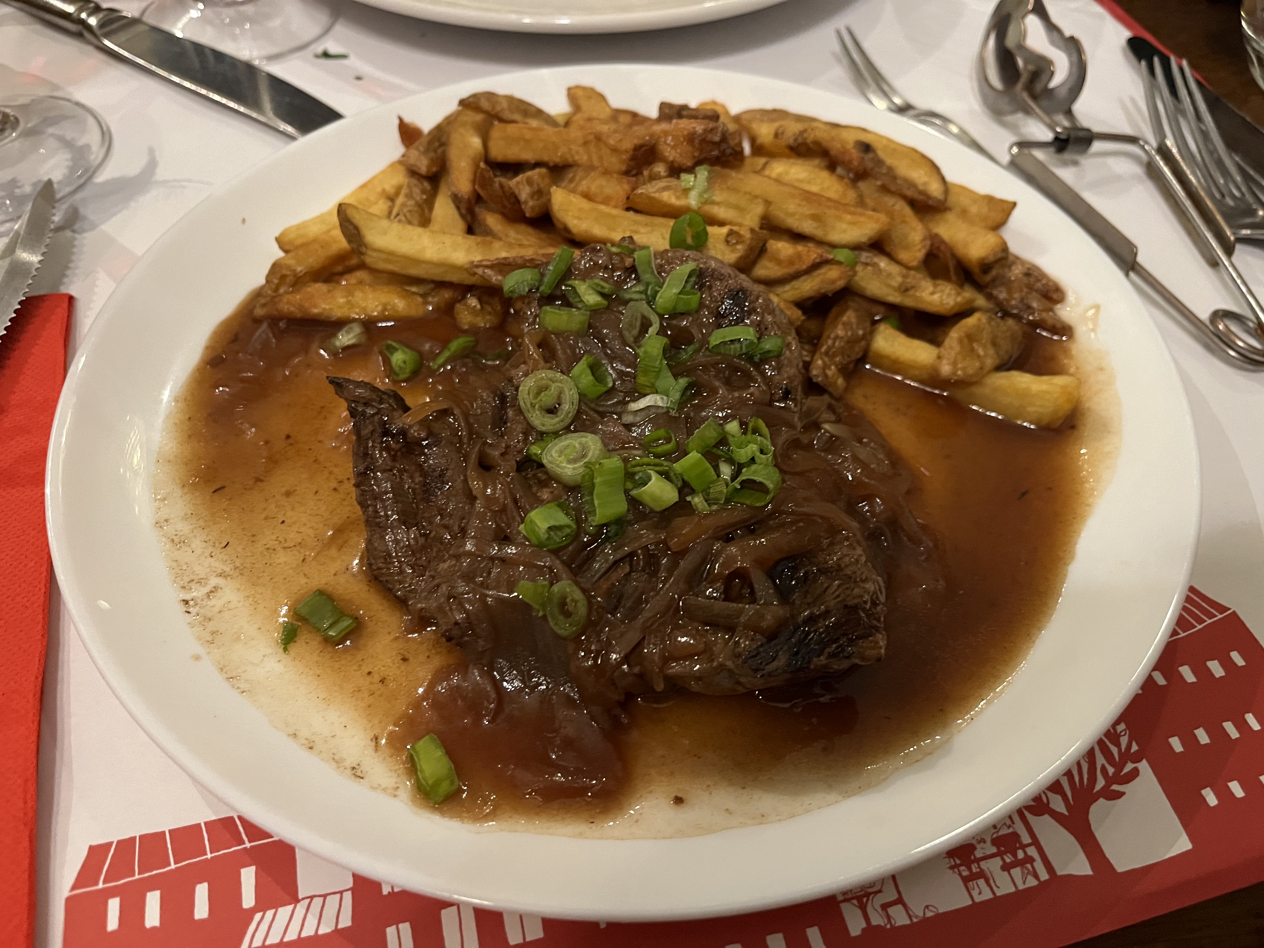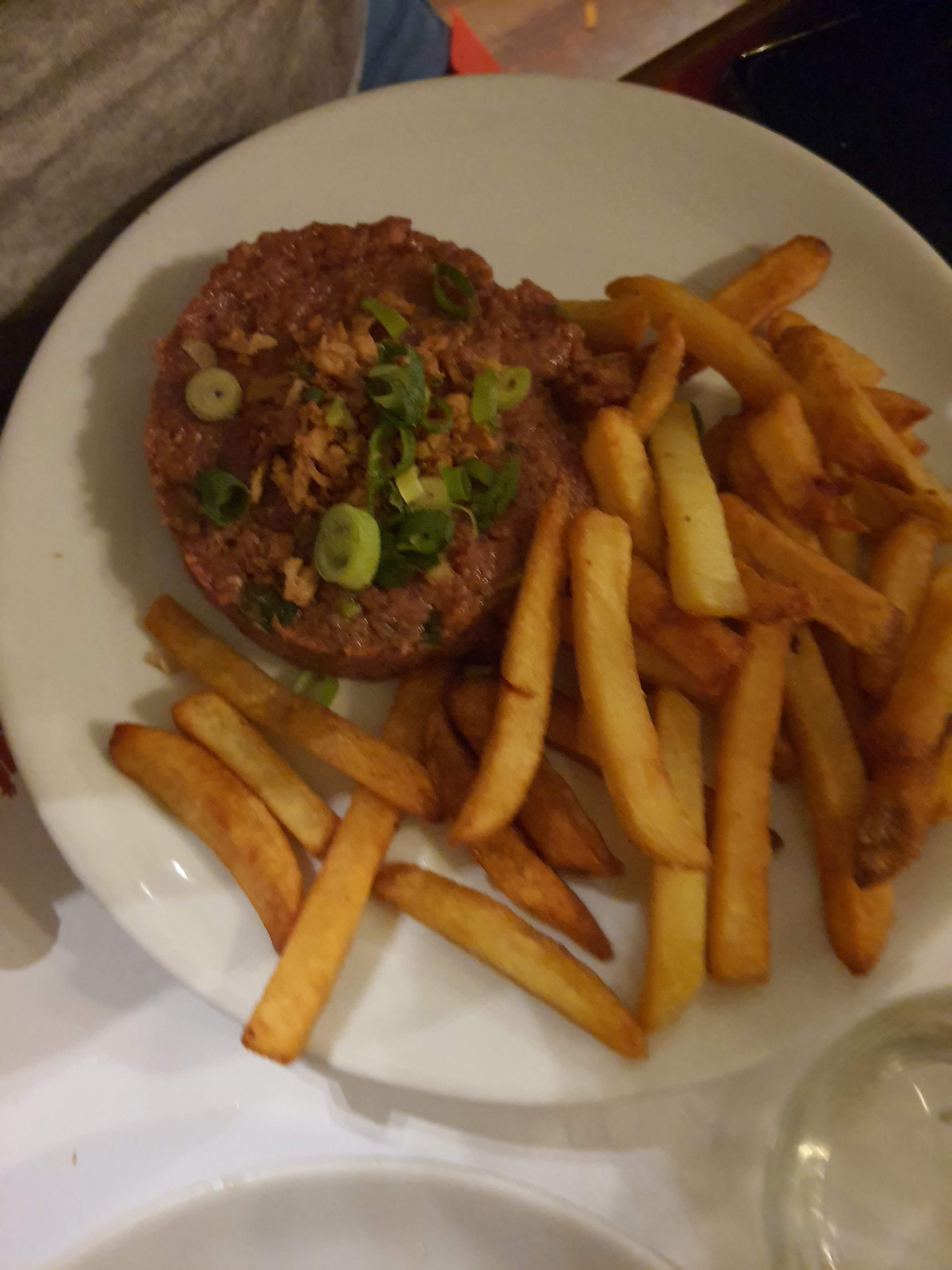 Nous avions pris un plat de viande sauce echalote frites et malheureusement la viande cuit saignant et la sauce etaient froides.pourtant les frites etaient chaudes. et en plus la viande etait très filandreuse. Et puis un profiteroles en dessert mais le chocola n'etait pas de tres bonne qualité. Après avec le temps ça a changé car j'ai mangé mieux il y a quelques mois dans ce meme restaurant. Dommage!