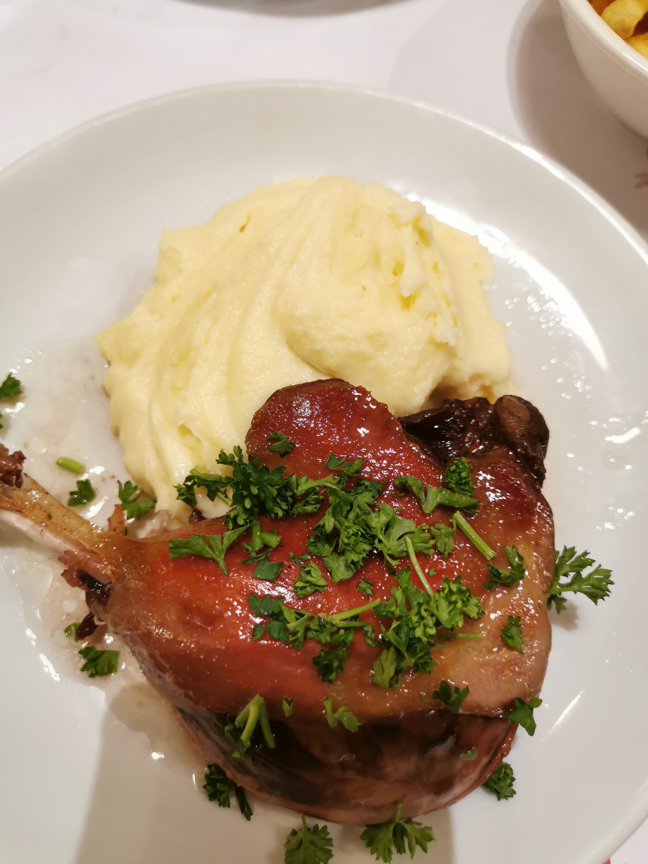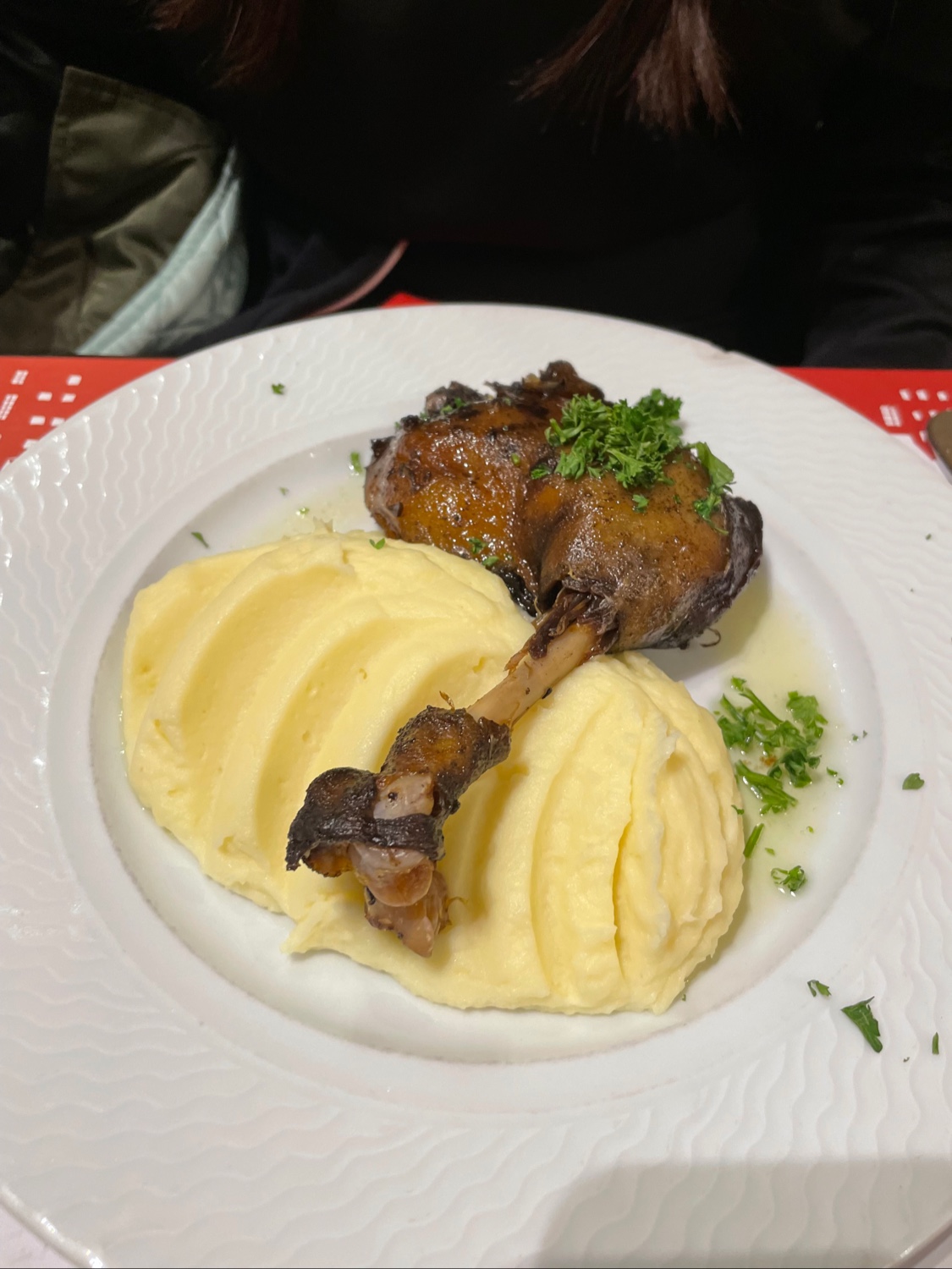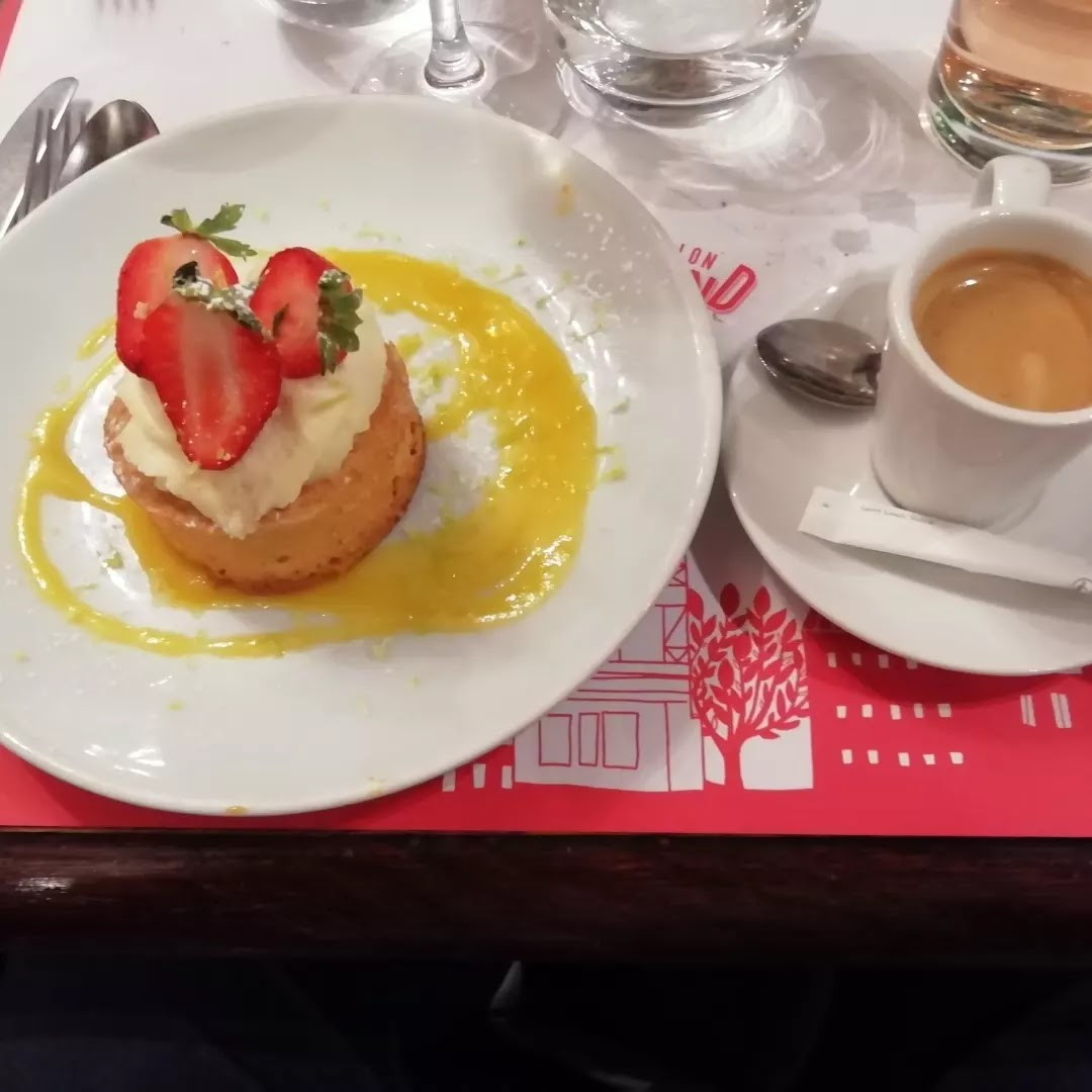 Cuisine française classique, pas chère, très savoureuse et authentique. Les plats coûtent 10 à 12 euros, les desserts 5 à 10. N'oubliez pas de couvrir l'intérieur, histoire de jeter un coup d'oeil, même si vous avez dîné sur la terrasse d'été. Mon dîner - entrée, canard, dessert et vin coûte 30 euros. Parmi les inconvénients - il faut faire la queue, et il n'est pas nécessaire de choisir une table, nous avons attendu 30 minutes et avons eu une table près du poste des serveurs, nous n'avions pas de paix, mais au moins « Ambiance » 😂
