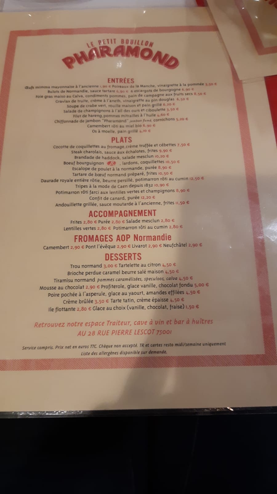 Un nouveau Bouillon à Paris. C'est une vague qui déferle sur la Capitale parisienne et qui permet à chacun de goûter à prix modéré aux plats traditionnels français. Ici au Pharamond, ancien restaurant classique, la mue s'est faite naturellement vers le Bouillon et toujours en proposant de manière privilégiée des produits normands de qualité : poireaux, crème fraîche, camembert, pomm, calva... Ce qui donne un côté spécial à ce Bouillon à venir visiter aussi pour sa décoration intérieure. Un bel accueil vous y attend une fois installés.