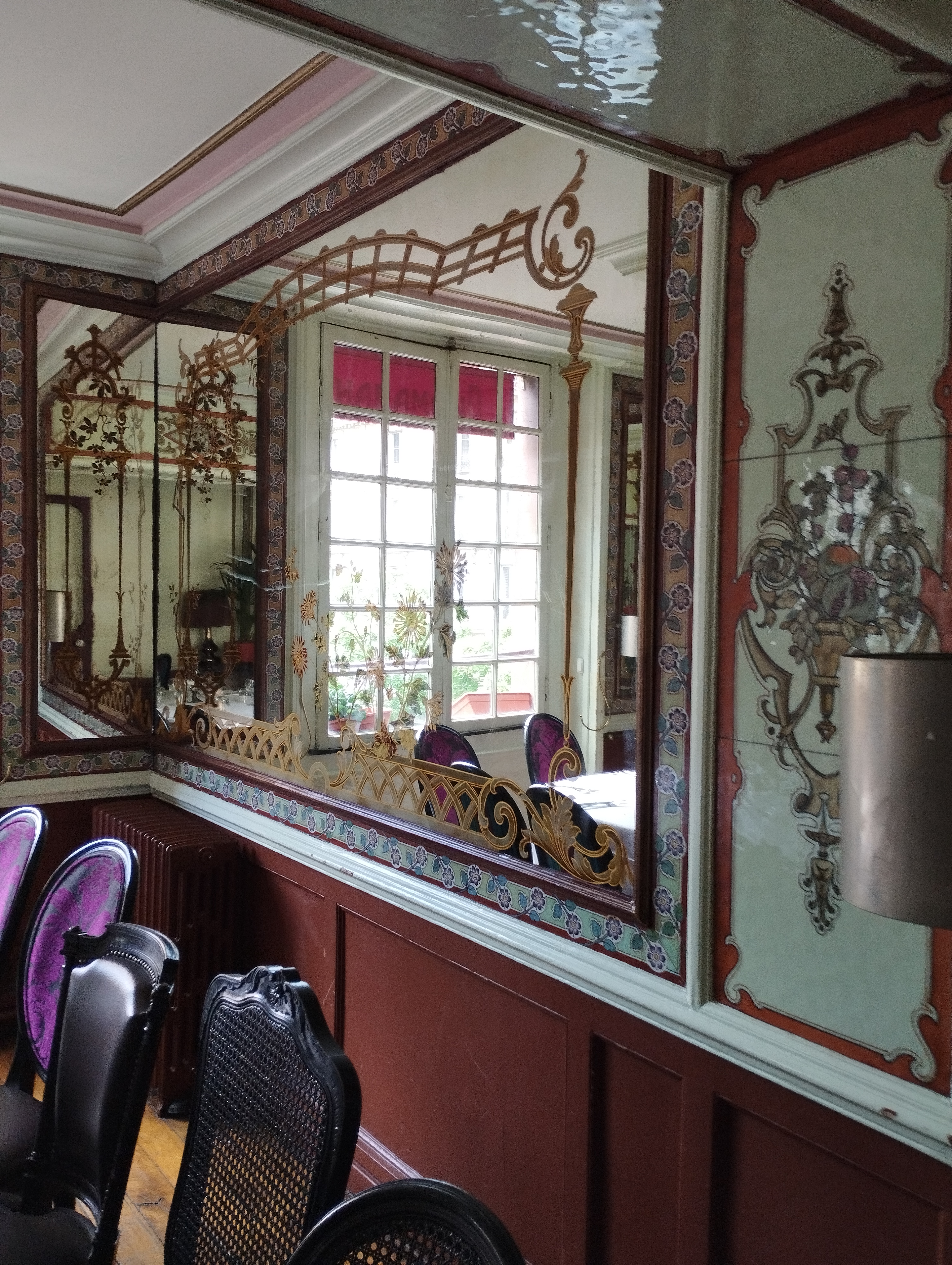 ❝ Cuisine française traditionnelle servie dans une salle à manger aux airs d'antan, avec des murs fleuris et des miroirs gravés. ❞