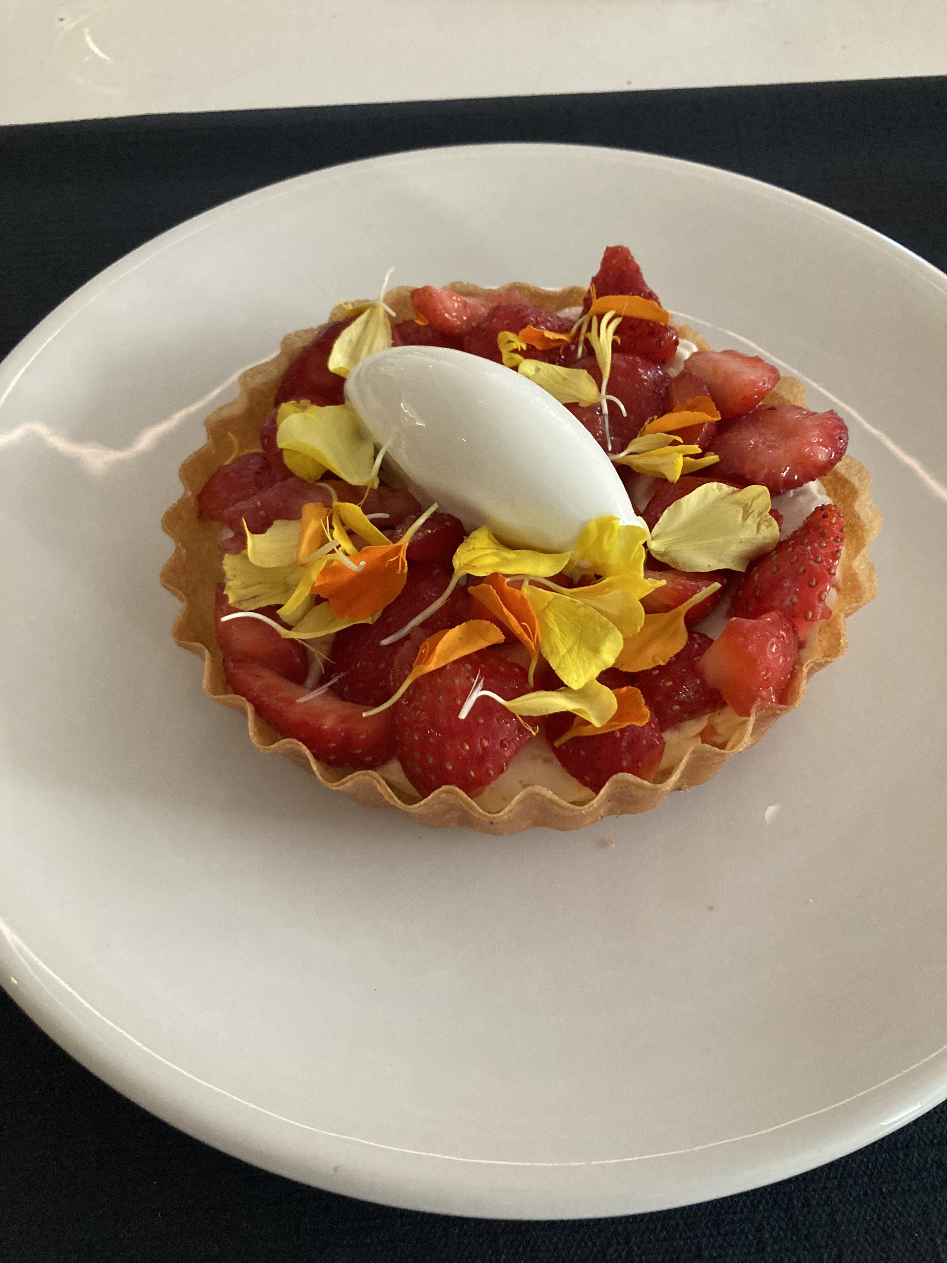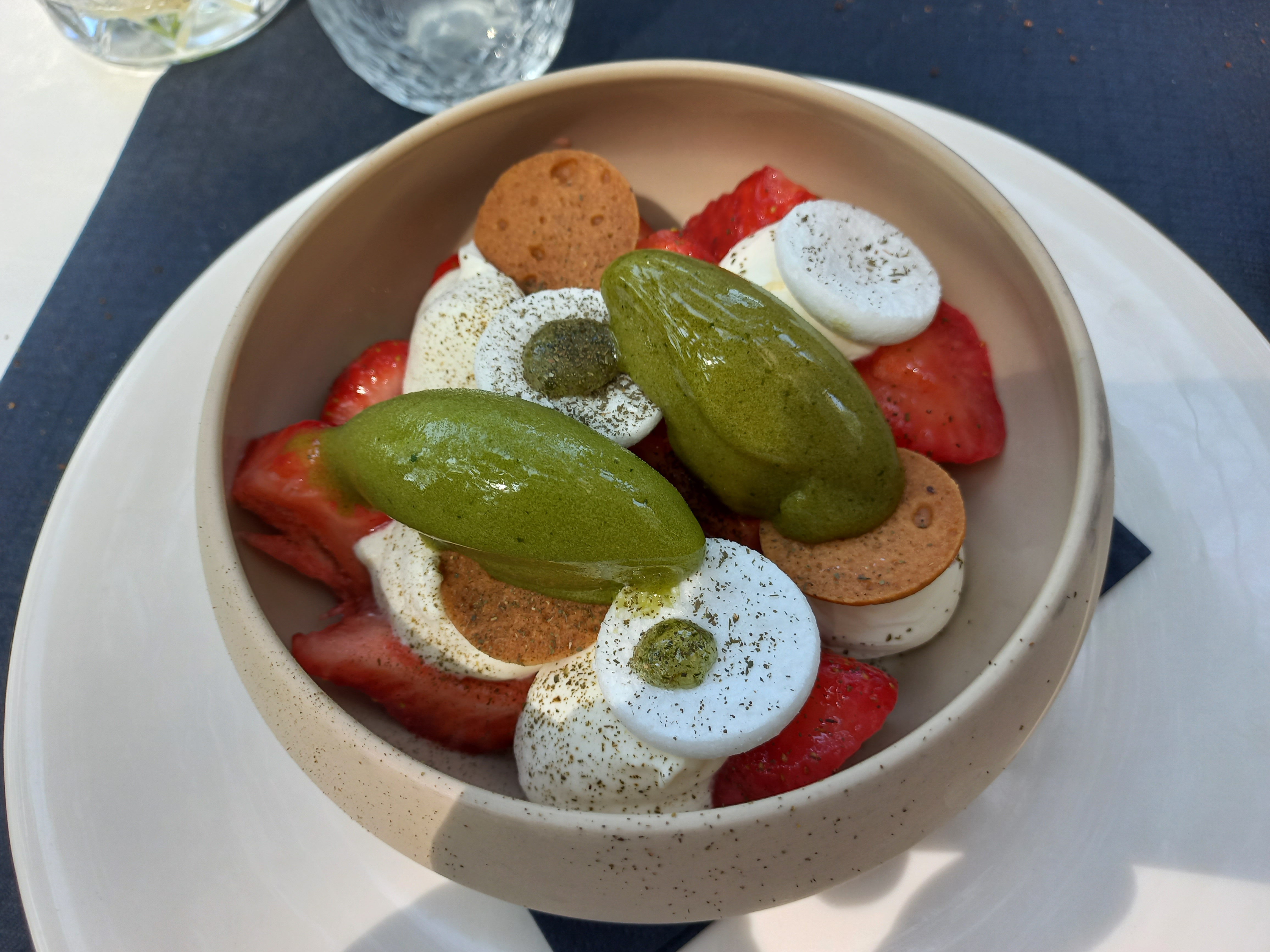 Repas sur la terrasse ombragée. Excellent foie gras à partager accompagné d'un pain complet aux noisettes. Succulent Ris de veau avec quelques morceaux de mandarine, des carottes savoureuses et de la purée de potiron. Fraises accompagnées d'un sorbet à la mélisse exquises et café gourmand. Très bon service.