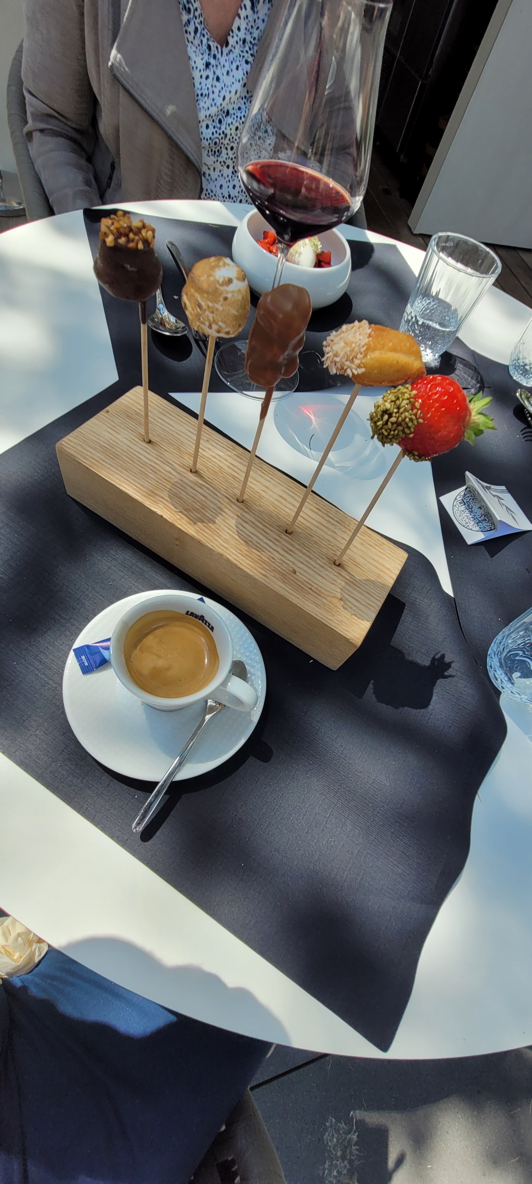 déception au réglement de l'addition....nous avions commandé 2 café simples et avons été étonnés d'avoir eu en accompagnement 4 petits pics surmontés d'une petite boule de chocolat une autre petite guimauve etc....belle surprise pour un simple café ! En caisse on m'explique que le serveur avait compris café gourmand 🤔 à 12€ bref aucune réaction de sa part....drôle de comportement vu le style de restaurant ! dommage