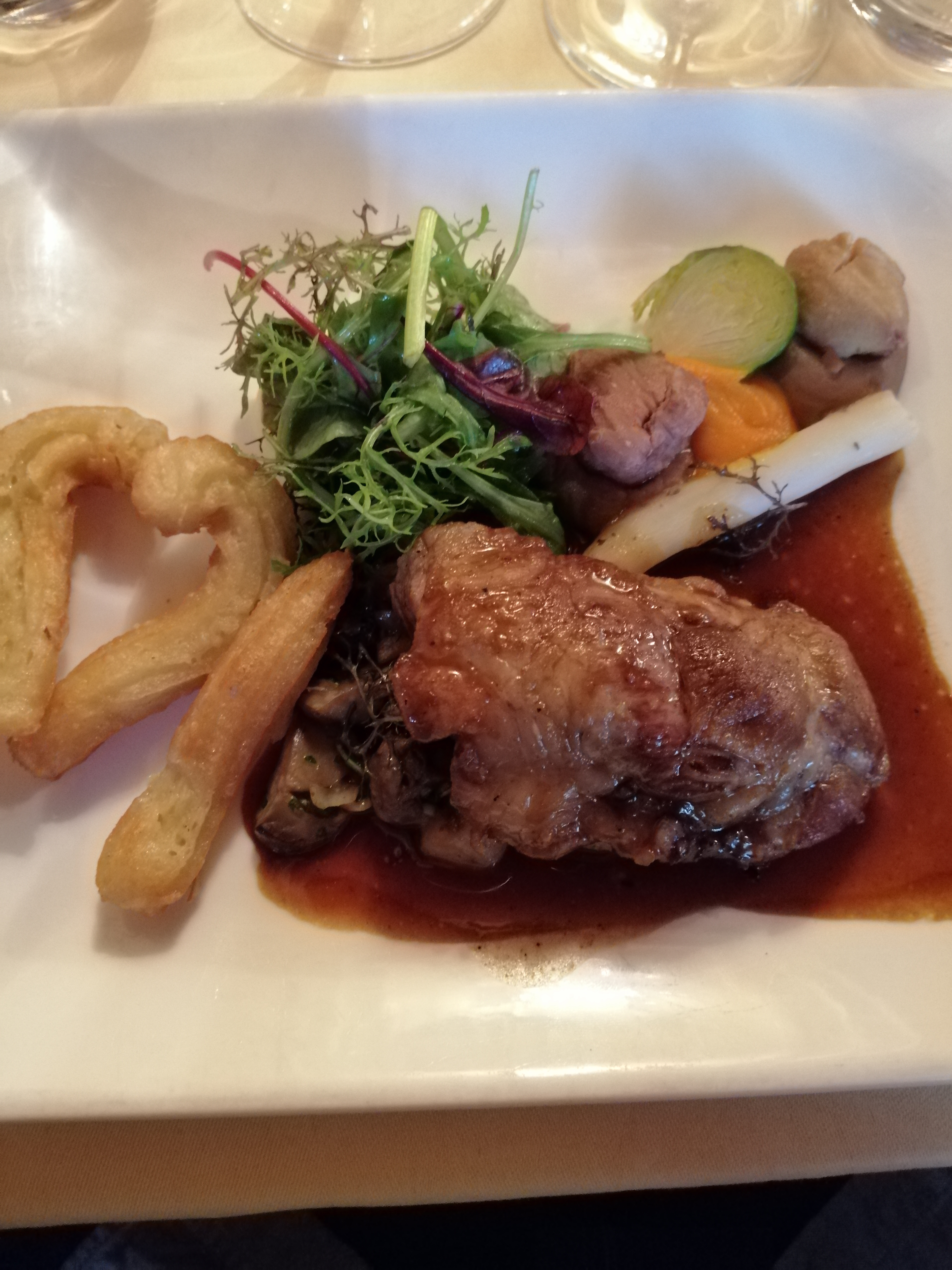 Tout est fait pour être dans le grand standing, tout est impeccable de l'allée pour arriver jusqu'à l'intérieur. Et pour finir ce n'est pas si cher. Nous n'avions pas trop de temps donc nous avons pris le menu à 17 avec entrée-plat ou plat-dessert (il y a 20 et 27 avec entrée-plat-dessert ou à la carte). Bon il est vrai que la note monte un peu avec un bon verre de vin (Chardonnay du Chili) et un café gourmand qui nous amènent à 30 euros par personne. Nous pouvons regretter un peu la quantité car je ne suis pas un gros mangeur et je ne suis pas sorti le ventre juste plein. Mais autrement, le service et l'accueil était parfait, l'entrée était simple (melon et jambon sec) mais c'était mon choix et les produits étaient très bons. Le plat (carré de porc) avec une polenta et une purée de petits pois était très bon aussi ; les 3 desserts du café gourmand de même. Bref, un très bon moment. J'aimerais essayer la terrasse la prochaine fois car l'intérieur est un peu sombre. Petit bémol pour les amateurs de bière, il n'y a pas de pression et peu de choix en bouteille. Autre avantage, pas de soucis pour se garer. --- complément suite à une autre expérience moins réussie. Cheminée allumée qui a enfumé le restaurant, plat moyen et service trop long. Peut-être un coup de pas de chance mais je retire une étoile.