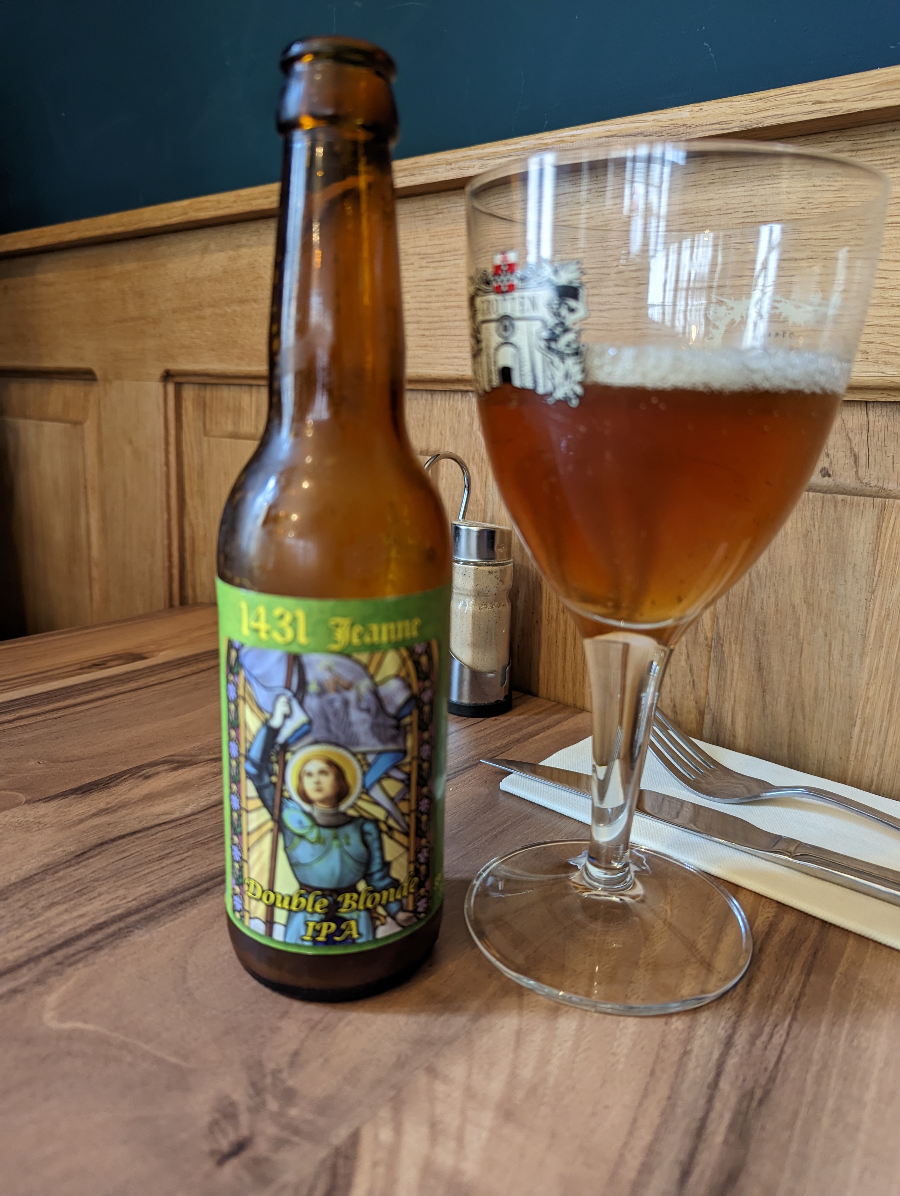 Accueil très correct Belle découverte pour la bière Jeanne 1431 Fish and chips Normand ? Je ne sais pas où trouver la Normandie.. L assiette de fromages très bonne Le pain a du goût : difficile à trouver de nos jours Un petit bémol sur la conformité électrique des toilettes.......