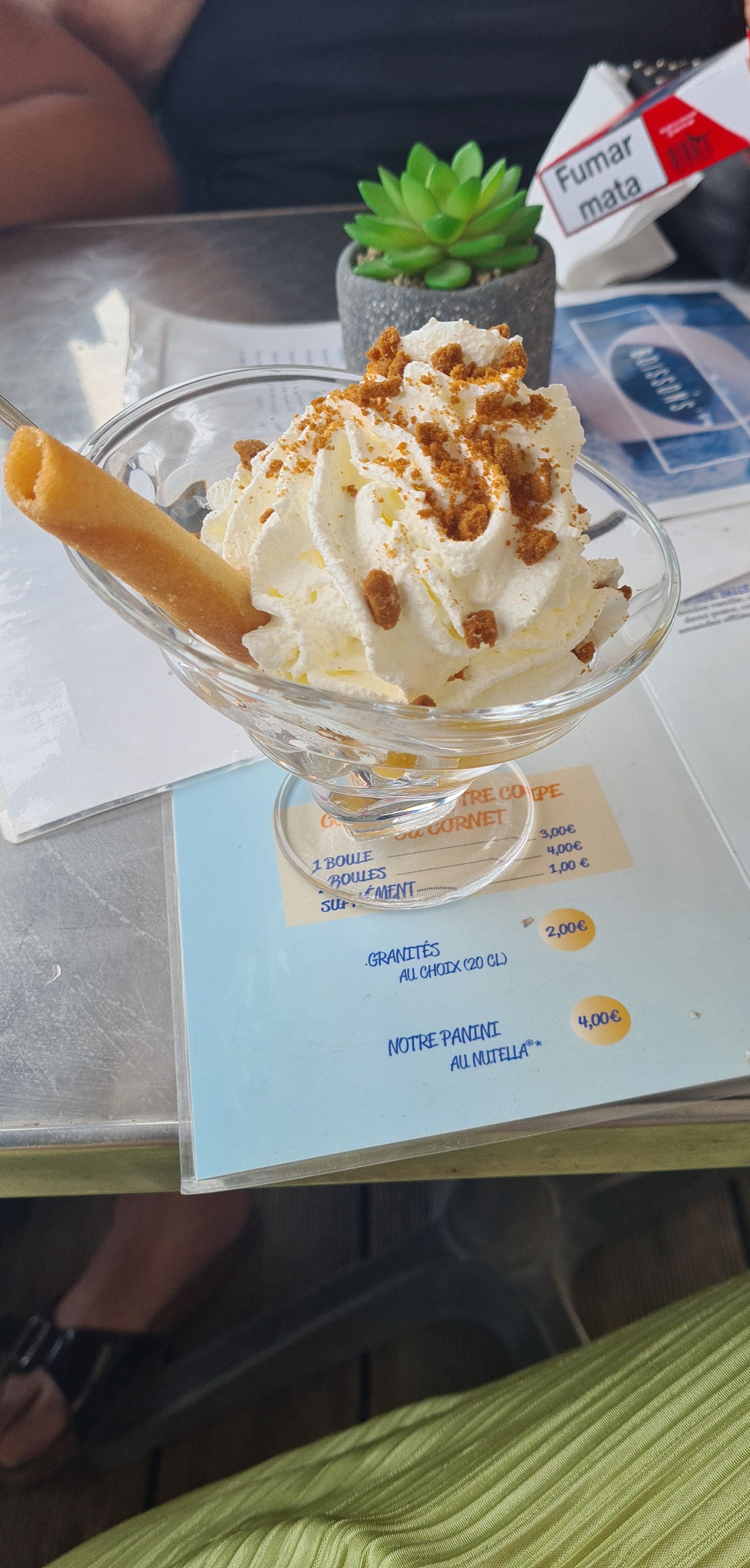 Un Snack-Restaurant-Glacier et magasin, dans canet plage. Nous sommes très bien accueilli par la patronne des lieux. Nous prenons deux granitas ainsi que deux glaces, en coupe et à l'unité. Les deux granitas Blue sont super. Bien coloré bien goûtu et bien frais. Le prix est très raisonnable au vu de la qualité et du service. Comptez deux euros l'unité. Une glace en coupe au parfum caramel et vanille avec ça chantilly. Génial, le gout de caramel est très present. La chantilly est bonne. Une boule de glace barbapapa, super bonne. Un gout esquis. Tout en ayant vue sur la mer. On profite quelques instant du frais offert par la terasse ombragée. Les gérants du lieu sont tres sympathique. Idéal pour une petite pause au bord de la mer, Un tarif raisonnable et une tres bonne qualité. Je vous remercie madame pour votre bon acceuil.
