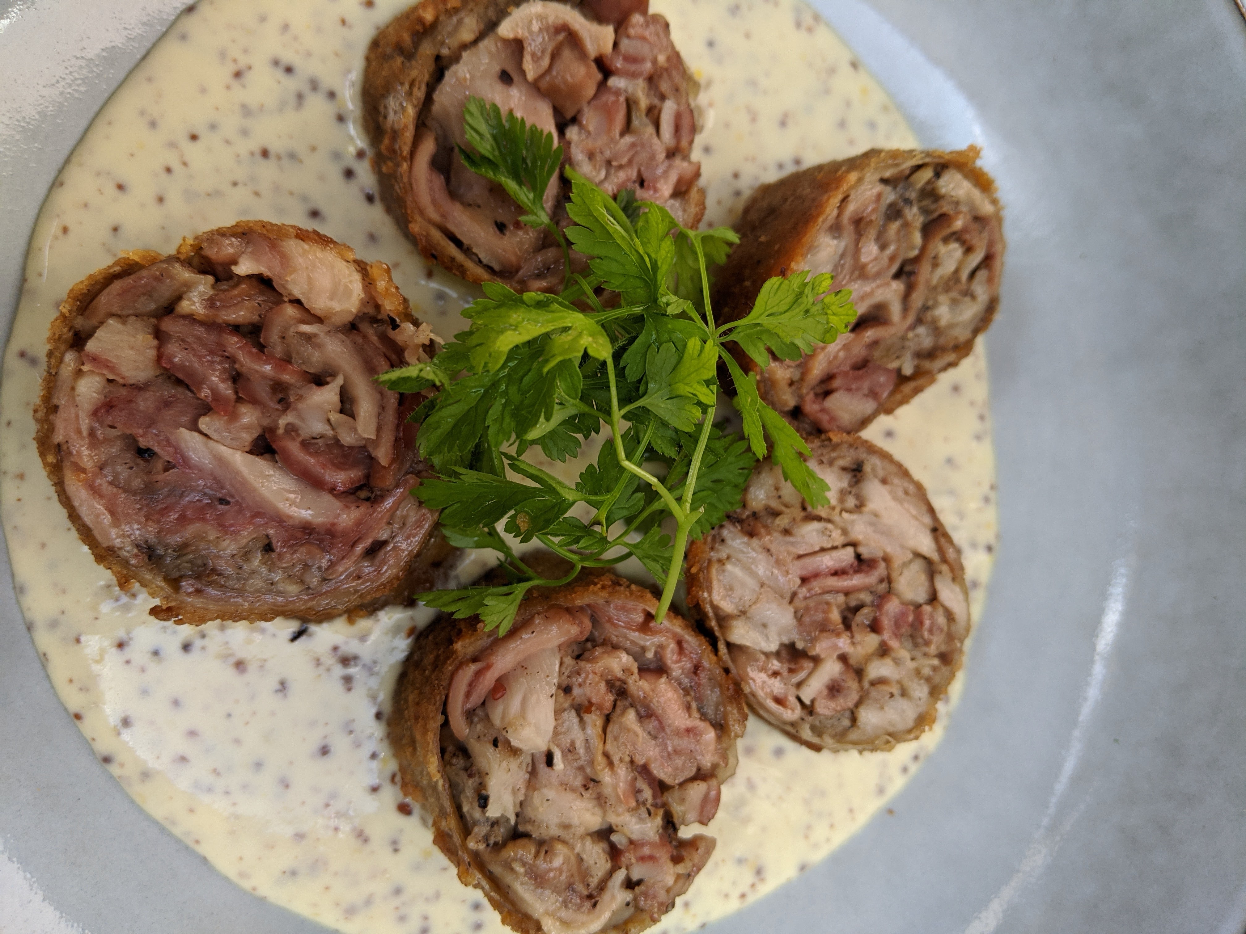 Belle présentation d’assiette mais simple du poulet avec une sauce champignons sans plus. Sinon Bon service.