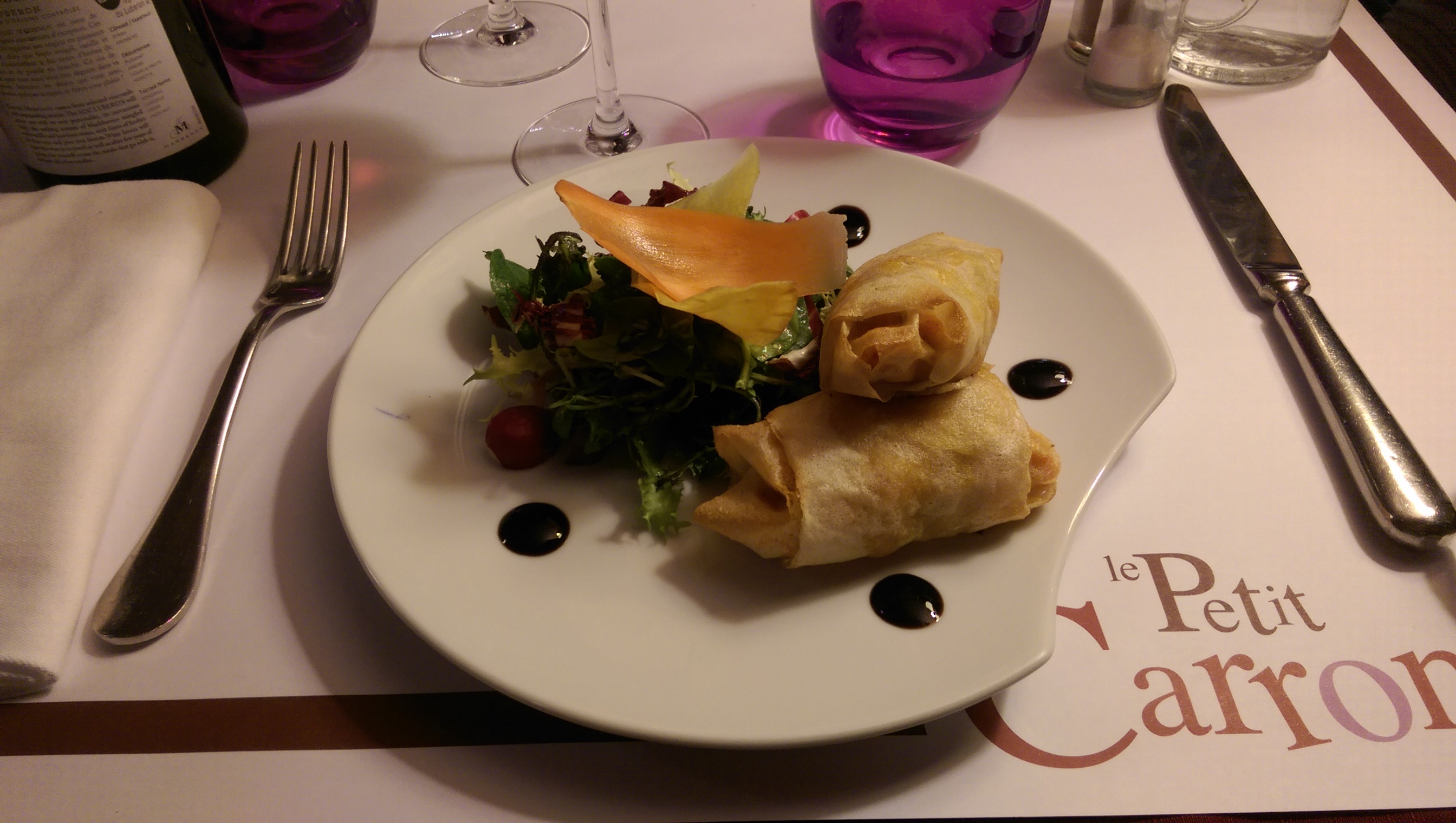 Repas à quatre, veille de vacances. Plats assez corrects, mais garnitures un peu justes. J'ai demandé au patron si il connaissait l'origine du nom de son établissement ? Il ne savait pas et je lui ai appris que le Carron est le lard gras blanc qui se trouve sur le dos des cochons élevés à la campagne et qui se consomme en tranches fines. Délicieux cru avec herbes aromatiques, ou cuit utilisé en bardes... Fameux morceau pour moi, connu en Auvergne et en Languedoc sous le nom de Carron , et en Italie comme Lard de Colonnata .