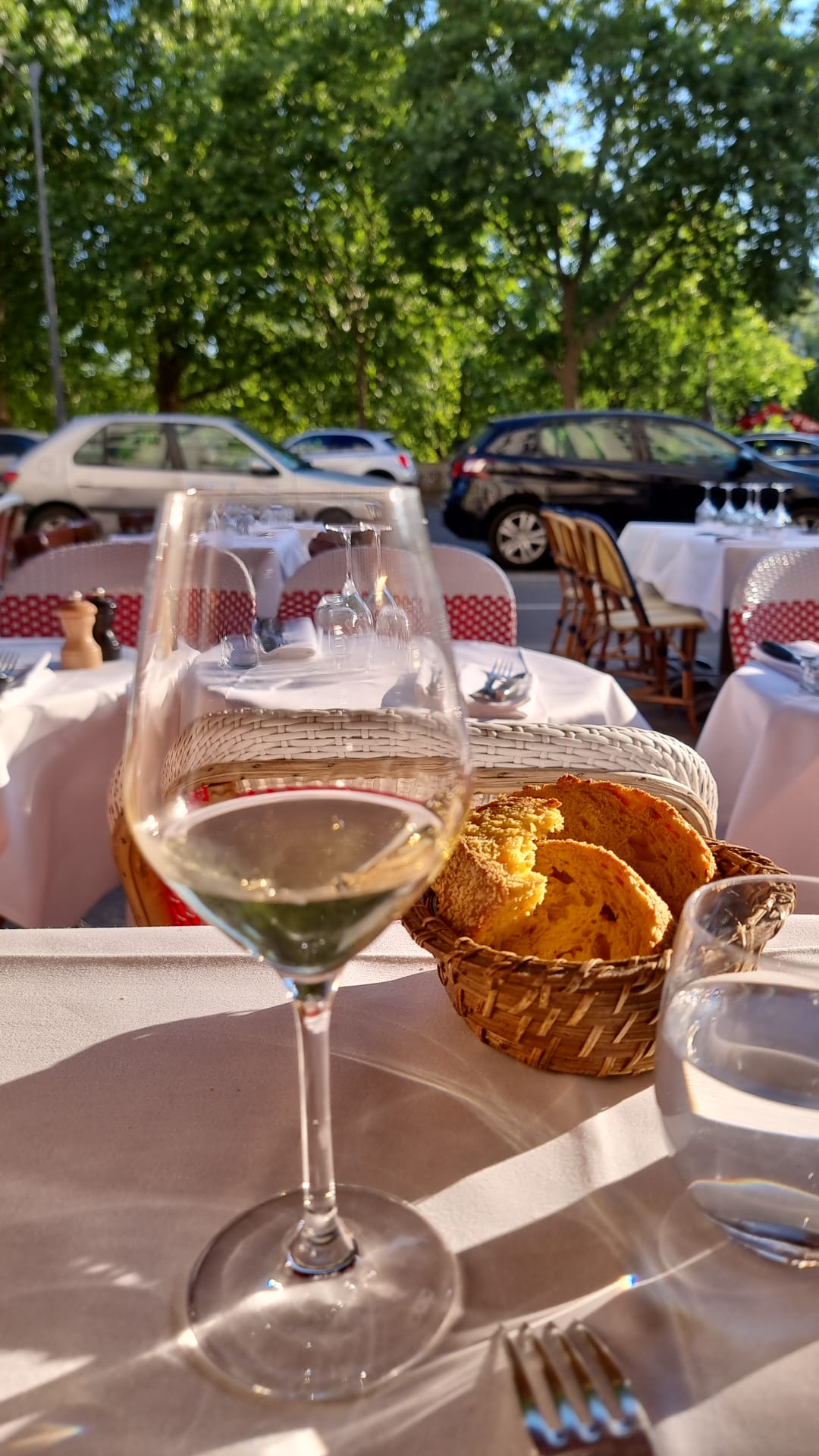 Apéro en terrasse avec deux très bons verres de vin (10€ chaque mais ça vaut le détour !) Personnel très sympathique et lieu emblématique des bistrots parisiens.