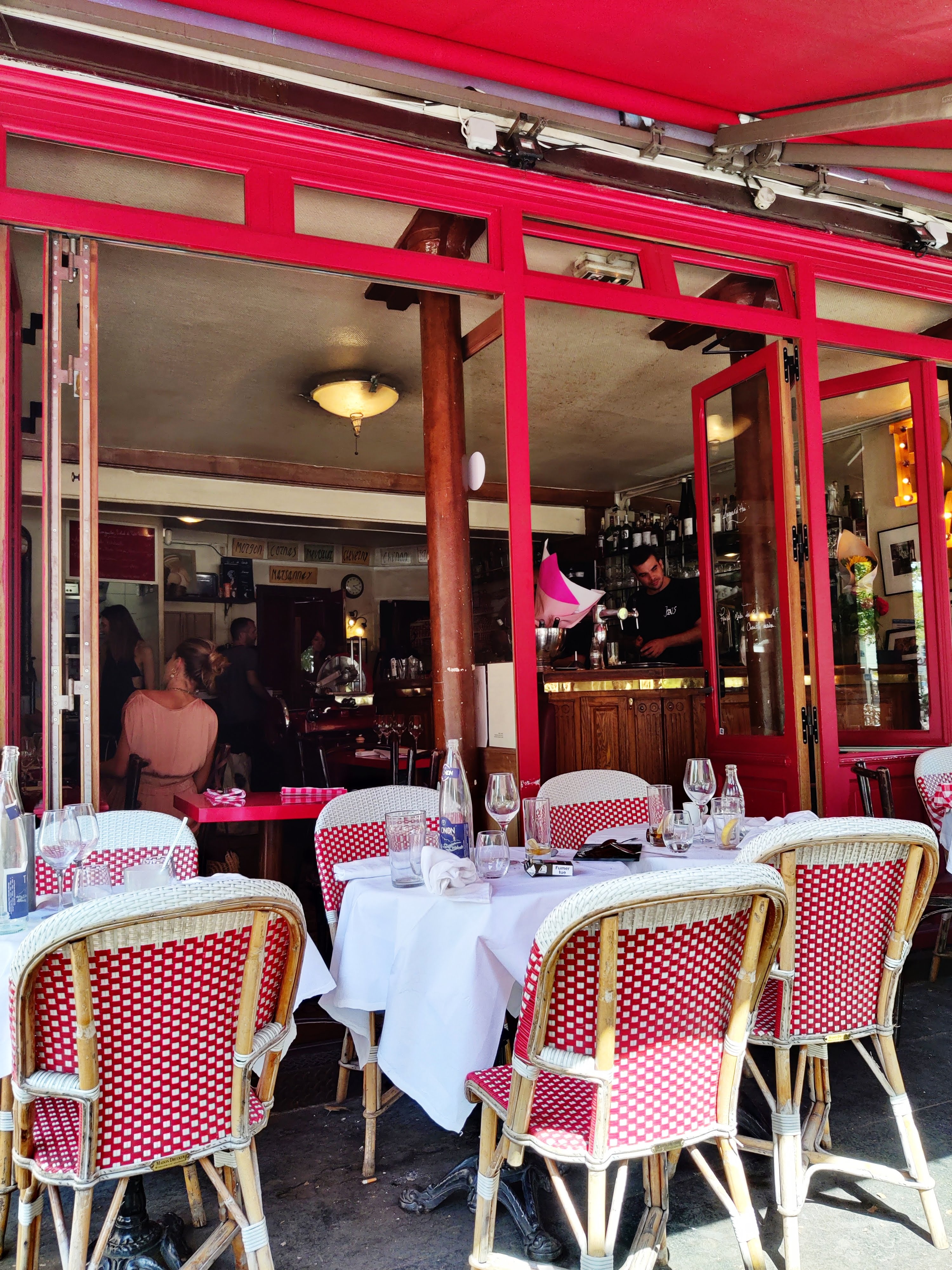 Représente parfaitement ce qui tue les vrais bougnats ; ça y ressemble, ça fait un peu authentique, il y a les incontournables carreaux rouge et blanc, les chaises typiques, le sol carrelé comme il se doit. Et le verre de vin du pays de l'Hérault à 9€, l'assiette peu généreuse, la nourriture banale avec un intitulé pompeux (pour être honnête je n'ai pris que l'entrée du jour, peut-être aurais je été agréablement surprise avec un autre plat mais j'avoue que la pièce de boeuf de ma voisine ne me tentait guère...) Pour ce prix autant aller dans un quartier cher, la vue y est au moins jolie, ou dans un vrai restaurant de quartier, il y en a encore heureusement.