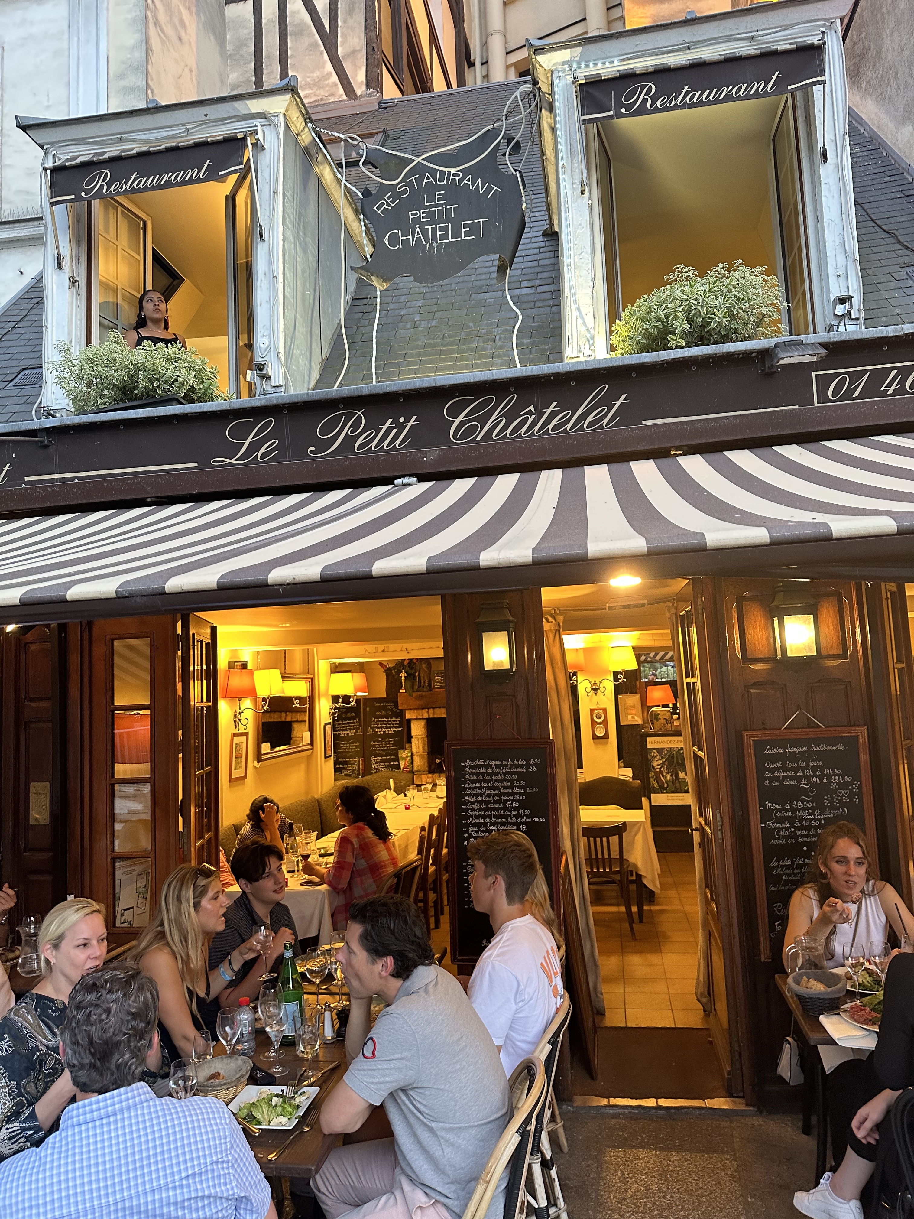 Restaurant vraiment très sympa, à l'ambiance cosy et chaleureuse. C'est tout petit, et c'est très bien comme cela (il y a une très belle salle à l'étage, mais plutôt réservé pour les week-ends ou les événements, je pense). Dans un quartier hypra-touristique et regorgeant de boutiques et restos à touristes, on pourrait s'attendre à une catastrophe, car le Petit Châtelet bénéficie d'un super emplacement, près des quais, en face de Notre-Dame. Eh bien, non. Il y a quelques touristes bien sûr (difficile d'y échapper...), mais peu qui passent la porte par hasard ; on a donc une clientèle assez locale, gens du quartiers et habitués. Personnellement, j'y suis allé plusieurs fois à divers titres (perso, pour des repas plus business, etc.) et j'ai toujours été satisfait ainsi que mes convives. L'accueil est bon, ni obséquieux ni agressif, on se sent chez soi ; le patron joue le jeu, sans en faire trop. Les plats sont généralement excellents, beaucoup de renouvellement (l'ardoise du jour est plus fournie que la carte permanente), et un effort sur les produits de saison. Le patron n'hésite pas à vous orienter et vous faire des propositions, écartant certains plats au profit d'autres selon vos goûts et vos envies. En ce qui concerne les prix et le rapport qualité-prix, je trouve personnellement que c'est vraiment très raisonnable, en plein cœur de Paris, et pour le contenu de l'assiette. On a des plats inférieurs à 15€, ce qui est un exploit par les temps qui courent. Pour moi, l'assiette (et son contenu) dépasse largement le cadre brasserie habituel, pour des prix équivalents ou inférieurs. Après, tout est question d'appréciation personnelle. En synthèse, un de mes points de chute favori quand je veux inviter quelqu'un dans ce quartier.