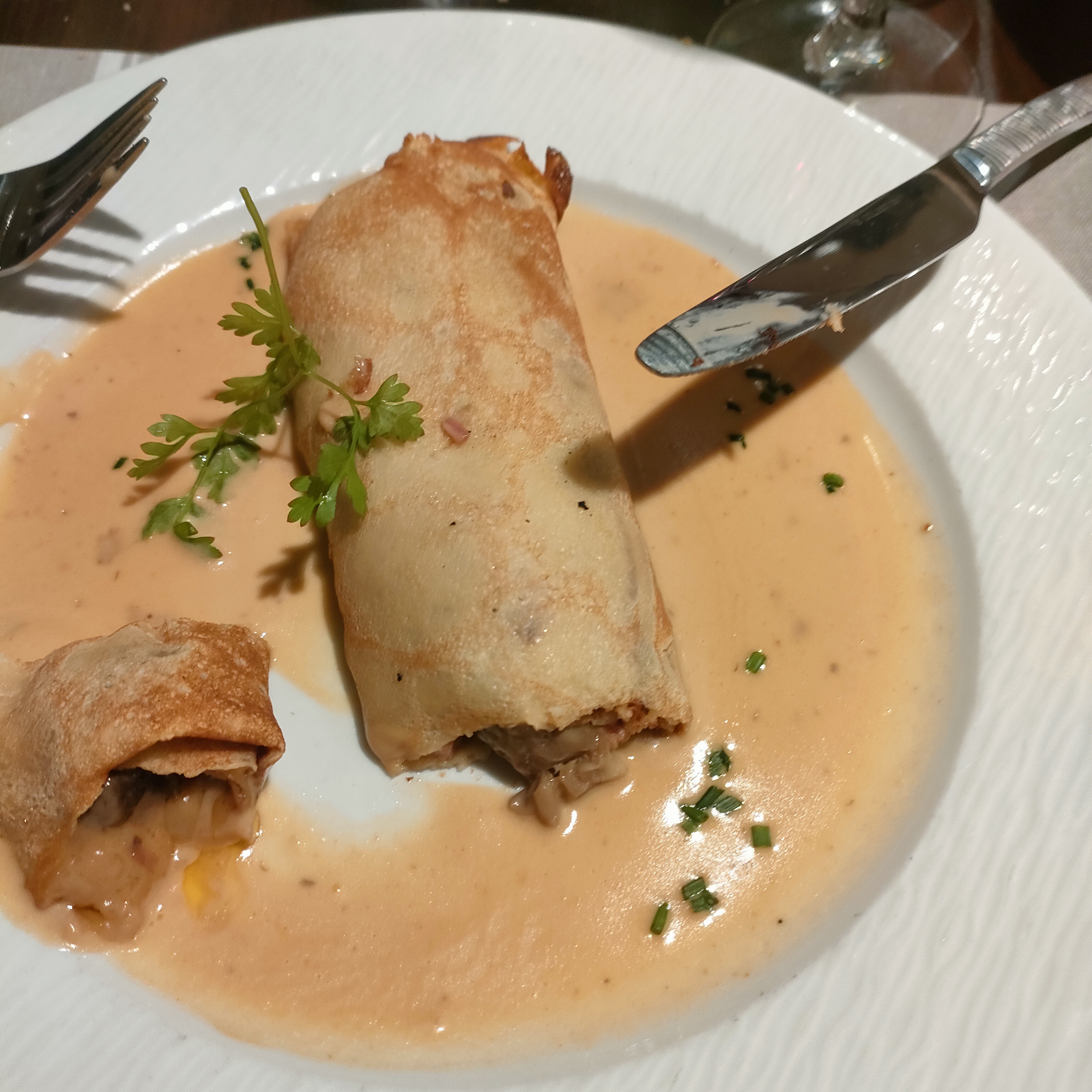 Déçu, par rapport à la dernière fois. L'entrée était très bien, croustillant de poisson et la sauce très bonne. Le plat, cuisse de canard à l'échalote et frites maison. Manque de sauce, les échalotes étaient fades.