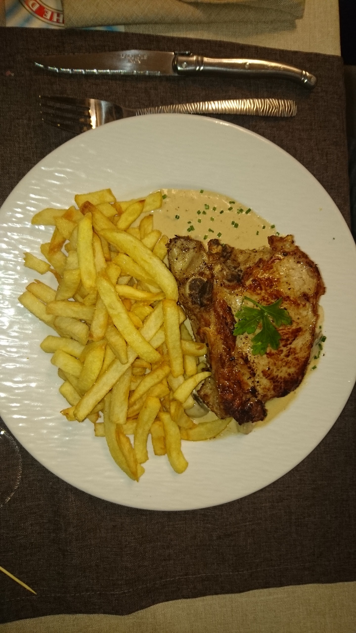 Une côte de veau servi avec des frites si on peu appelait sa des frites, pour moi c'était des déchets de pomme de terre pour 24,90€ le plat, c'est un peu excessif et le tiramisu pas terrible je ni retournerai pas