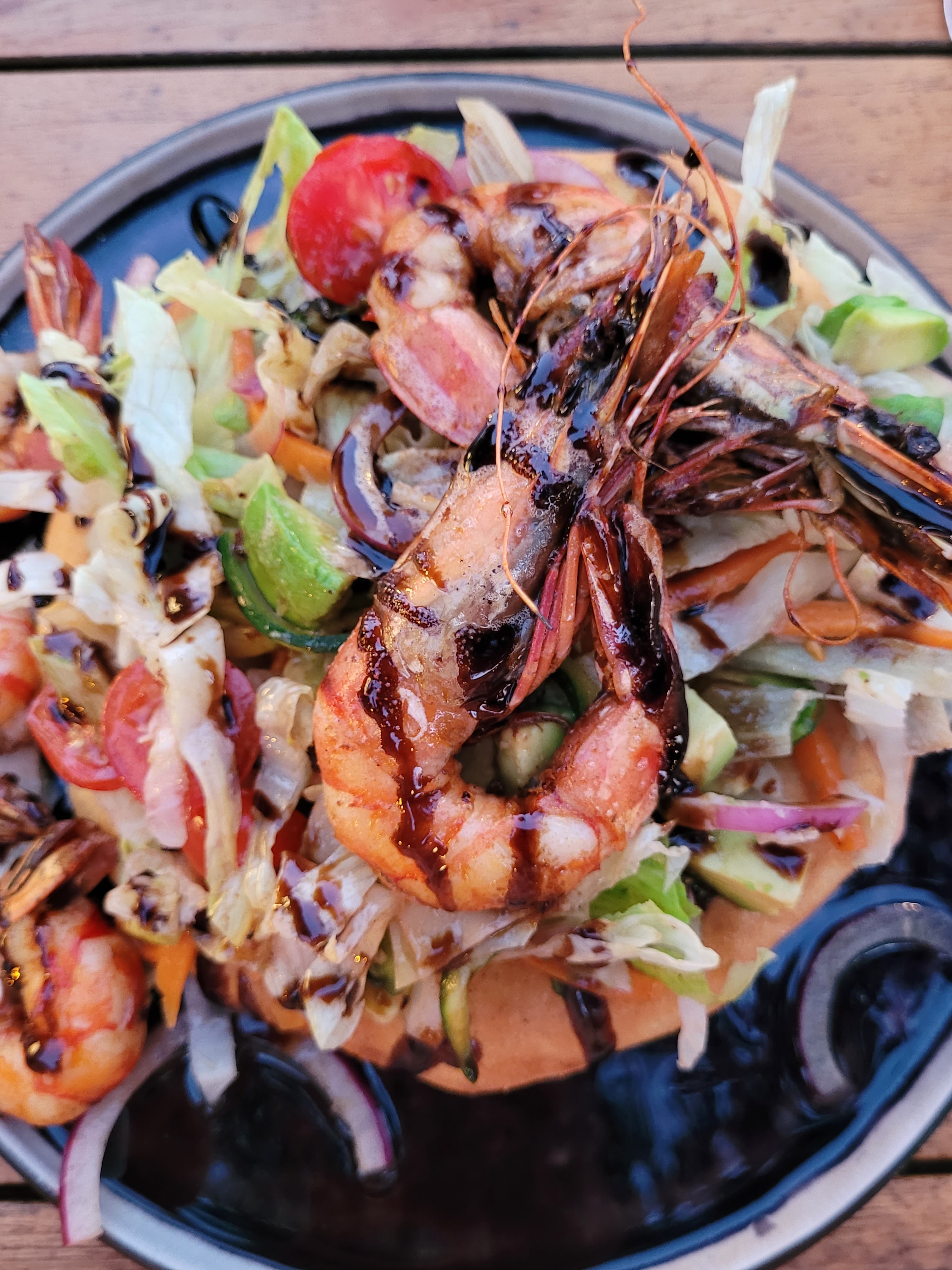 Cadre magnifique, vue mer splendide. Cuisson du loup de mer excellente, gambas idem Bien reçus, dommage que la météo nous a pas permis de finir le repas en terrasse 😋
