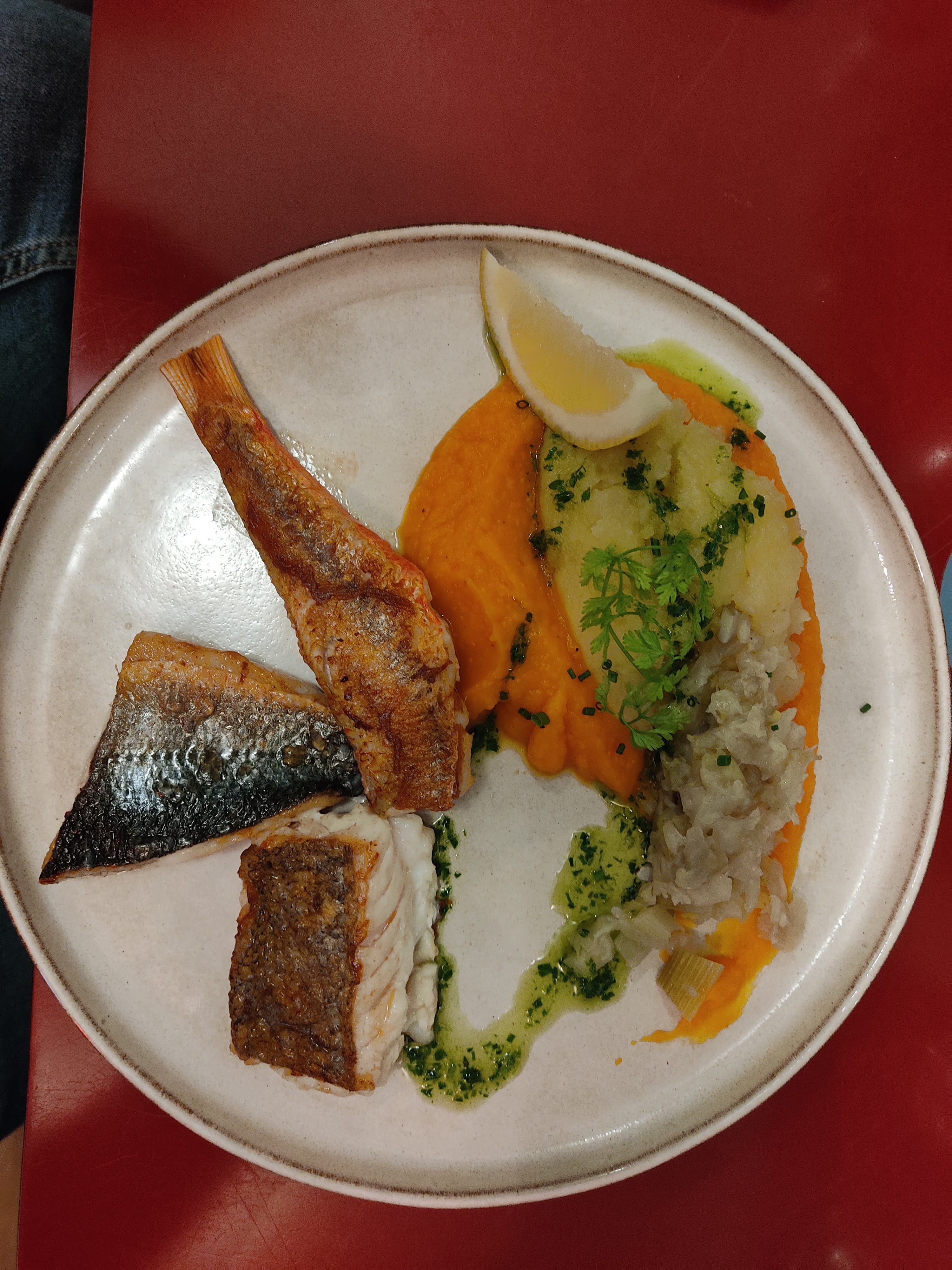 Cet endroit nous a été recommandé pour les fruits de mer, mais nous a laissé très déçus. La qualité du repas servi était inférieure à la moyenne. J'avais des huîtres en entrée et elles étaient bien. Mon mari a pris la soupe de poisson et c'était ok. Pour le plat principal, nous avons tous deux choisi la sole entière, mais je ne suis pas sûr que ce soit ce qui nous a été servi. Ce n'était pas un poisson entier, mais plutôt quelques petits poissons accompagnés des légumes les plus savoureux que j'ai jamais goûtés. Purée de pommes de terre non assaisonnée, grumeleuse, sèche et ressemblant à de la colle. L'artichaut n'était pas assez cuit et le morceau de citrouille était extrêmement fade. J'ai oublié de prendre des photos du repas servi, mais je joins une photo de mon assiette après avoir fini de manger.... Je ne recommande ce restaurant à personne.