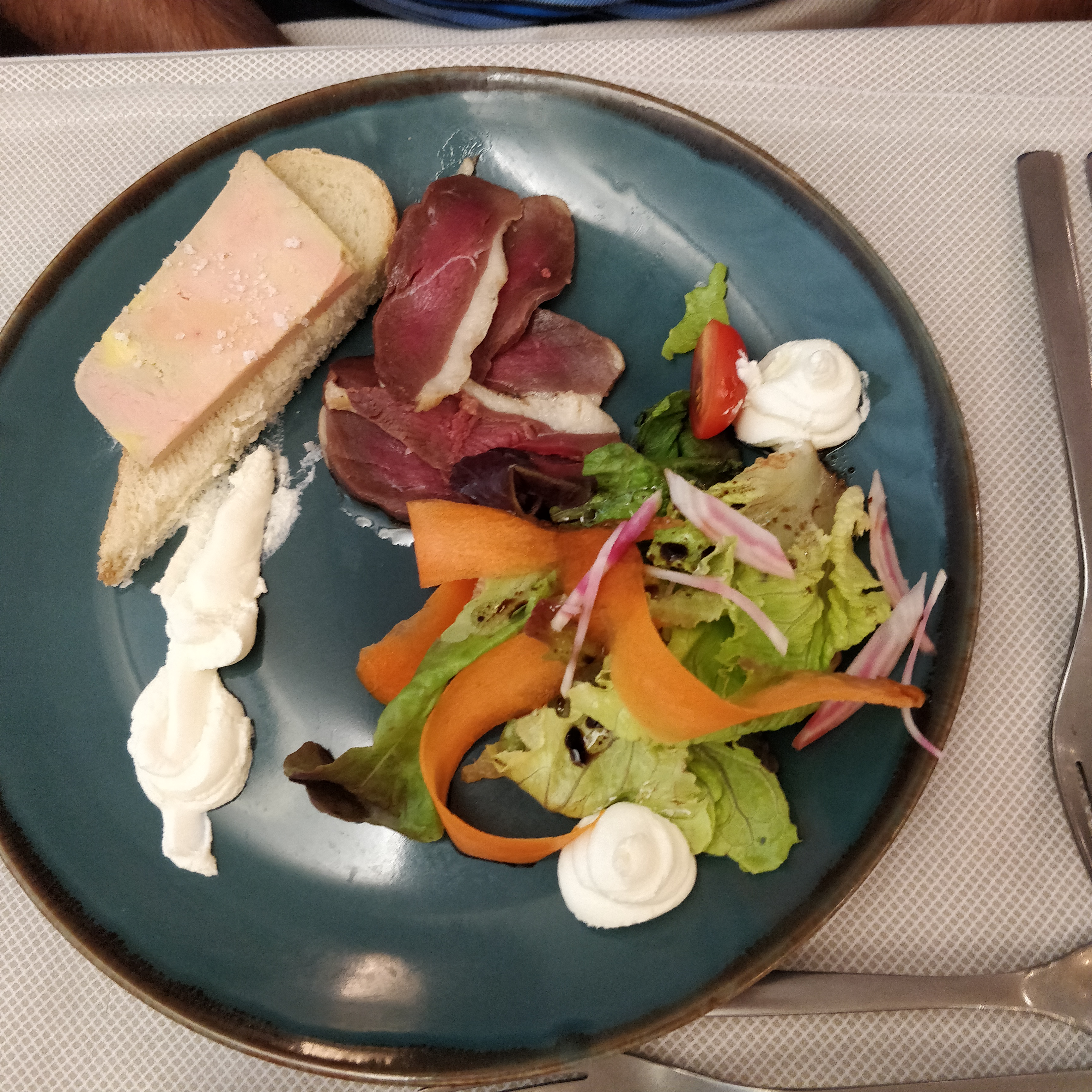 Très cher, quiche pas cuite, sans assaisonnement. Plat quasi froid, une 1/2 carottes, 5 petites pommes de terre grenaille et 3 branches d'épinards. Le magret n'est pas fameux, pas tendre. Repas froid. Dessert pas au top non plus. Pour le prix je n'y reviendrai pas