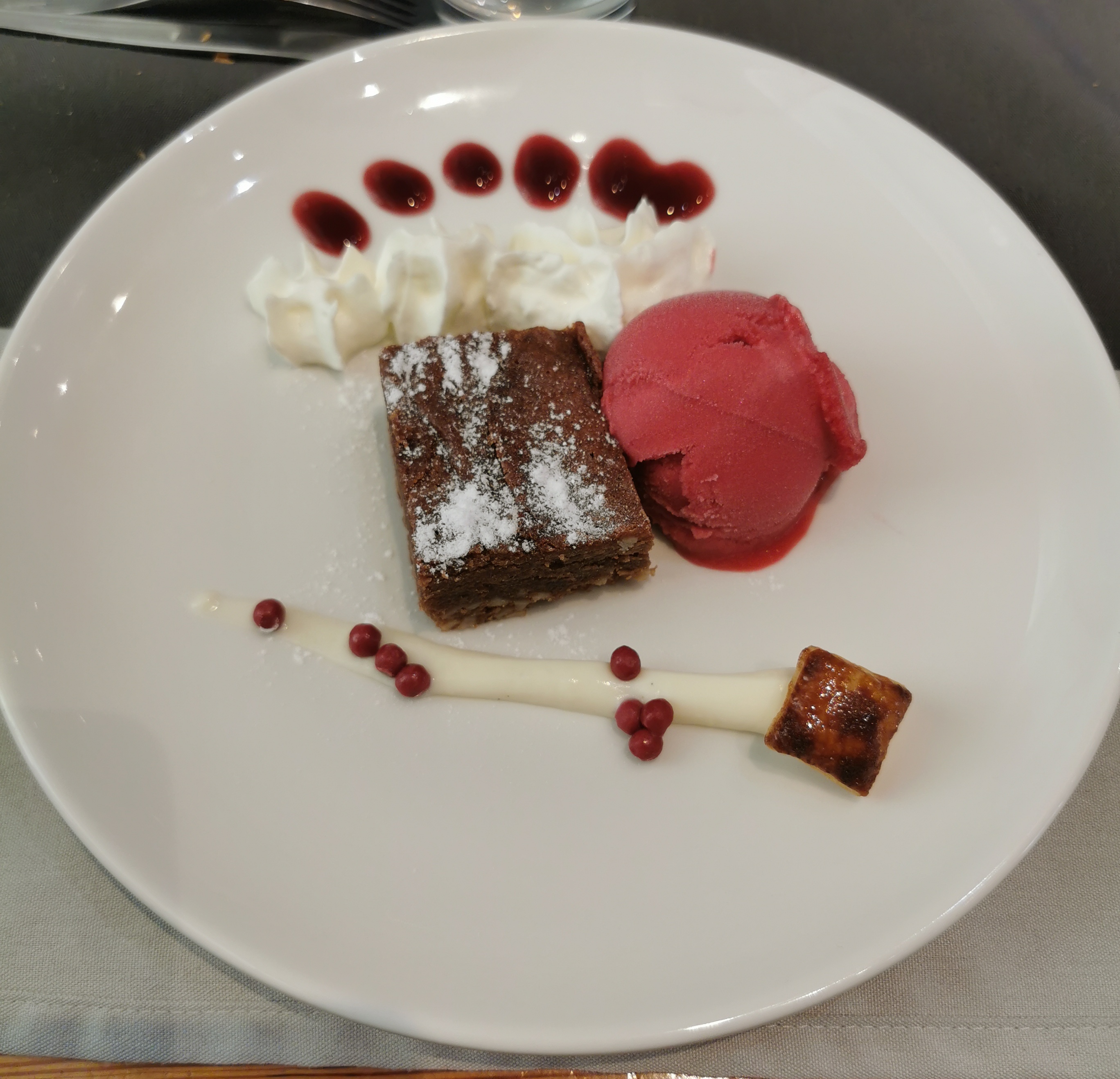 L'attente a été interminable sans boissons puis entre les plats, aucun grignotage apéritif. Les plats sont arrivés froids. Le dessert était banal avec en plus un fondant au chocolat très liquide, mou et insipide. Qualité et quantité laissent à désirer au regard du prix élevé. Je ne renouvellerai pas l'expérience.