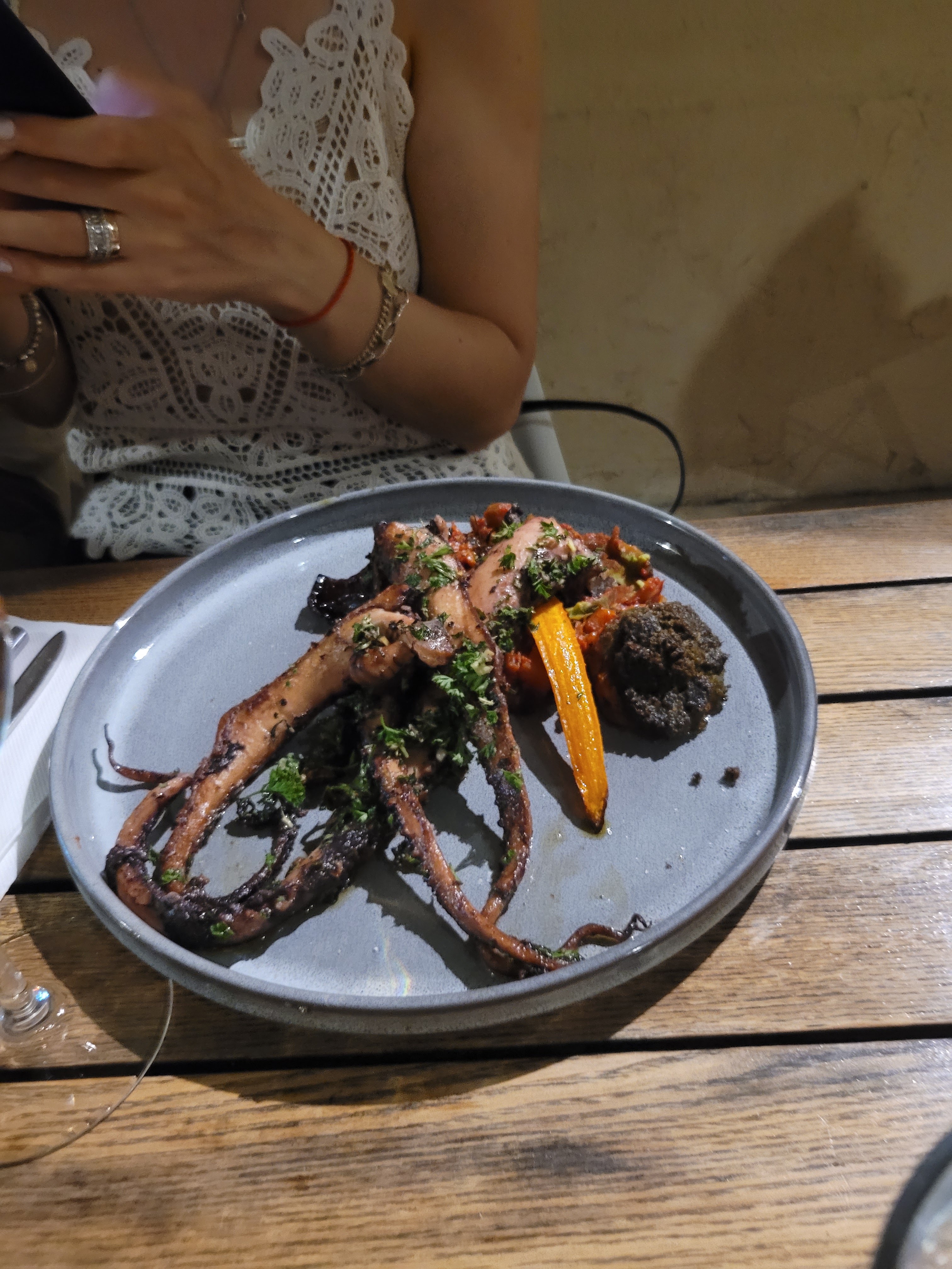 Nous sommes régalés avec la suggestion du jour : tentacules de poulpes grillées. Tables dressées dans une ruelle au calme, service impeccable. Accueil souriant