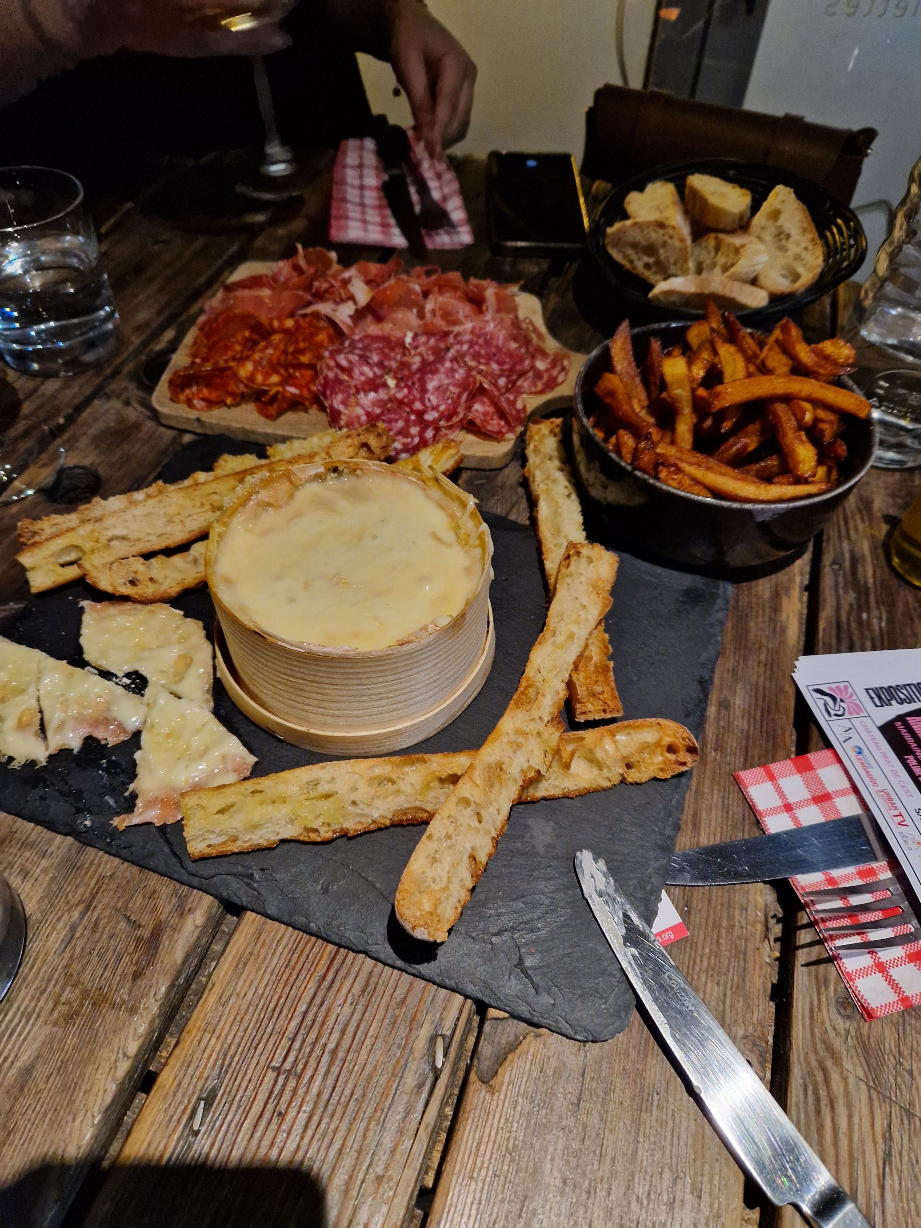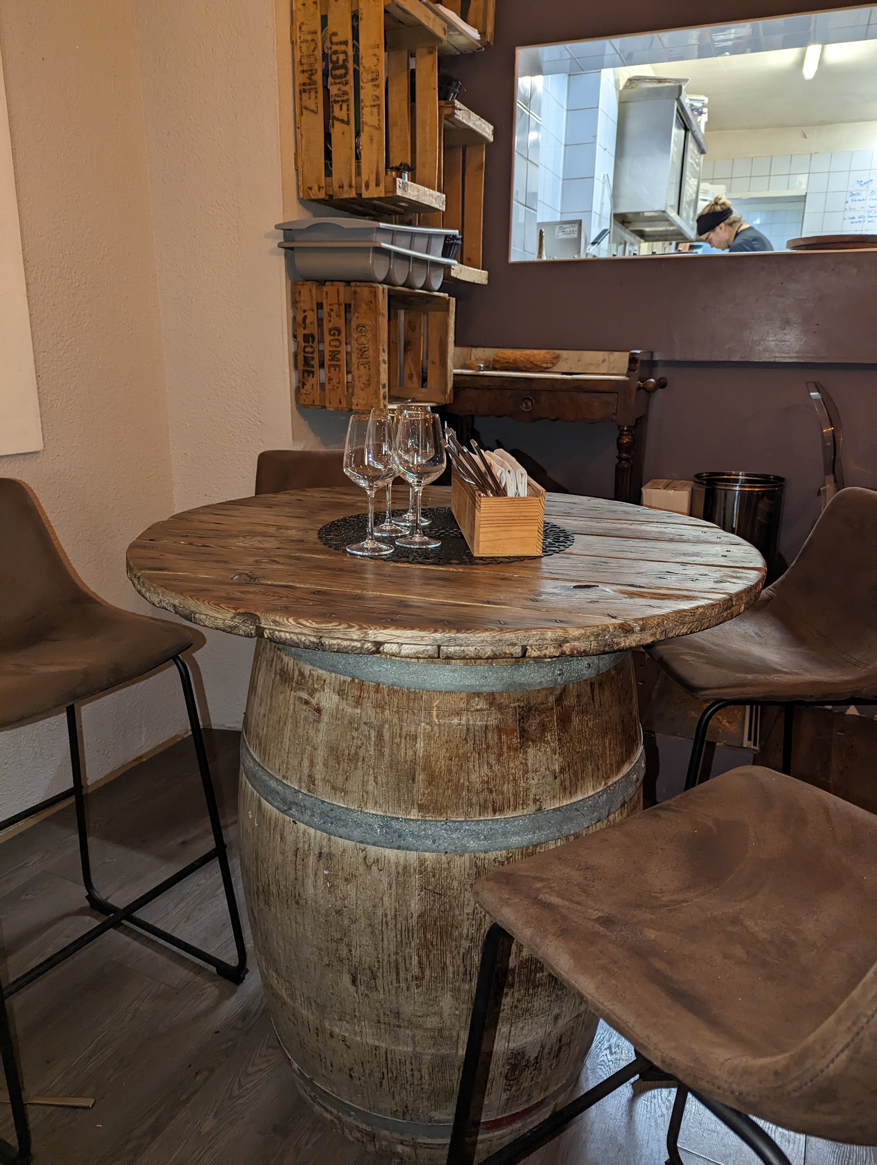 Bonne adresse pour prendre l'apéritif ou déguster du vin assis autour d'un tonneau. Le restaurant propose des tapas ou plutôt des petits plats très bons à déguster, mais difficilement partageables entre amis. A quatre, nous avons partagé 5 petits plats et une bouteille de vin, plus 4 desserts pour environ 85 euros. Rapport qualité prix très honnête.
