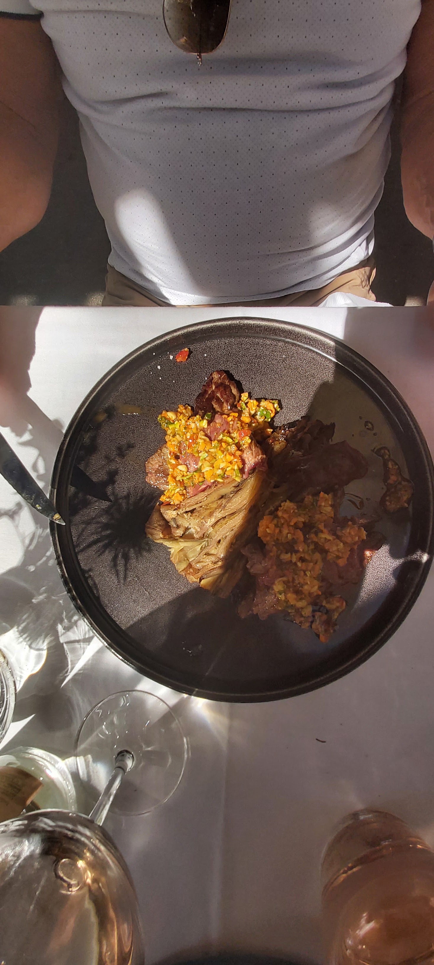Plats et desserts délicieux. La viande était très très bien cuite et fondante . Le dessert était inattendu niveau saveur ( chocolat , huile d’olive , piment, caramel ) mais j’ai adoré Très bon service, serveur chaleureux et connaît bien les produits Chiens acceptés et ils ont eu l’attention de lui donner un bol d’eau . Je recommande