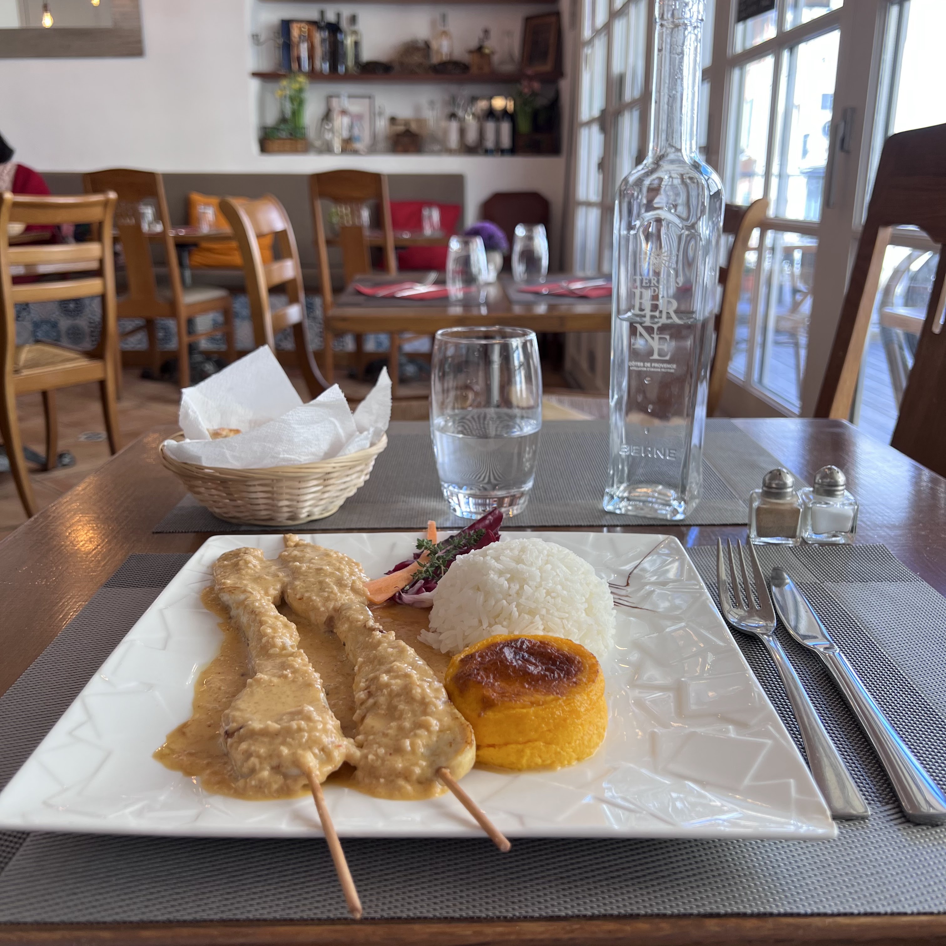Je me suis régalé avec le wok de poulet au cacahuètes. Le cadre est très sympa et l'accueil est très chaleureux. Je recommande !!