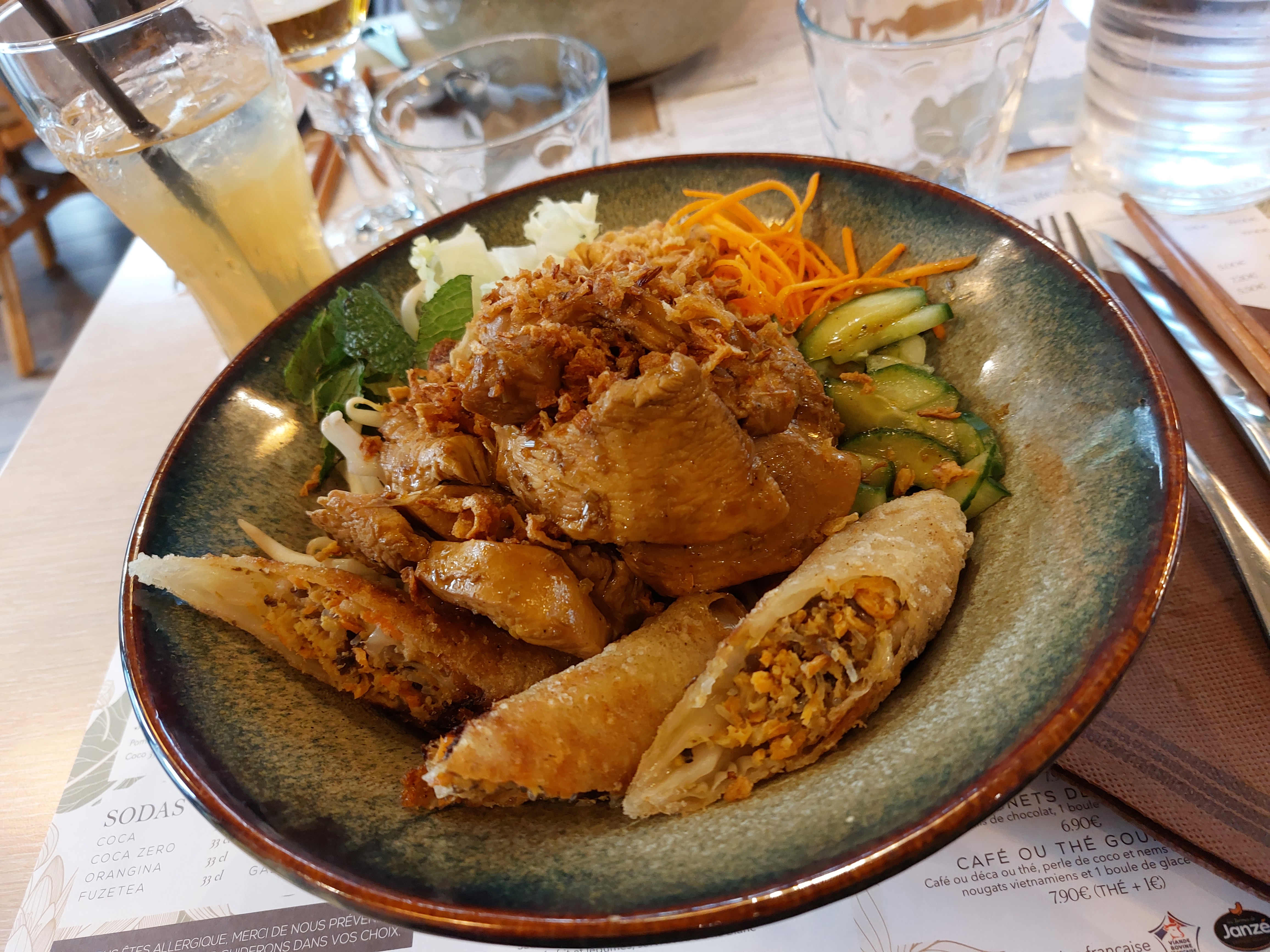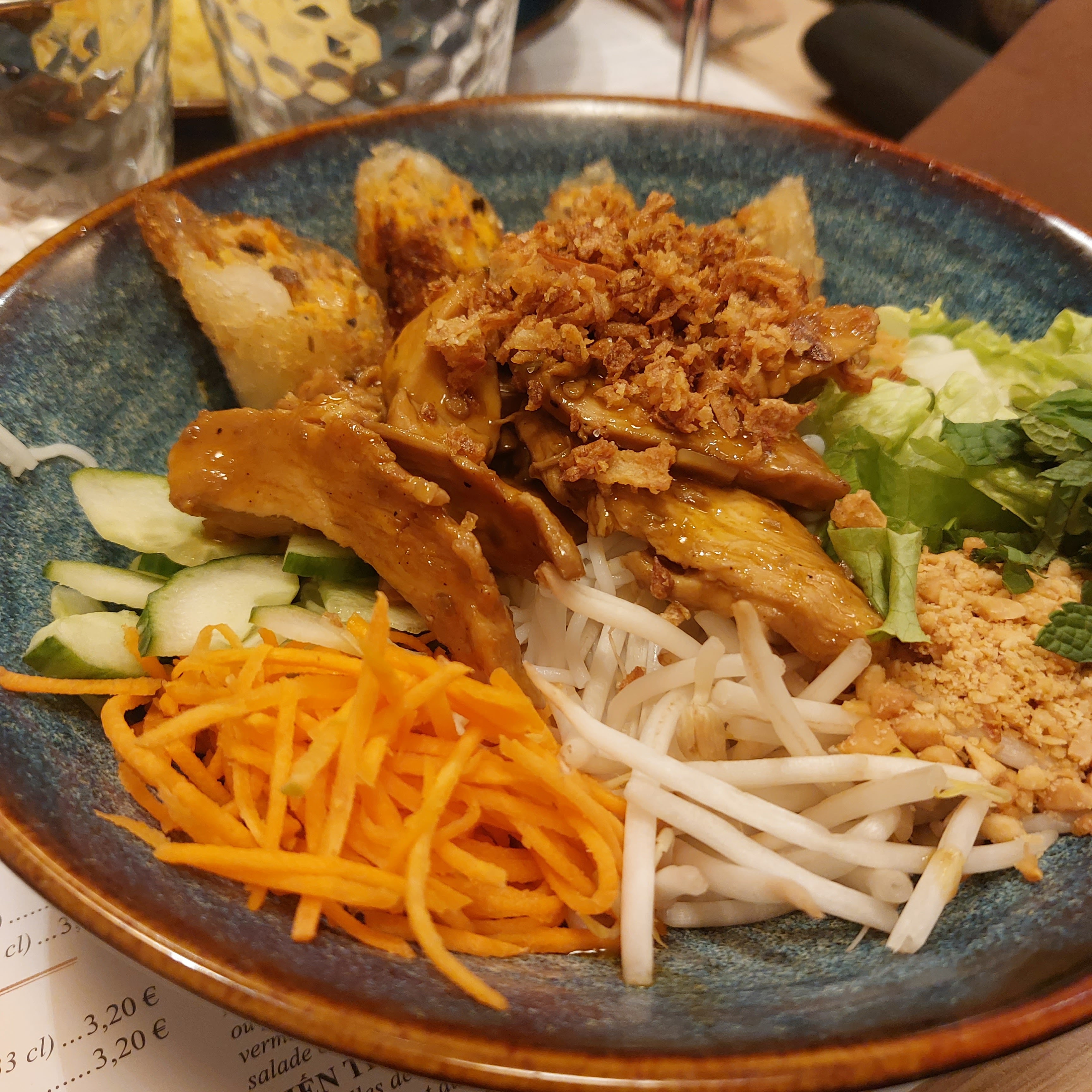 Je suis venu tester ce restaurant recommandé sur internet comme le restaurant vietnamien incontournable de Rennes Accueil sympathique. Menu du midi rouleau de printemps très belle assiette,mais sans goût et sans crevette, des sauces sans saveur . Plus de plat du jour donc bo bun très copieux nem très bon, boeuf bien, mais légumes carottes, salade, concombre insipides et sans sauce. Beaucoup de nouilles en dessous pour faire du volume pas sauces. Très déçu.