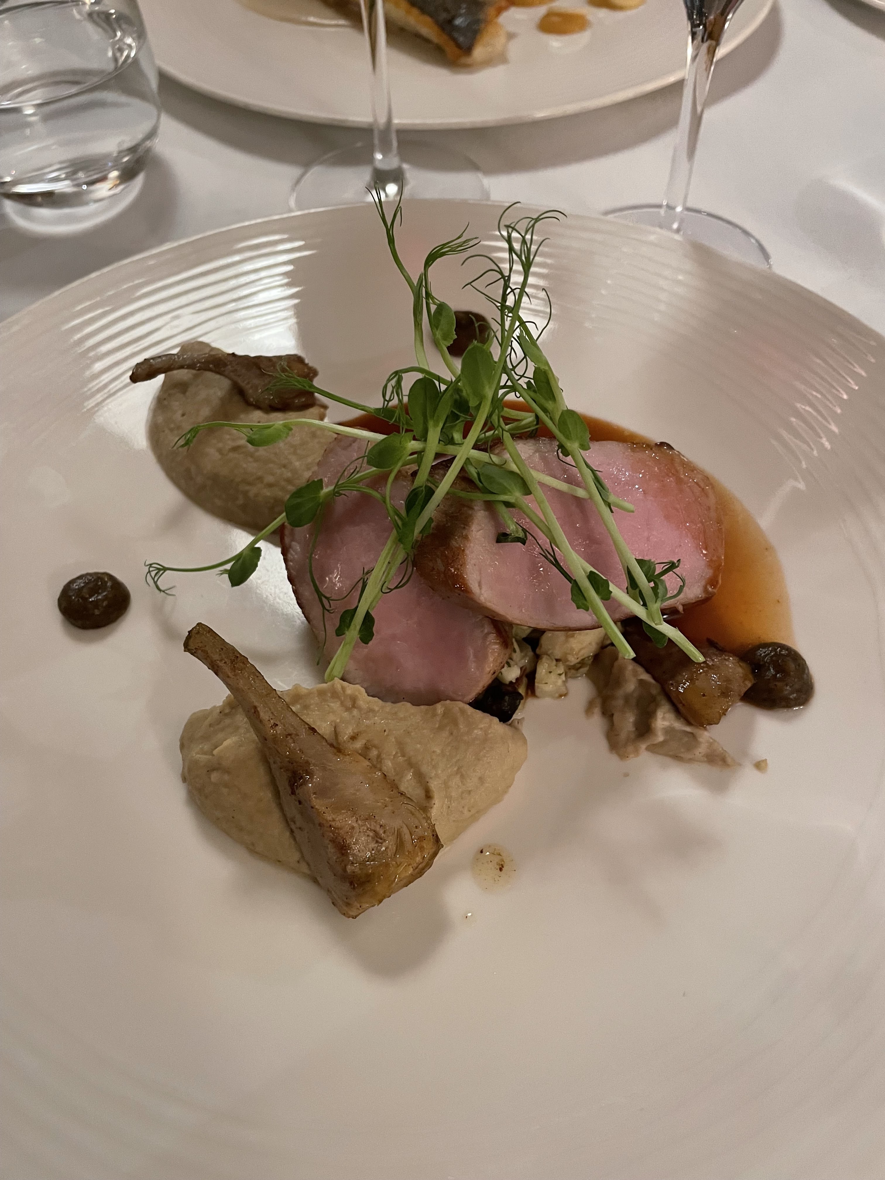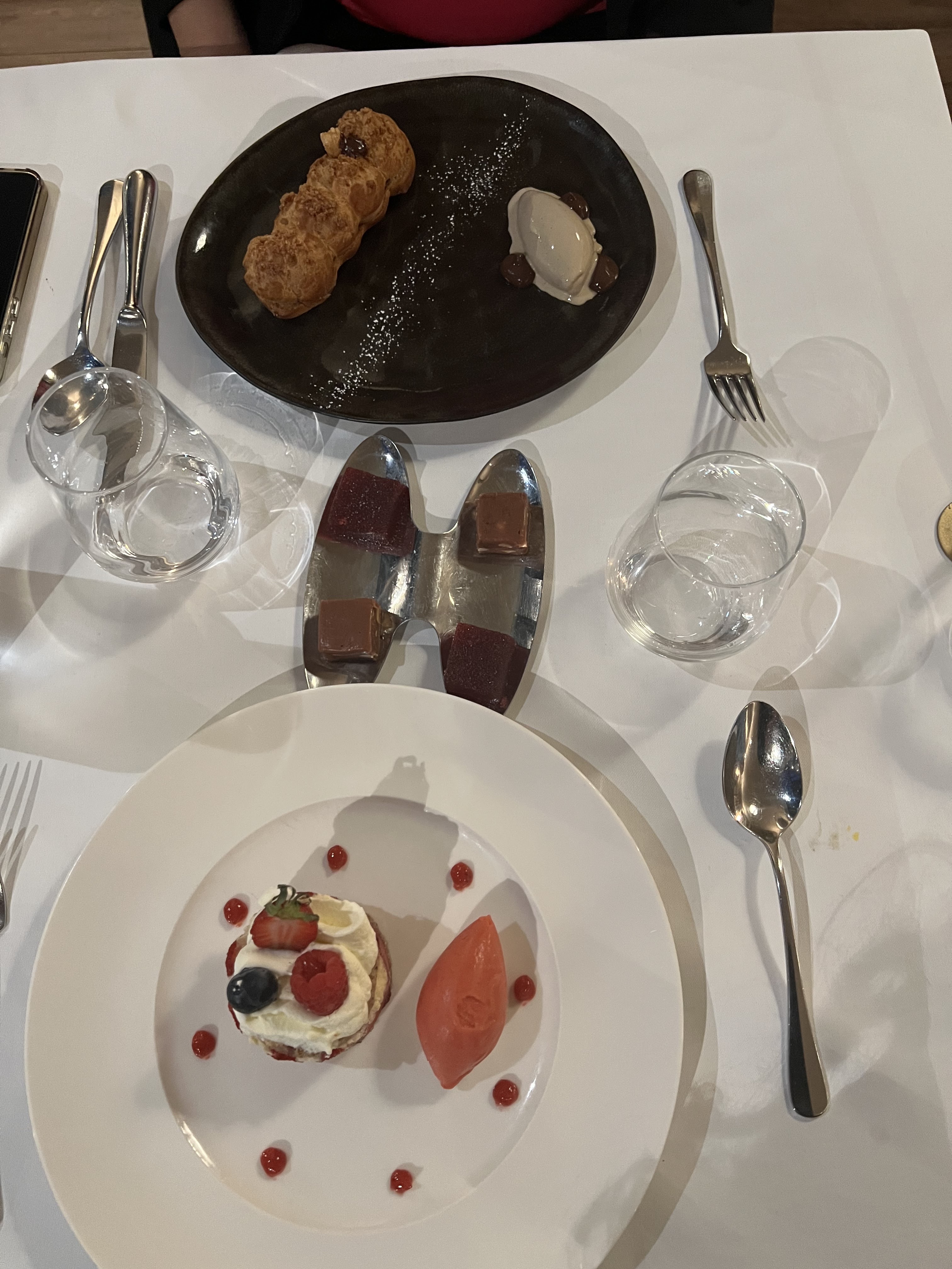 Pour commencer nous avons eu des amuses bouches délicieux, des crémeux de chou rouge, betterave et miso pousse de radis. Ensuite des entrées avec des coupes de champagnes, encore une fois très très bonnes. Des oeufs mollets et une entrée avocat et fruits de mer. En plats on a testé le porc (très bonne viande mais la purée à côté était un peu trop sucrée a notre goût), la pintade, très très bonne, le filet de boeuf saignant ( vraiment incroyable, un peu plus cher mais chaque bouchées en valait la peine, meilleur saignant), ainsi que le poisson que je n'ai pas goûté mais qu'on m'a dit était irréprochable avec une superbe cuisson. Finalement en dessert on a eu droit au cigare chocolat, vraiment incroyable et savoureux, au Dôme chocolat blanc, encore une fois irréprochable avec l'acidité des fruits Rouge qui contrasté très bien avec la glace et le biscuit a la pistache. Le paris Brest qui était très bon mais en comparaison aux autres manqué d'originalité à mon goût. Le Citron était aussi très très bon, ma grand mère l'a mange en 2 minute tellement elle a aimé. Les compléments aux desserts était une très très bonne surprise et les pâtes de fruits étaient excellentes ainsi que les sablés à la crème d'orange sanguine. Finalement le vin était tout aussi excellent (Ancienne Mercerie, Faugères). Le service était presque irréprochable, et le prix en revenait à 85€ par personne.