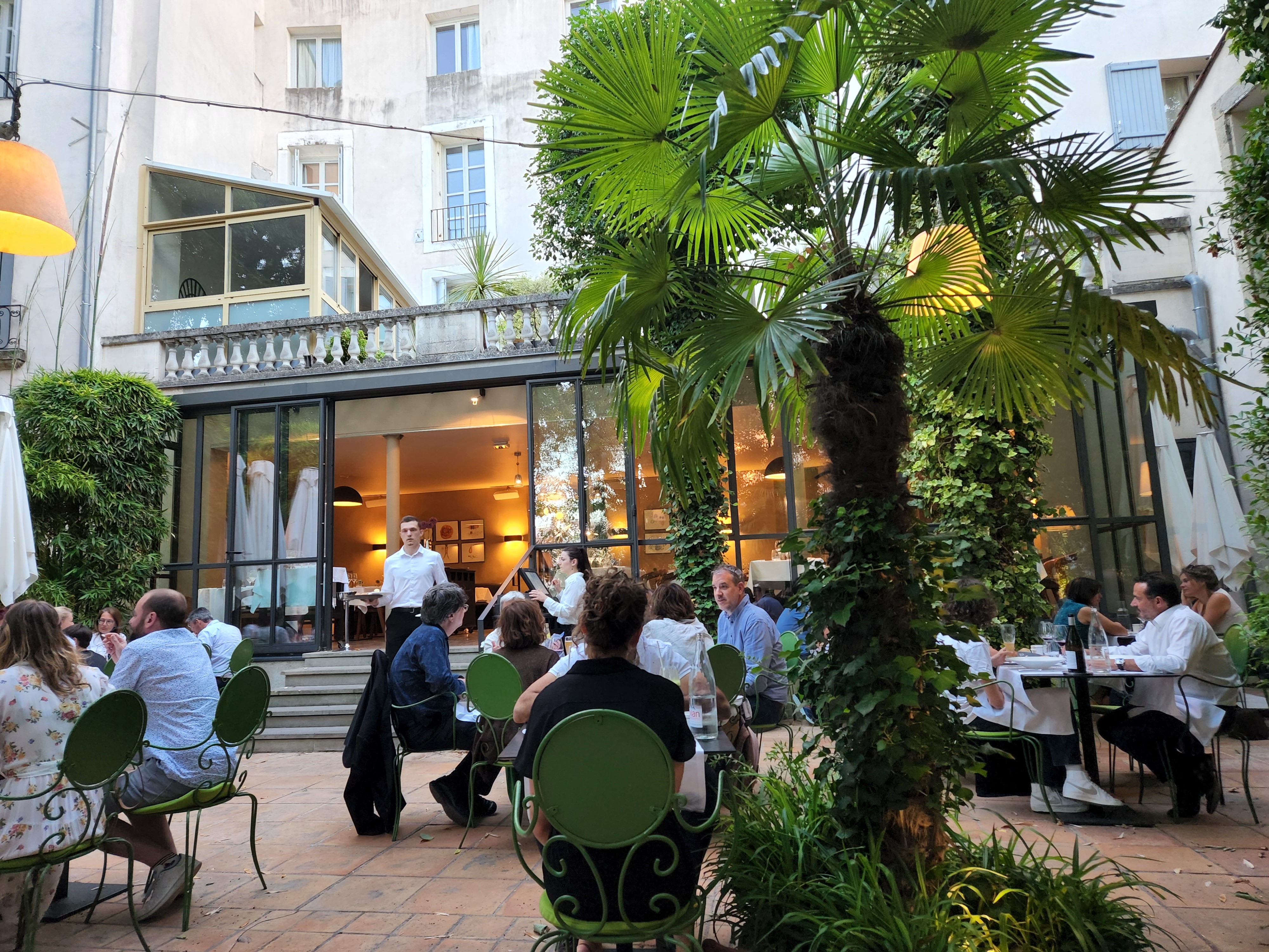 En somme ce restaurant vous offrira un cadre assez exceptionnel dans une atmosphère détendue et pas trop pompante au cœur de Montpellier. La nourriture est bonne et je recommanderais cet endroit notamment aux gros mangeurs et il reste accessible en terme de prix. Personnellement, c’était malheureusement trop copieux et il y avait - selon moi - un leger manque d’équilibre dans les textures. Nous avons eu le droit au menu de saison avec un amuse bouche delicieux (velouté de marrons), en entrée la tarte à l’oignon était savoureuse et sucrée mais la base de la tarte était trop fine et pas assez croustillante pour contre balancer le reste assez mou. Le reste était bon autrement. Les desserts étaient délicieux et généreux, mais des parts beaucoup trop volumineuses pour terminer le repas.