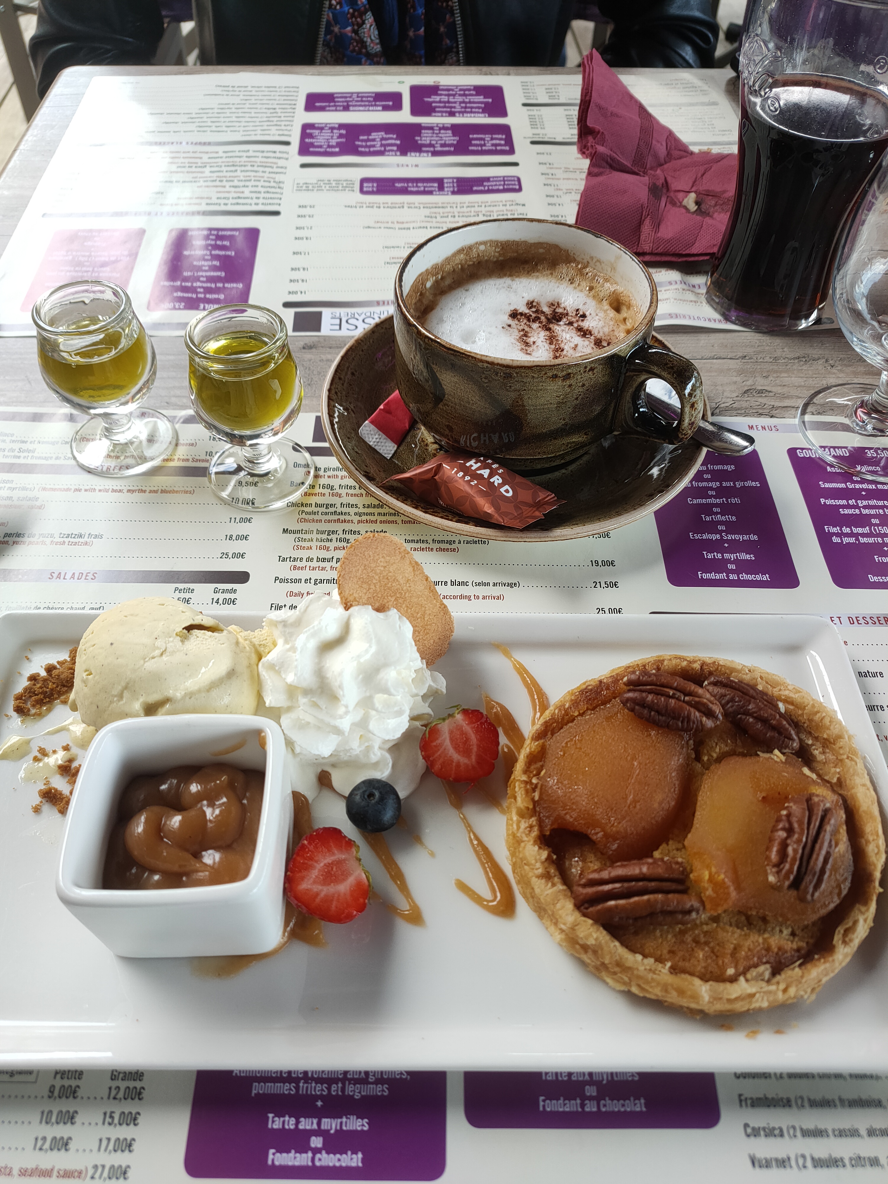 ce restaurant est un piège à touristes. le jambon cru était inmangeable car filandreux. les prix excessifs pour une nourriture banale. une sauce d'accompagnement du poulet à 7,50. un café renversé sur la cuisse bon ça arrive, et à 10 jours que je pensais offert à 4 euros. préférez le restaurant la marmotte juste au dessus.