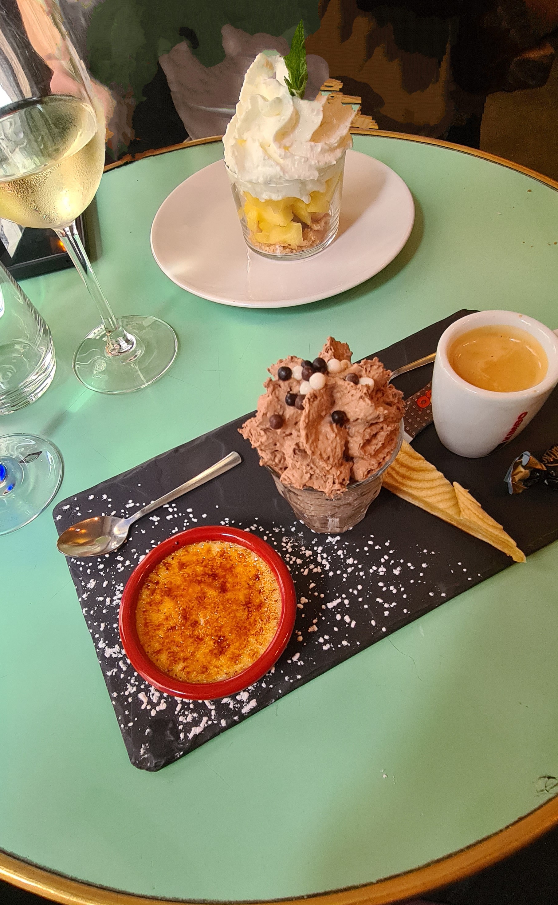 Le point fort était le propriétaire qui dirigeait les lieux lui-même. Le service était incroyable, tout comme la nourriture et les boissons. Le plateau de desserts composés a été un moment fort pour essayer la crème brûlée, la mousse au chocolat et la tarte aux pommes. Nous avons eu le steak frites et le risotto et du bon vin blanc. Si vous allez dîner à un endroit à Paris, ce devrait être celui-là.