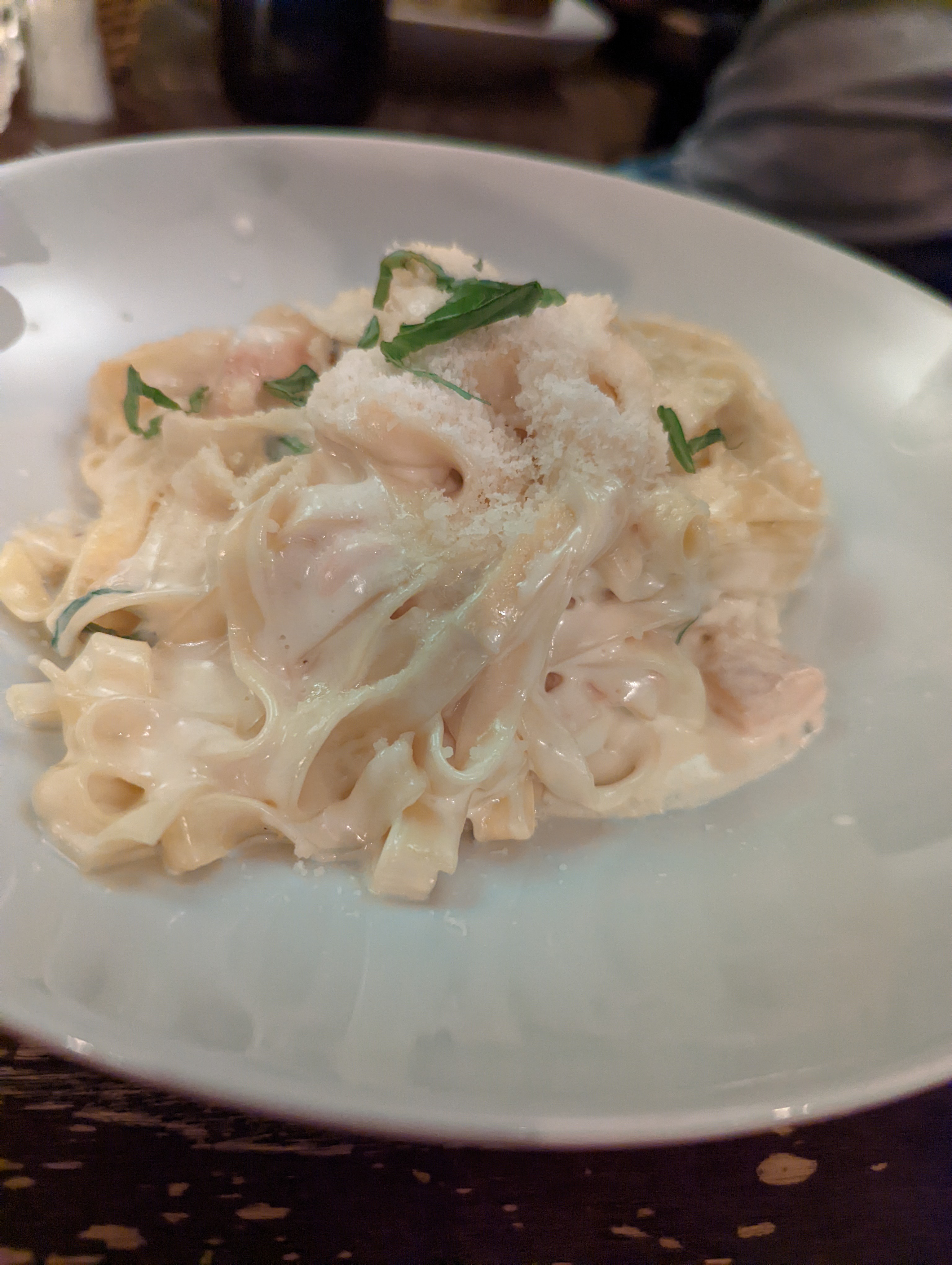 Très déçue en fait. Ni bon ni mauvais. L' accueil, le poisson, la salade verte et le vin, ok mais les tagiatelles au saumon, plat insipide. La tarte aux poires !! Froide, du surgelé de très moyenne qualité ( jusqu'à preuve du contraire). Je n'avais pas l'humeur guerrière samedi soir après un très bon film..je ne l'ai pas renvoyée . L'addition présentée dans un livre de poche SAS , le pire, pour mon mari !