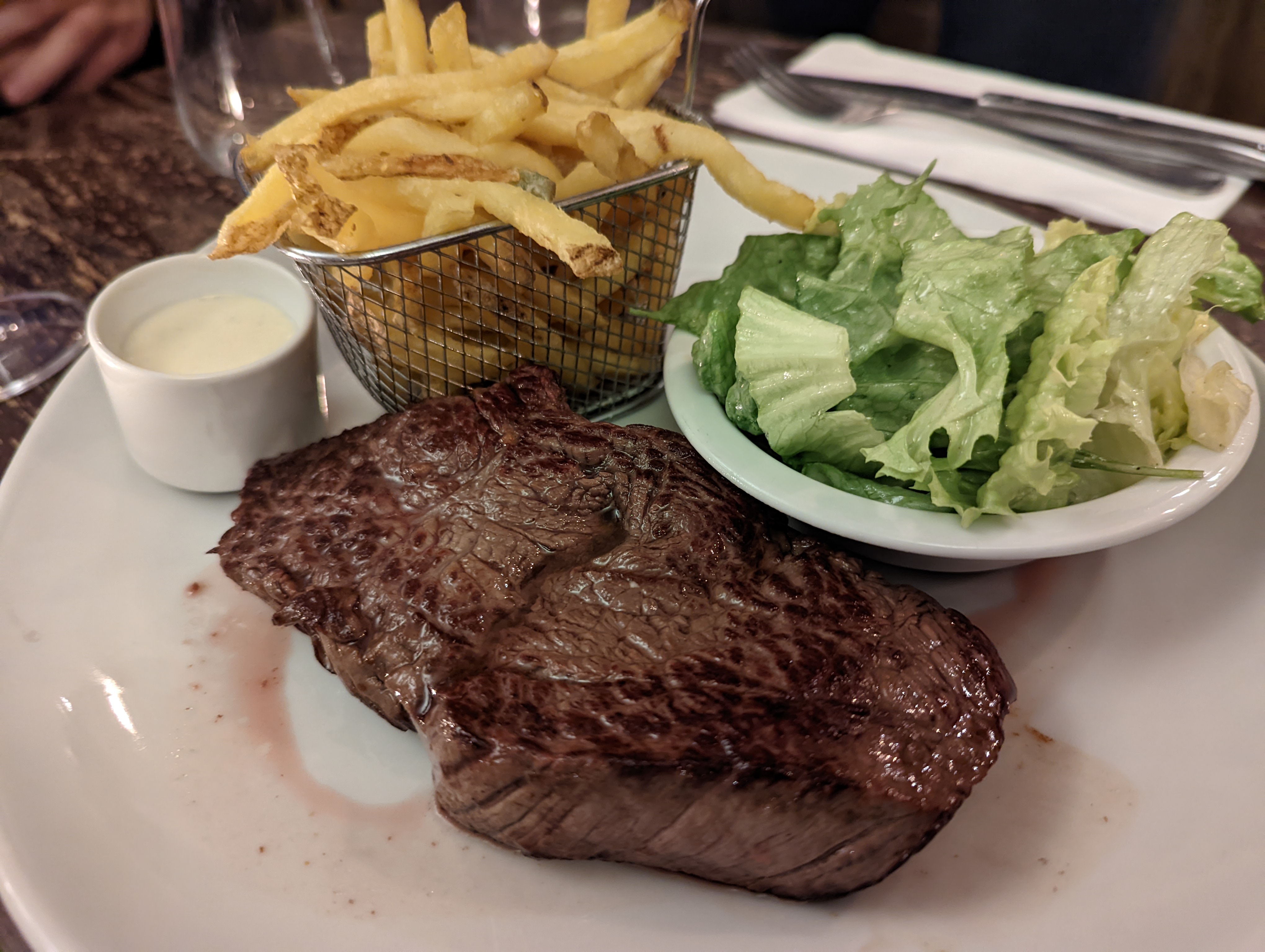 J'y suis allé deux fois pendant notre lune de miel. Le steak était excellent à chaque fois, le vin était excellent et le service était excellent. Je le recommande vivement pour une expérience de restaurant français authentique !