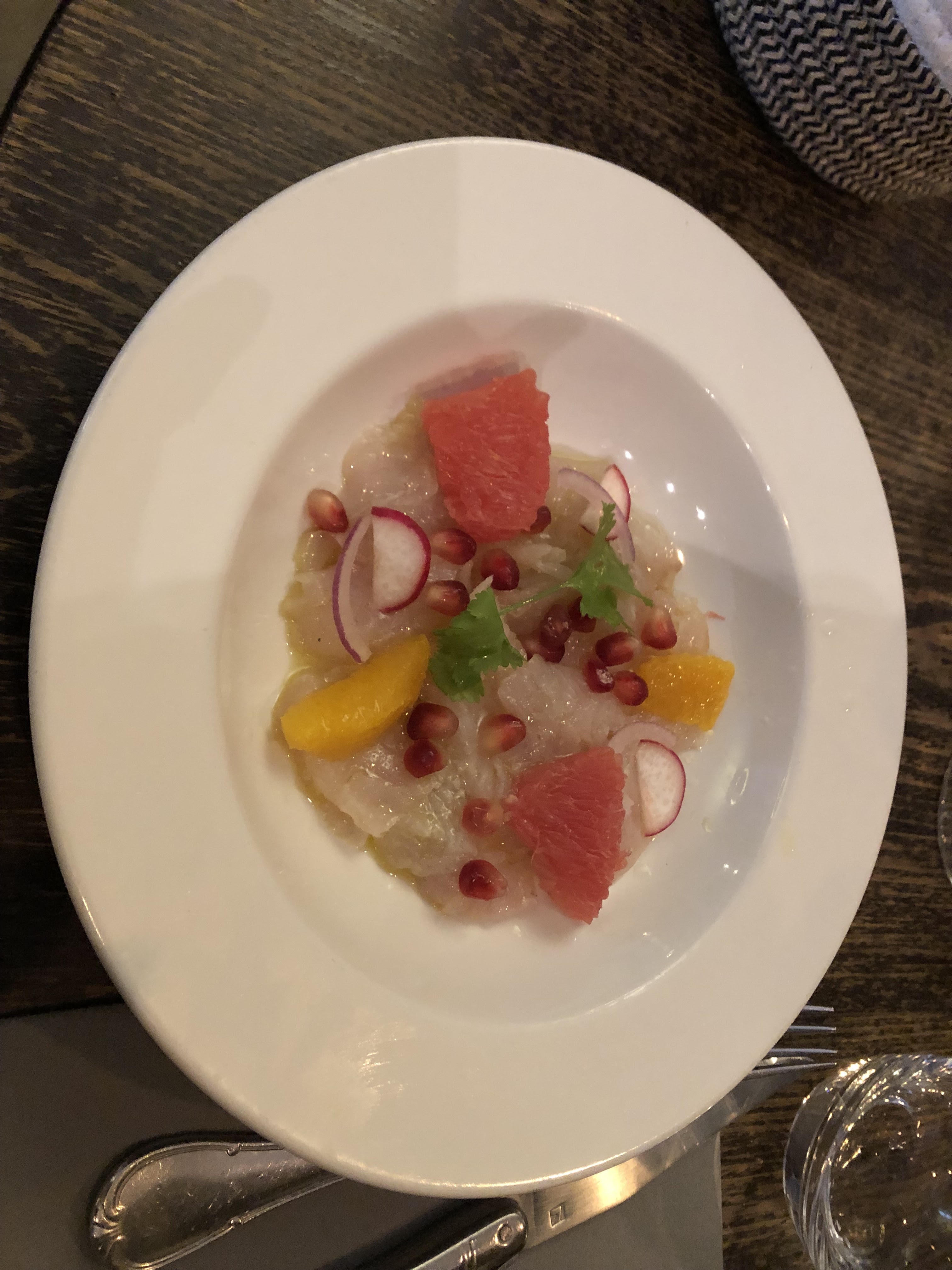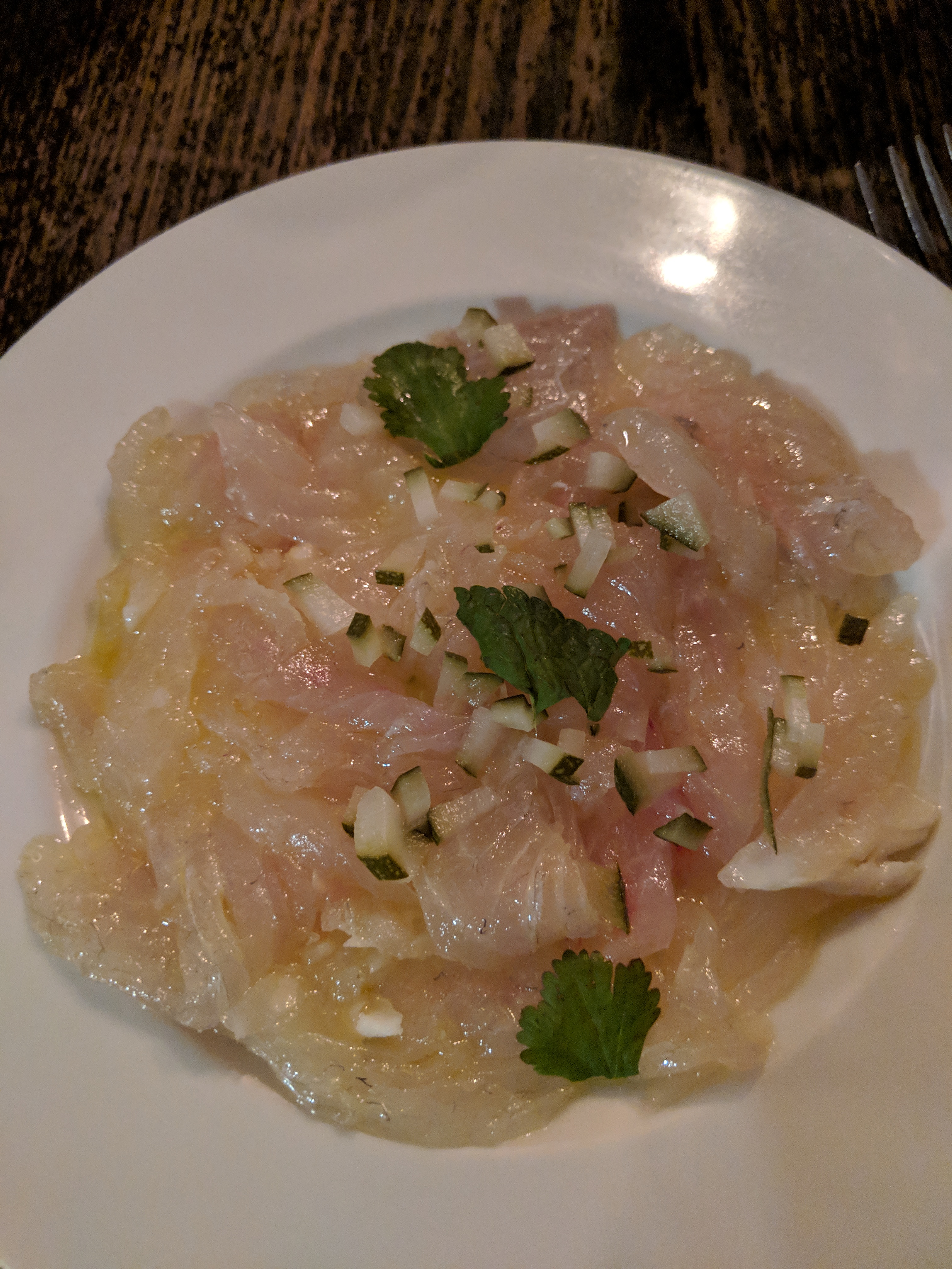 Désolé mais le tartare n était qu une boule de graisse mayonnaise sans aucun goût alors que le carpaccio de daurade, bien que baignant dans une huile ordinaire, donnait espoir de manger une cuisine savoureuse. Une fois mais pas 2