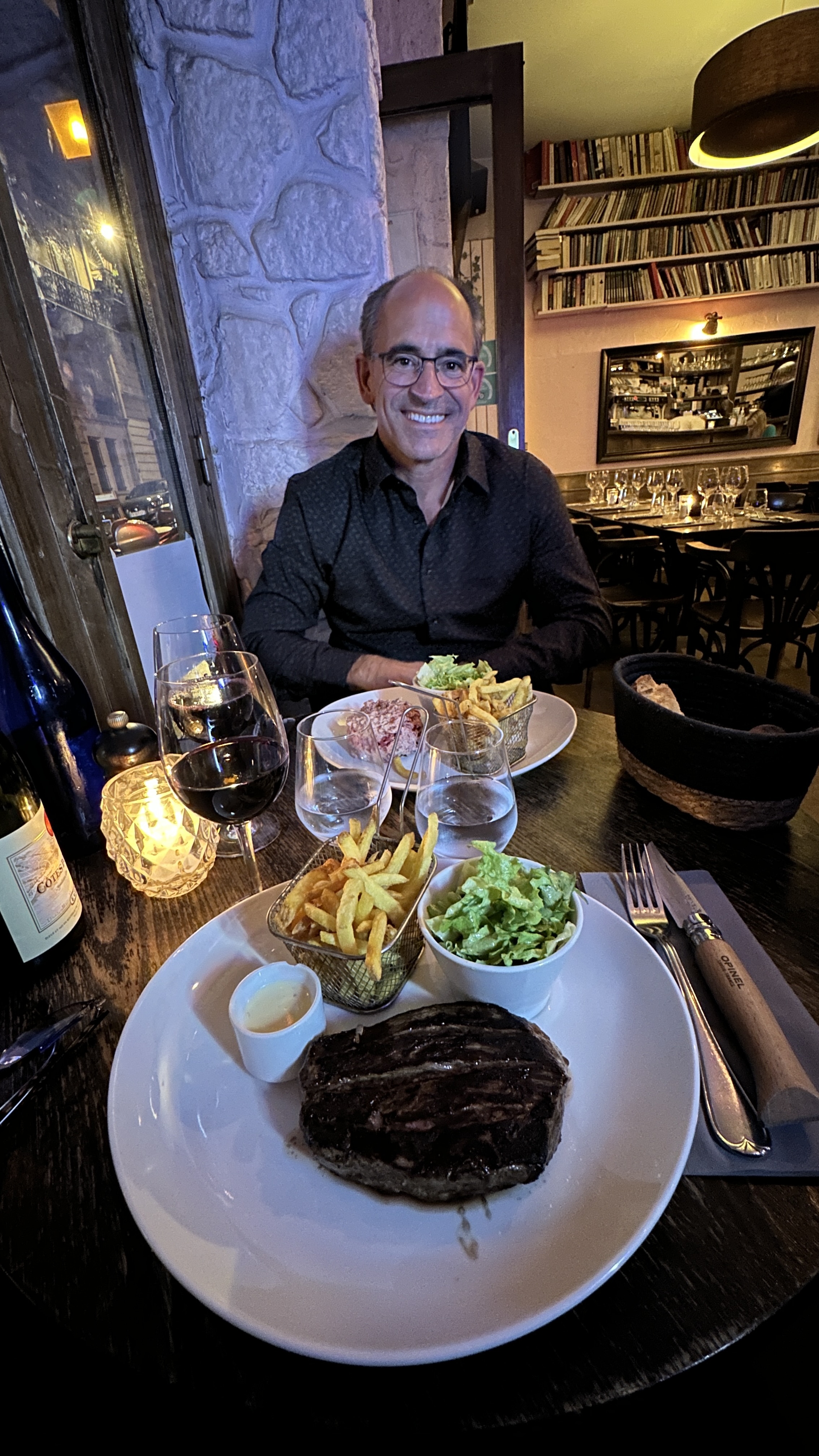 Très bel endroit, avec du cachet et une âme Le service est parfait, rapide et précis Le rumsteck parfaitement cuit à ma demande Le verre de Bourgueil bien sélectionné J'ai remarqué également une attention particulière sur le choix du pain Le seul truc que je pourrai critiquer c'est la sauce roquefort, trop classique à mon goût, ça manque de saveur .. mais c'est vraiment pour critiquer parceque c'est une très belle adresse Je recommande 👍