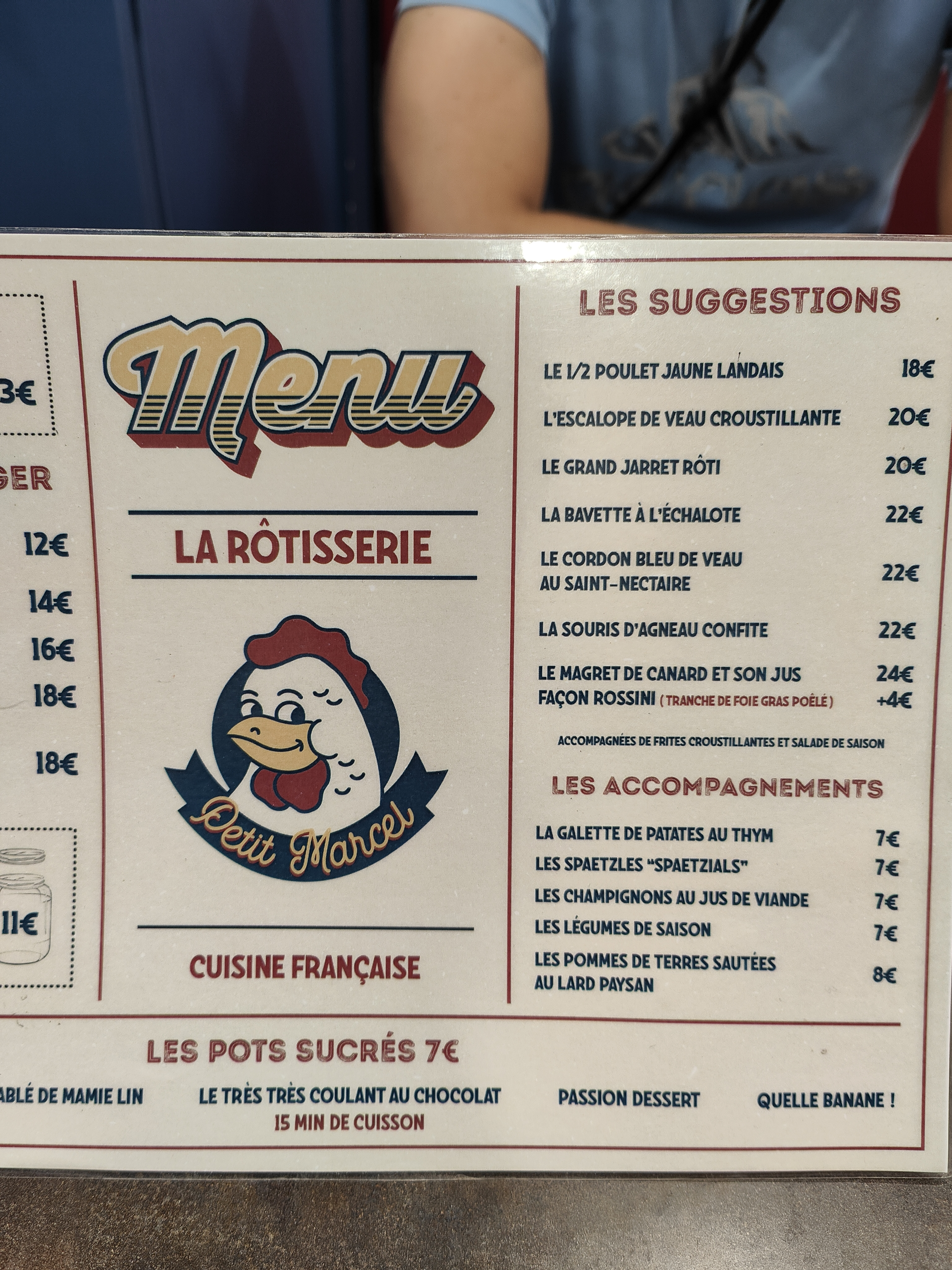 Pour celles et ceux qui connaissent déjà la sandwicherie du Petit Marcel, vous n'êtes pas sans savoir que tout est parti de ce petit resto, qui s'appelait alors Plume. Depuis l'apparence visuelle de l'enseigne a changé mais les fondamentaux qui sont l'ADN du petit Marcel restent intacts. Vous trouverez toute une gamme de plats de viandes cuits à la perfection. J'y suis passé trois fois récemment et à diverses occasions : - Pour un repas du soir, je me suis laissé tenter par leur souris d'agneau confite. Merveilleusement cuite et fondantr, avec un jus à tomber par terre, servie avec des frites délicieusement croustillantes. Elles sont accompagnées de sauces maison que vous reconnaîtrez si vous avez déjà mangé à la sandwicherie : ketchup de poivron, bearnaise, mayo au poivre, et leur merveilleuse sauce vietnamienne, sucrée salée à la coriandre. Ma conjointe a quant à elle choisi la salade tomate mozza, très savoureuse et bien présentée. Même si nous sommes dans une rôtisserie, c'est très sympa de penser quand même à des clients végétariens ! Attention plus que louable. - Un autre soir avec un ami, j'ai enfin goûté leurs rillettes de poulet : c'est maison, c'est frais, avec des vrais bons morceaux de poulet et du fromage frais, avec un pain bien croustillant, du gros sel et des oignons frits à mettre par-dessus. Une belle mise en bouche complétée par un bon pinot noir. Pour la suite, j'ai choisi le cordon bleu de veau, que j'ai déjà commandé plusieurs fois à emporter. Dès qu'il arrive à table, on sent cette bonne odeur de chapelure frite, qui douce au nez (et qui ne sent pas le graillon) et qui fait immédiatement saliver. Et quand on le coupe, le saint nectaire dégouline dans l'assiette comme un fondant au chocolat. Le meilleur cordon bleu des alentours, sans contredit possible. Au dessert, pour rester dans le thème, un délicieux coulant au chocolat, riche et gourmand. - Pour un déjeuner j'ai hésité entre la suggestion du jour (qui semblait délicieuse : un risotto aux truffes d'été avec une crème de mascarpone montée au citron et évidemment du parmesan) et le jarret de porc. J'opte pour la deuxième possibilité, et c'est du niveau de la souris : fondant, juteux, peau caramélisée et un jus de viande à tomber. Copieux et presque hallucinogène par ce cagnard. Du point de vue du service, rien à redire : les serveuses ont été agréables et professionnelles, avec peut-être un léger bémol pour un verre de vin arrivé en moitié de mon plat. Mais je n'en tiens pas rigueur, ce sont des choses qui arrivent. Vous l'aurez compris, ce restaurant est l'une des adresses les plus en vogue de Mulhouse, et c'est mérité : un restaurant où tout est fait maison, et où on a le sentiment de ne pas être pris pour des jambons. Je vous le recommande donc plus que chaudement.
